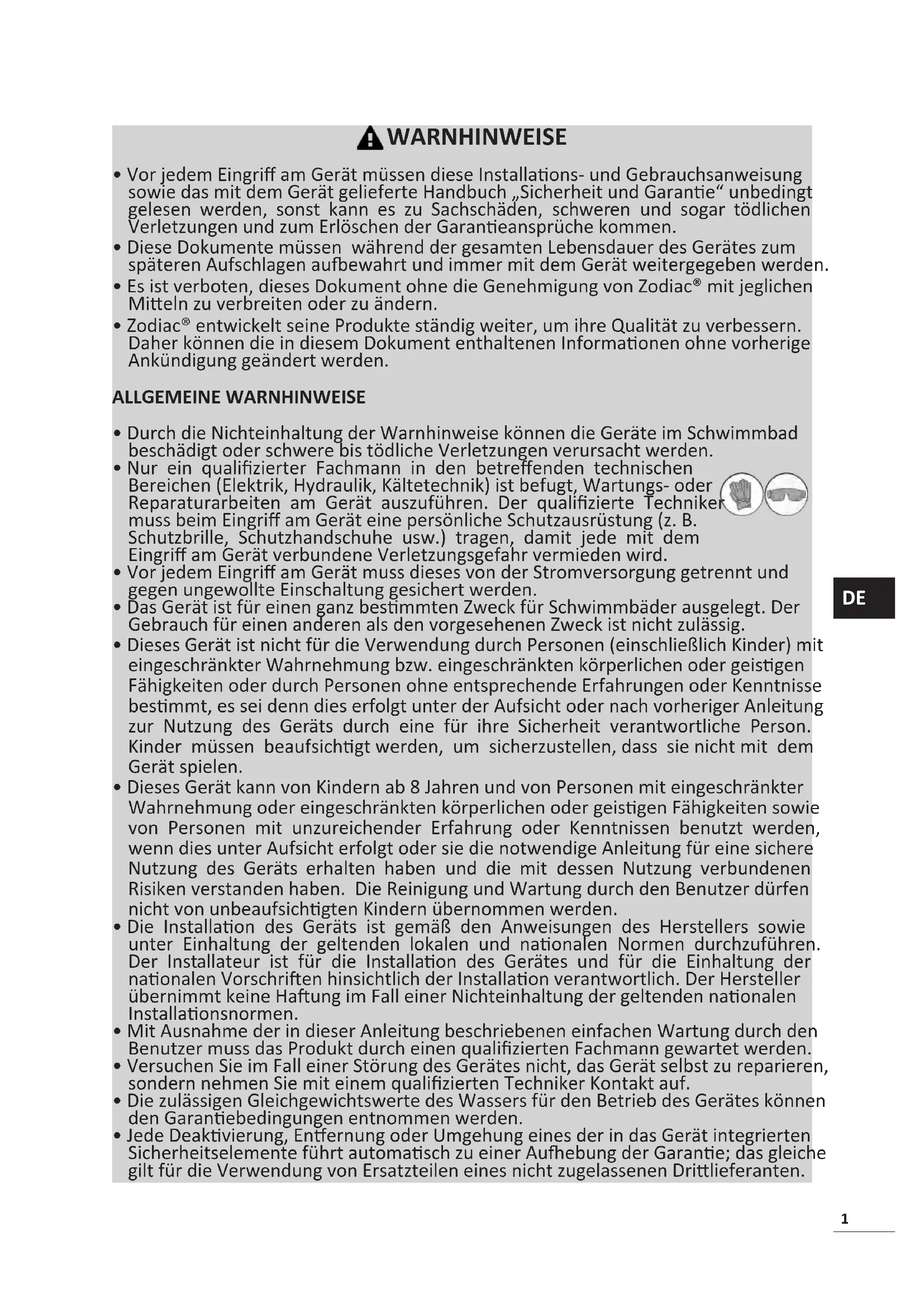 - Zodiac® entwickelt seine Produkte ständig weiter, um ihre Qualität zu verbessern. Daher können die in diesem Dokument enthaltenen Informaonen ohne vorherige Ankündigung geändert werden. ALLGEMEINE WARNHINWEISE