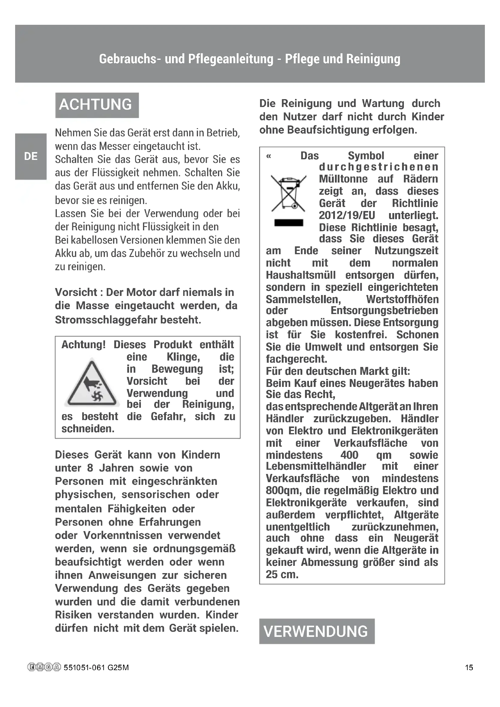 Nehmen Sie das Gerät erst dann in Betrieb, wenn das Messer eingetaucht ist. Schalten Sie das Gerät aus, bevor Sie es aus der Flüssigkeit nehmen. Schalten Sie das Gerät aus und entfernen Sie den Akku, bevor sie es reinigen. Lassen Sie bei der Verwendung oder bei der Reinigung nicht Flüssigkeit in den Bei kabellosen Versionen klemmen Sie den Akku ab, um das Zubehör zu wechseln und zu reinigen. Vorsicht : Der Motor darf niemals in die Masse eingetaucht werden, da Stromsschlaggefahr besteht. Achtung! Dieses Produkt enthält eine Klinge, die in Bewegung ist; Vorsicht bei der Verwendung und bei der Reinigung, es besteht die Gefahr, sich zu schneiden. Dieses Gerät kann von Kindern unter 8 Jahren sowie von Personen mit eingeschränkten physischen, sensorischen oder mentalen Fähigkeiten oder Personen ohne Erfahrungen oder Vorkenntnissen verwendet werden, wenn sie ordnungsgemäß beaufsichtigt werden oder wenn ihnen Anweisungen zur sicheren Verwendung des Geräts gegeben wurden und die damit verbundenen Risiken verstanden wurden. Kinder dürfen nicht mit dem Gerät spielen. Die Reinigung und Wartung durch den Nutzer darf nicht durch Kinder ohne Beaufsichtigung erfolgen. « Das Symbol einer durchgestrichenen Mülltonne auf Rädern zeigt an, dass dieses Gerät der Richtlinie 2012/19/EU unterliegt. Diese Richtlinie besagt, dass Sie dieses Gerät am Ende seiner Nutzungszeit nicht mit dem normalen Haushaltsmüll entsorgen dürfen, sondern in speziell eingerichteten Sammelstellen, Wertstoffhöfen oder Entsorgungsbetrieben abgeben müssen. Diese Entsorgung ist für Sie kostenfrei. Schonen Sie die Umwelt und entsorgen Sie fachgerecht. Für den deutschen Markt gilt: Beim Kauf eines Neugerätes haben Sie das Recht, das entsprechende Altgerät an Ihren Händler zurückzugeben. Händler von Elektro und Elektronikgeräten mit einer Verkaufsäche von mindestens 400 qm sowie Lebensmittelhändler mit einer Verkaufsäche von mindestens 800qm, die regelmäßig Elektro und Elektronikgeräte verkaufen, sind außerdem verpichtet, Altgeräte unentgeltlich zurückzunehmen, auch ohne dass ein Neugerät gekauft wird, wenn die Altgeräte in keiner Abmessung größer sind als 25 cm. VERWENDUNG Gebrauchs- und Pflegeanleitung - Pflege und Reinigung