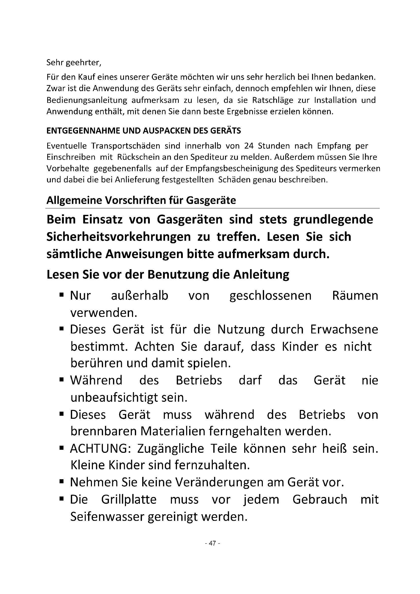 Eventuelle Transportschäden sind innerhalb von 24 Stunden nach Empfang per Einschreiben mit Rückschein an den Spediteur zu melden. Außerdem müssen Sie Ihre Vorbehalte gegebenenfalls auf der Empfangsbescheinigung des Spediteurs vermerken und dabei die bei Anlieferung festgestellten Schäden genau beschreiben. Allgemeine Vorschriften für Gasgeräte Beim Einsatz von Gasgeräten sind stets grundlegende Sicherheitsvorkehrungen zu treffen. Lesen Sie sich sämtliche Anweisungen bitte aufmerksam durch. Lesen Sie vor der Benutzung die Anleitung