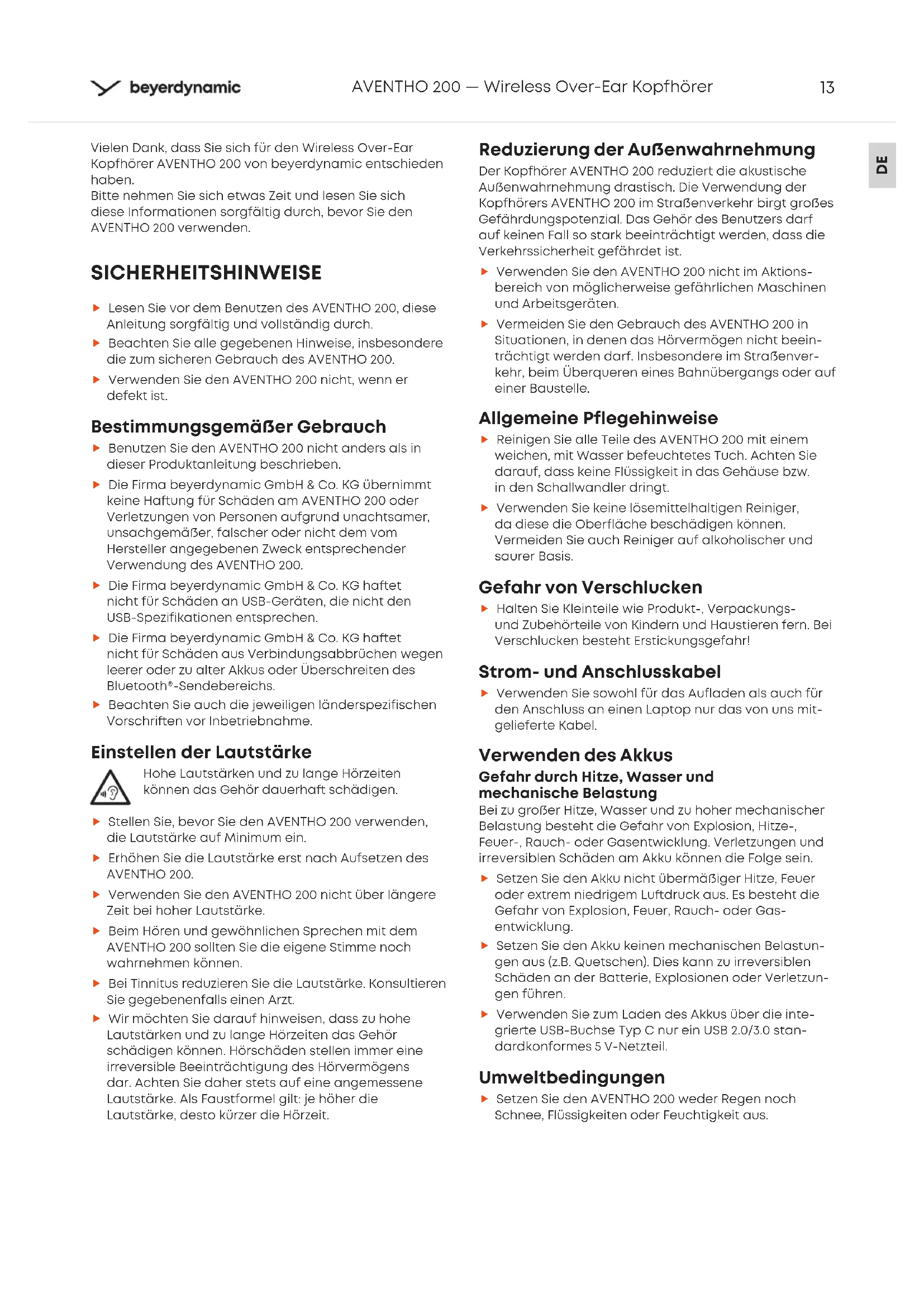 AVENTHO 200 — Wireless Over-Ear Kopfhörer Vielen Dank, dass Sie sich für den Wireless Over-Ear Kopfhörer AVENTHO 200 von beyerdynamic entschieden haben. Bitte nehmen Sie sich etwas Zeit und lesen Sie sich diese Informationen sorgfältig durch, bevor Sie den AVENTHO 200 verwenden. SICHERHEITSHINWEISE Lesen Sie vor dem Benutzen des AVENTHO 200, diese Anleitung sorgfältig und volländig durch. Beachten Sie alle gegebenen Hinweise, insbesondere die zum sicheren Gebrauch des AVENTHO 200. Verwenden Sie den AVENTHO 200 nicht, wenn er defekt i. Beimmungsgemäßer Gebrauch Benutzen Sie den AVENTHO 200 nicht anders als in dieser Produktanleitung beschrieben. Die Firma beyerdynamic GmbH & Co. KG übernimmt keine Haung für Schäden am AVENTHO 200 oder Verletzungen von Personen aufgrund unachtsamer, unsachgemäßer, falscher oder nicht dem vom Hereller angegebenen Zweck entsprechender Verwendung des AVENTHO 200. Die Firma beyerdynamic GmbH & Co. KG haet nicht für Schäden an USB-Geräten, die nicht den USB-Spezifikationen entsprechen. Die Firma beyerdynamic GmbH & Co. KG haet nicht für Schäden aus Verbindungsabbrüchen wegen leerer oder zu alter Akkus oder Überschreiten des Bluetooth®-Sendebereichs. Beachten Sie auch die jeweiligen länderspezifischen Vorschrien vor Inbetriebnahme. Einellen der Lautärke Hohe Lautärken und zu lange Hörzeiten können das Gehör dauerha schädigen. Stellen Sie, bevor Sie den AVENTHO 200 verwenden, die Lautärke auf Minimum ein. Erhöhen Sie die Lautärke er nach Aufsetzen des AVENTHO 200. Verwenden Sie den AVENTHO 200 nicht über längere Zeit bei hoher Lautärke. Beim Hören und gewöhnlichen Sprechen mit dem AVENTHO 200 sollten Sie die eigene Stimme noch wahrnehmen können. Bei Tinnitus reduzieren Sie die Lautärke. Konsultieren Sie gegebenenfalls einen Arzt. Wir möchten Sie darauf hinweisen, dass zu hohe Lautärken und zu lange Hörzeiten das Gehör schädigen können. Hörschäden ellen immer eine irreversible Beeinträchtigung des Hörvermögens dar. Achten Sie daher ets auf eine angemessene Lautärke. Als Fauformel gilt: je höher die Lautärke, deo kürzer die Hörzeit. Reduzierung der Außenwahrnehmung Der Kopfhörer AVENTHO 200 reduzie die akuische Außenwahrnehmung draisch. Die Verwendung der Kopfhörers AVENTHO 200 im Straßenverkehr birgt großes Gefährdungspotenzial. Das Gehör des Benutzers da auf keinen Fall so ark beeinträchtigt werden, dass die Verkehrssicherheit gefährdet i. Verwenden Sie den AVENTHO 200 nicht im Aktions- bereich von möglicherweise gefährlichen Maschinen und Arbeitsgeräten. Vermeiden Sie den Gebrauch des AVENTHO 200 in Situationen, in denen das Hörvermögen nicht beein- trächtigt werden da. Insbesondere im Straßenver- kehr, beim Überqueren eines Bahnübergangs oder auf einer Bauelle. Allgemeine Pflegehinweise Reinigen Sie alle Teile des AVENTHO 200 mit einem weichen, mit Wasser befeuchtetes Tuch. Achten Sie darauf, dass keine Flüssigkeit in das Gehäuse bzw. in den Schallwandler dringt. Verwenden Sie keine lösemittelhaltigen Reiniger, da diese die Obeläche beschädigen können. Vermeiden Sie auch Reiniger auf alkoholischer und saurer Basis. Gefahr von Verschlucken Halten Sie Kleinteile wie Produkt-, Verpackungs- und Zubehöeile von Kindern und Hauieren fern. Bei Verschlucken beeht Erickungsgefahr! Strom- und Anschlusskabel Verwenden Sie sowohl für das Aufladen als auch für den Anschluss an einen Laptop nur das von uns mit- geliefee Kabel. Verwenden des Akkus Gefahr durch Hitze, Wasser und mechanische Belaung Bei zu großer Hitze, Wasser und zu hoher mechanischer Belaung beeht die Gefahr von Explosion, Hitze-, Feuer-, Rauch- oder Gasentwicklung. Verletzungen und irreversiblen Schäden am Akku können die Folge sein. Setzen Sie den Akku nicht übermäßiger Hitze, Feuer oder extrem niedrigem Ludruck aus. Es beeht die Gefahr von Explosion, Feuer, Rauch- oder Gas- entwicklung. Setzen Sie den Akku keinen mechanischen Belaun- gen aus (z.B. Quetschen). Dies kann zu irreversiblen Schäden an der Batterie, Explosionen oder Verletzun- gen führen. Verwenden Sie zum Laden des Akkus über die inte- griee USB-Buchse Typ C nur ein USB 2.0/3.0 an- dardkonformes 5 V-Netzteil. Umweltbedingungen Setzen Sie den AVENTHO 200 weder Regen noch Schnee, Flüssigkeiten oder Feuchtigkeit aus.14