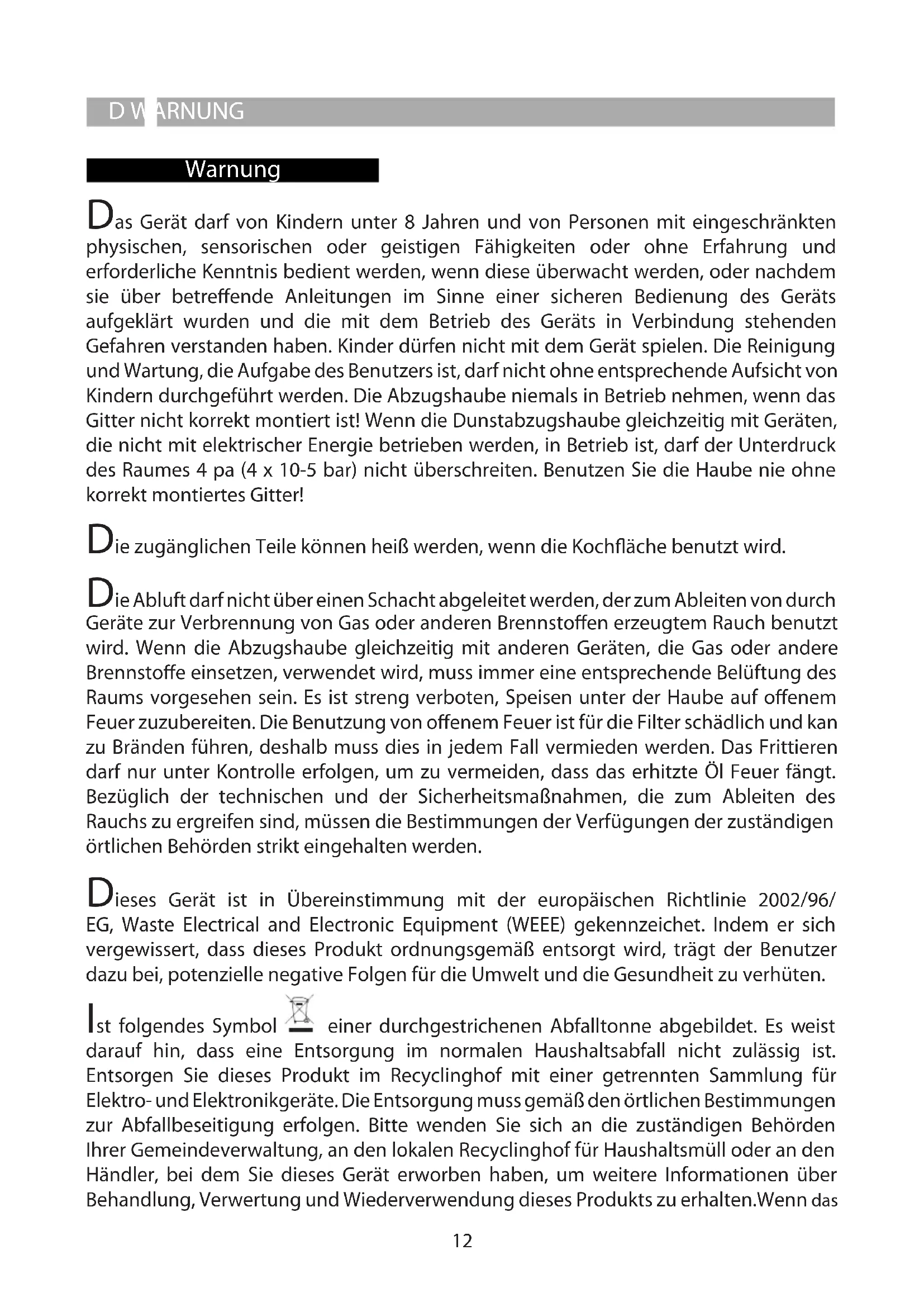 Warnung D WARNUNG Das Gerät darf von Kindern unter 8 Jahren und von Personen mit eingeschränkten physischen, sensorischen oder geistigen Fähigkeiten oder ohne Erfahrung und erforderliche Kenntnis bedient werden, wenn diese überwacht werden, oder nachdem sie über betreende Anleitungen im Sinne einer sicheren Bedienung des Geräts aufgeklärt wurden und die mit dem Betrieb des Geräts in Verbindung stehenden Gefahren verstanden haben. Kinder dürfen nicht mit dem Gerät spielen. Die Reinigung und Wartung, die Aufgabe des Benutzers ist, darf nicht ohne entsprechende Aufsicht von Kindern durchgeführt werden. Die Abzugshaube niemals in Betrieb nehmen, wenn das Gitter nicht korrekt montiert ist! Wenn die Dunstabzugshaube gleichzeitig mit Geräten, die nicht mit elektrischer Energie betrieben werden, in Betrieb ist, darf der Unterdruck des Raumes 4 pa (4 x 10-5 bar) nicht überschreiten. Benutzen Sie die Haube nie ohne korrekt montiertes Gitter! Die zugänglichen Teile können heiß werden, wenn die Kochäche benutzt wird. Die Abluft darf nicht über einen Schacht abgeleitet werden, der zum Ableiten von durch Geräte zur Verbrennung von Gas oder anderen Brennstoen erzeugtem Rauch benutzt wird. Wenn die Abzugshaube gleichzeitig mit anderen Geräten, die Gas oder andere Brennstoe einsetzen, verwendet wird, muss immer eine entsprechende Belüftung des Raums vorgesehen sein. Es ist streng verboten, Speisen unter der Haube auf oenem Feuer zuzubereiten. Die Benutzung von oenem Feuer ist für die Filter schädlich und kan zu Bränden führen, deshalb muss dies in jedem Fall vermieden werden. Das Frittieren darf nur unter Kontrolle erfolgen, um zu vermeiden, dass das erhitzte Öl Feuer fängt. Bezüglich der technischen und der Sicherheitsmaßnahmen, die zum Ableiten des Rauchs zu ergreifen sind, müssen die Bestimmungen der Verfügungen der zuständigen örtlichen Behörden strikt eingehalten werden. Dieses Gerät ist in Übereinstimmung mit der europäischen Richtlinie 2002/96/ EG, Waste Electrical and Electronic Equipment (WEEE) gekennzeichet. Indem er sich vergewissert, dass dieses Produkt ordnungsgemäß entsorgt wird, trägt der Benutzer dazu bei, potenzielle negative Folgen für die Umwelt und die Gesundheit zu verhüten. Ist folgendes Symbol einer durchgestrichenen Abfalltonne abgebildet. Es weist darauf hin, dass eine Entsorgung im normalen Haushaltsabfall nicht zulässig ist. Entsorgen Sie dieses Produkt im Recyclinghof mit einer getrennten Sammlung für Elektro- und Elektronikgeräte. Die Entsorgung muss gemäß den örtlichen Bestimmungen zur Abfallbeseitigung erfolgen. Bitte wenden Sie sich an die zuständigen Behörden Ihrer Gemeindeverwaltung, an den lokalen Recyclinghof für Haushaltsmüll oder an den Händler, bei dem Sie dieses Gerät erworben haben, um weitere Informationen über Behandlung, Verwertung und Wiederverwendung dieses Produkts zu erhalten.Wenn dasDWARNUNG Stromkabel beschädigt ist, muss es vom Hersteller, von einem technischen Hilfe- Center oder von einer anderen Person mit ähnlicher Qualikation ausgetauscht werden, um Gefahrensituationen zu vermeiden. Konsultieren Sie auch die Zeichnungen auf den ersten Seiten mit den Buchstaben- und Nummern, auf die im Erklärungstext Bezug genommen wird. Halten Sie sich strikt an die in diesem Handbuch gegebenen Anleitungen. Für eventuelle vom Gerät verursachte Unannehmlichkeiten, Schäden oder Brände, die sich aus der Nichteinhaltung der in diesem Handbuch gegebenen Anleitungen ergeben, wird jede Haftung abgelehnt. Es wird empfohlen, die Haube nicht an einer Wand zu befestigen, die das Gewicht nicht tragen kann, z.B. einer Rigipswand, und sie nicht in ein Möbelstück einzubauen. Die Küchenhaube muss in einem Abstand von mindestens 50 cm über einem Elektroherd und von mindestens 65 cm über einem Gasherd oder kombinierten Herd angebracht werden. Wenn die Installationsanweisungen der Gaskochgeräts einen größeren Abstand vorgeben, ist dieser zu berücksichtigen. Die Küchenhaubenmodelle,sindmit einer oberen Luftaustrittsönung B ausgestattet, um die angesaugten Dämpfe nach aussen abzuleiten (Abluftversion A – das Abluftrohr ist nicht mitgeliefert). Falls es nicht möglich sein sollte, die angesaugten Kochdämpfe nach aussen abzuleiten, kann das Gerät auch als Umlufthaube F verwendet werden. Dazu ist es notwendig, 1 Aktivkohlelter F zu montieren; so wird die angesaugte Luft ueber die Gitter G wieder in den Raum zurueckgefuehrt. Vergewissern Sie sich, dass sich in der Nähe der Haube eine Stromsteckdose bendet und dass die Anlage mit einem Dierential von 30 mA versehen ist. Die Netzspannung muss der auf der Datenplakette im Inneren der Haube angegebenen Spannung entsprechen. Die Haube hat ein 1250 mm langes Stromkabel mit oder ohne Stecker: Wenn es einen Stecker hat, schließen Sie die Haube an eine den geltenden Vorschriften entsprechende, in einem zugänglichen Bereich liegende Steckdose an, hat es keinen Stecker (direkter Netzanschluss), ist ein zweipoliger vorschriftsgemäßer Schalter mit einem Abstand von mindestens 3 mm zwischen den Kontakten (zugänglich) angebracht werden. Diese Installation und der Stromanschluss muss nach der technischen Vorschrift von einem spezialisierten Techniker ausgeführt werden. Wenn das Kochfeld in Betrieb ist, sollte die Abzugshaube immer zumindest mit der ersten Geschwindigkeitsstufe eingeschaltet sein. Leistungsfähigkeitstests des Produkts, durchgeführt in Übereinstimmung mit der EU- Verordnung Nr. 65/2014 – Ref.: IEC 61591 Die höchste Leistungsfähigkeit wird erreicht, wenn eventuell vorhandene Verkleidungsplatten geönet sind.