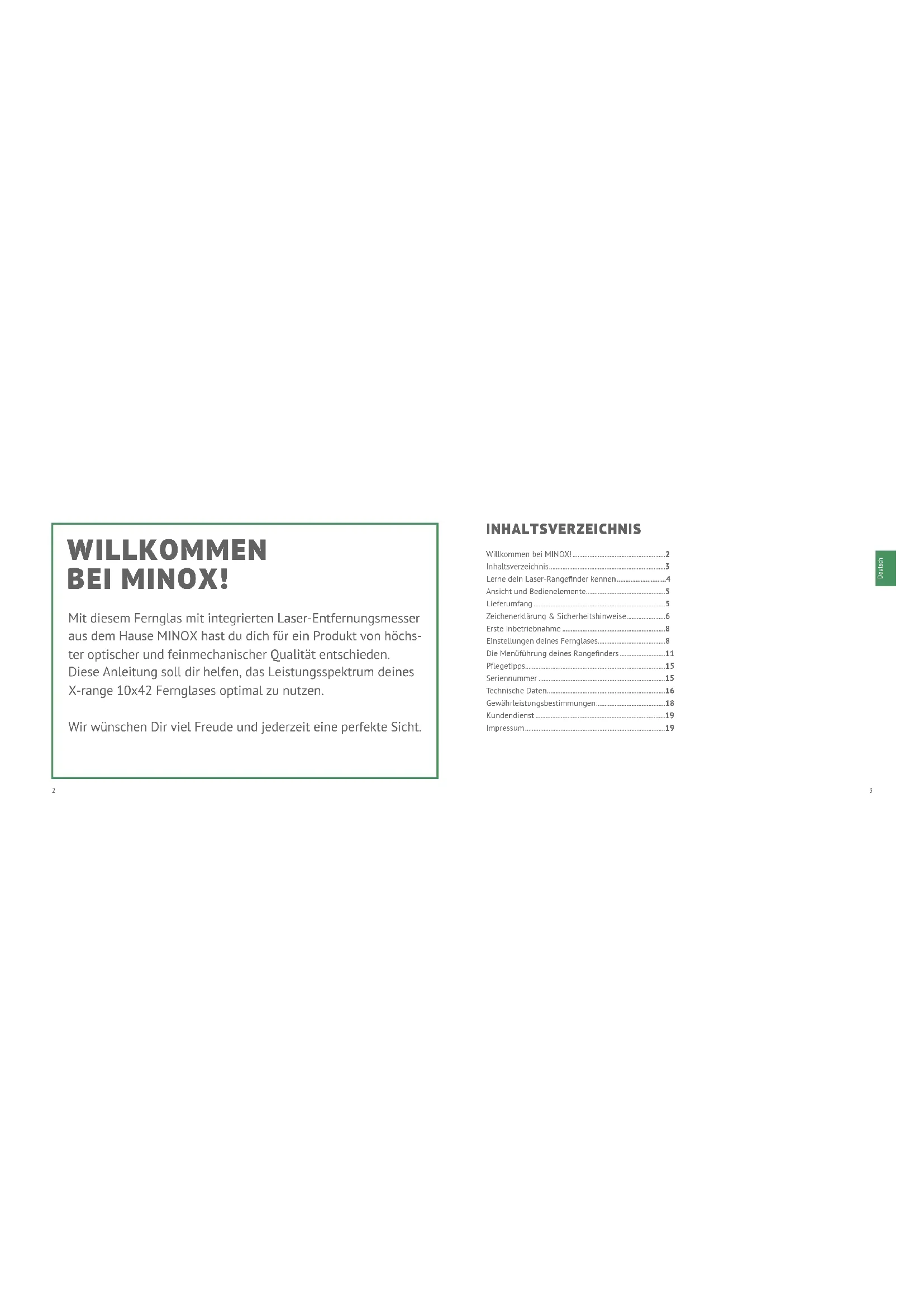 - INHALTSVERZEICHNIS WILLKOMMEN BEI MINOX! Mit diesem Fernglas mit integrierten Laser-Entfernungsmesser aus dem Hause MINOX hast du dich für ein Produkt von höchs- ter optischer und feinmechanischer Qualität entschieden. Diese Anleitung soll dir helfen, das Leistungsspektrum deines X-range 10x42 Fernglases optimal zu nutzen. Wir wünschen Dir viel Freude und jederzeit eine perfekte Sicht. Willkommen bei MINOX! p. 2