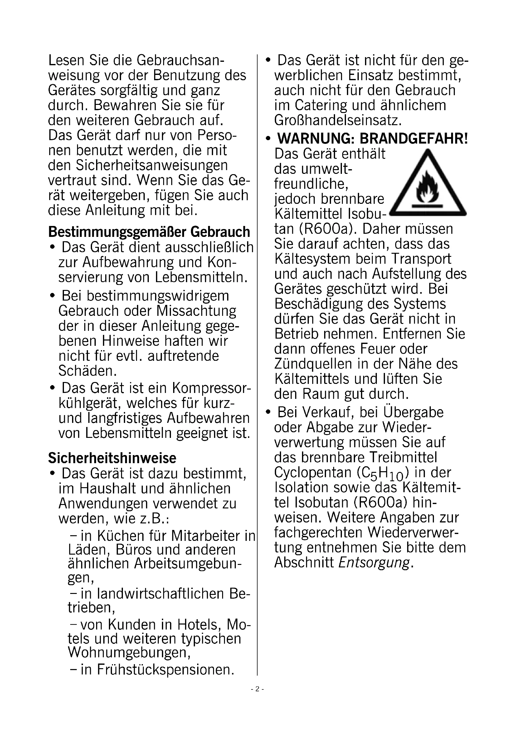 - WARNUNG: BRANDGEFAHR! Das Gerät enthält das umwelt- freundliche, jedoch brennbare Kältemittel Isobu- tan (R600a). Daher müssen Sie darauf achten, dass das Kältesystem beim Transport und auch nach Aufstellung des Gerätes geschützt wird. Bei Beschädigung des Systems dürfen Sie das Gerät nicht in Betrieb nehmen. Entfernen Sie dann offenes Feuer oder Zündquellen in der Nähe des Kältemittels und lüften Sie den Raum gut durch.