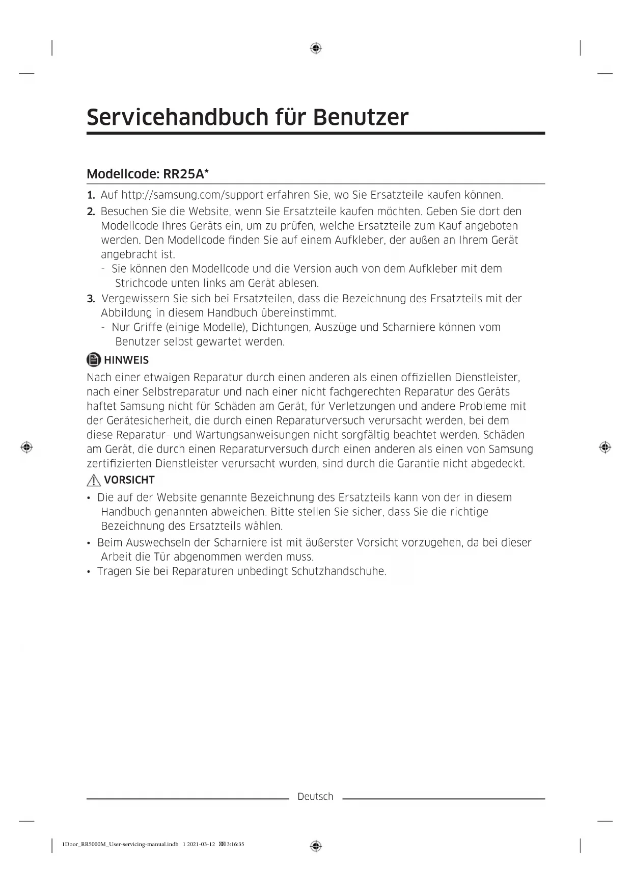 - Tragen Sie bei Reparaturen unbedingt Schutzhandschuhe. 1Door_RR5000M_User-servicing-manual.indb 1 2021-03-12 3:16:35Deutsch Das tatsächliche Aussehen und die mitgelieferten Teile der Kühl-/Gefrierkombination können sich je nach Modell und Land unterscheiden.