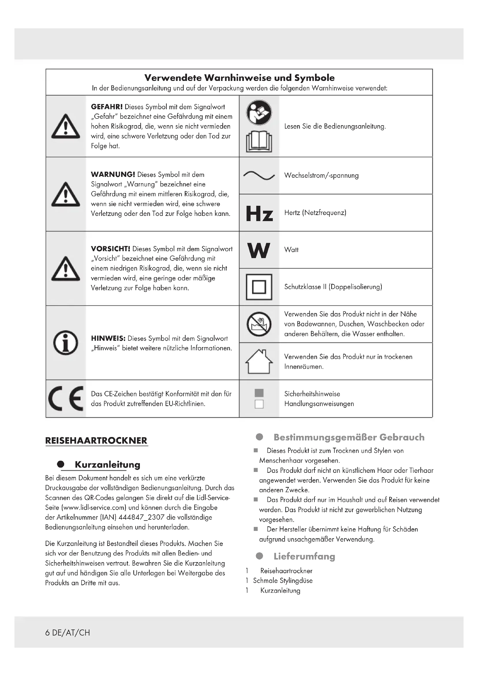 Watt SchutzklasseII (Doppelisolierung) HINWEIS: Dieses Symbol mit dem Signalwort „Hinweis“ bietet weitere nützliche Informationen. Verwenden Sie das Produkt nicht in der Nähe von Badewannen, Duschen, Waschbecken oder anderen Behältern, die Wasser enthalten. Verwenden Sie das Produkt nur in trockenen Innenräumen. Das CE-Zeichen bestätigt Konformität mit den für das Produkt zutreffenden EU-Richtlinien. Sicherheitshinweise Handlungsanweisungen REISEHAARTROCKNER Kurzanleitung Bei diesem Dokument handelt es sich um eine verkürzte Druckausgabe der vollständigen Bedienungsanleitung. Durch das Scannen des QR-Codes gelangen Sie direkt auf die Lidl-Service- Seite (www.lidl-service.com) und können durch die Eingabe der Artikelnummer (IAN) 444847_2307 die vollständige Bedienungsanleitung einsehen und herunterladen. Die Kurzanleitung ist Bestandteil dieses Produkts. Machen Sie sich vor der Benutzung des Produkts mit allen Bedien- und Sicherheitshinweisen vertraut. Bewahren Sie die Kurzanleitung gut auf und händigen Sie alle Unterlagen bei Weitergabe des Produkts an Dritte mit aus. Bestimmungsgemäßer Gebrauch Dieses Produkt ist zum Trocknen und Stylen von Menschenhaar vorgesehen. Das Produkt darf nicht an künstlichem Haar oder Tierhaar angewendet werden. Verwenden Sie das Produkt für keine anderen Zwecke. Das Produkt darf nur im Haushalt und auf Reisen verwendet werden. Das Produkt ist nicht zur gewerblichen Nutzung vorgesehen. Der Hersteller übernimmt keine Haftung für Schäden aufgrund unsachgemäßer Verwendung. Lieferumfang 1 Reisehaartrockner 1 Schmale Stylingdüse 1 Kurzanleitung7DE/AT/CH Teilebeschreibung [1] Luftauslass [2] Schmale Stylingdüse [3] Taste (Kaltluftmodus) [4] Griff [5] Schalter 0/I/II (ein/aus, Luftströmung und Wärmesteuerung) [6] Anschlussleitung und Netzstecker [7] Aufhängeöse [8] Dualer Spannungs-Wahlschalter [9] Klappbares Gelenk