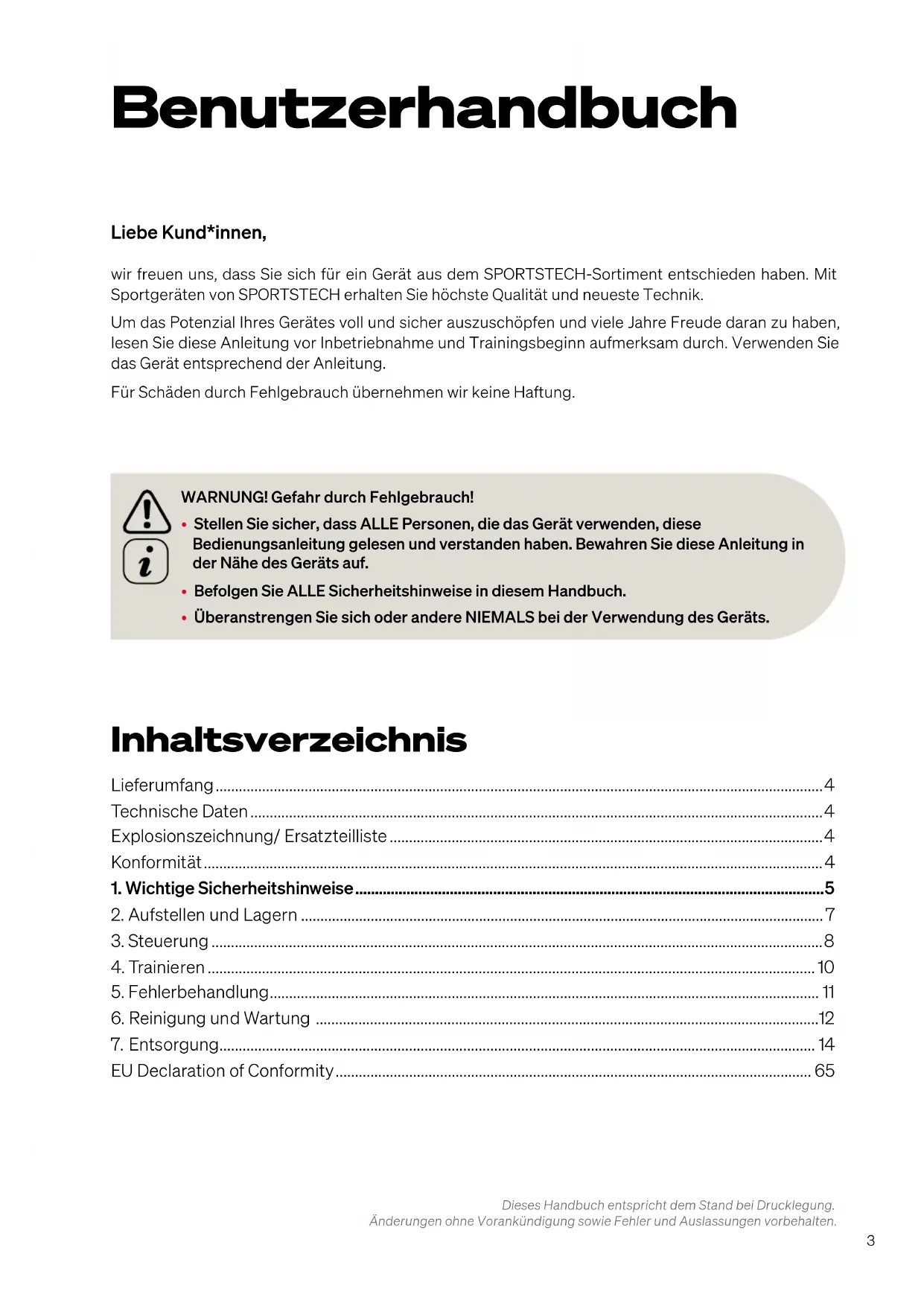 - Überanstrengen Sie sich oder andere NIEMALS bei der Verwendung des Geräts. Liebe Kund*innen, wir freuen uns, dass Sie sich für ein Gerät aus dem SPORTSTECH-Sortiment entschieden haben. Mit Sportgeräten von SPORTSTECH erhalten Sie höchste Qualität und neueste Technik. Um das Potenzial Ihres Gerätes voll und sicher auszuschöpfen und viele Jahre Freude daran zu haben, lesen Sie diese Anleitung vor Inbetriebnahme und Trainingsbeginn aufmerksam durch. Verwenden Sie das Gerät entsprechend der Anleitung. Für Schäden durch Fehlgebrauch übernehmen wir keine Haftung. Inhaltsverzeichnis Lieferumfang .............................................................................................................................................................4 Technische Daten ....................................................................................................................................................4 Explosionszeichnung/ Ersatzteilliste ................................................................................................................4 Konformität ................................................................................................................................................................ 4 1. Wichtige Sicherheitshinweise .......................................................................................................................5 2. Aufstellen und Lagern .......................................................................................................................................7 3. Steuerung ..............................................................................................................................................................8 4. Trainieren ............................................................................................................................................................. 10 5. Fehlerbehandlung .............................................................................................................................................. 11 6. Reinigung und Wartung ..................................................................................................................................12 7. Entsorgung .......................................................................................................................................................... 14 EU Declaration of Conformity ........................................................................................................................... 654