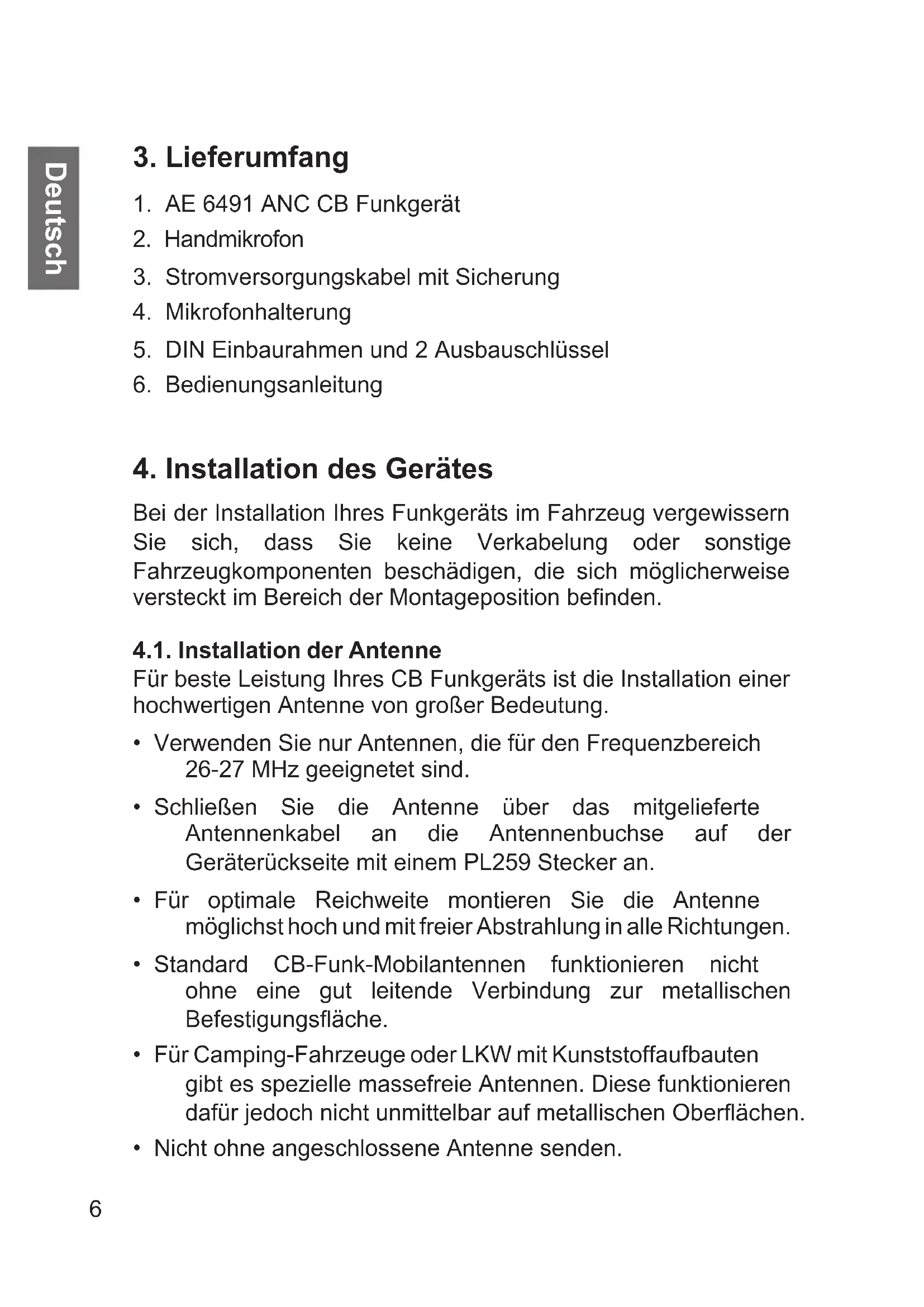 CB Funkgerät AE 6491 ANC CB radio AE 6491 ANC Bedienungsanleitung / Manual Deutsch / English / Français / Italiano2 Deutsch Inhaltsverzeichnis