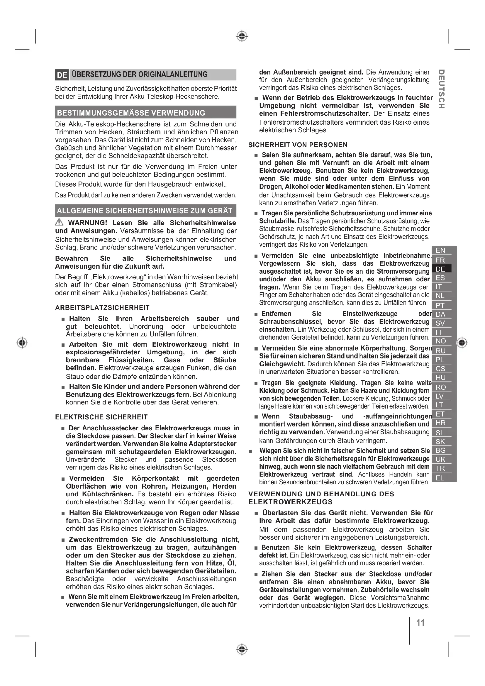 HECKENSCHERE ■ Nutzen Sie die Heckenschere nicht bei schlechtem Wetter, vor allem nicht bei Gewittergefahr. Dies verringert das Risiko, von einem Blitz getroffen zu werden. ■ Halten Sie alle Stromkabel aus dem Schneidebereich fern. Stromkabel können in Hecken oder Gebüschen verborgen sein und versehentlich mit dem Messer durchtrennt werden. ■ Tragen Sie einen Gehörschutz. Geeignete Schutzausrüstung reduziert das Risiko von Hörverlust. ■ Halten Sie die Heckenschere nur an den isolierten Greifflächen, da die Messer in Kontakt mit verborgener Verkabelung kommen können. Wenn die Messer Kontakt zu einem stromführenden Draht haben, kann das dazu führen, dass offenliegende Metallteile der Heckenschere ebenfalls Strom führen, und der Bediener könnte einen Stromschlag erleiden. ■ Halten Sie alle Körperteile von dem Messer fern. Entfernen Sie geschnittenes Material nicht und halten Sie das zu schneidende Material nicht fest, wenn sich die Messer bewegen. Die Messer rotieren nach dem Abschalten des Motors weiterhin. Ein Moment der Unachtsamkeit bei der Benutzung einer Heckenschere kann zu schweren Verletzungen führen. ■ Stellen Sie beim Beseitigen von eingeklemmtem Material oder bei der Wartung der Heckenschere sicher, dass alle Netzschalter ausgeschaltet sind und der Akkupack entfernt oder abgeklemmt wurde. Unerwartetes Ingangsetzen der Heckenschere bei der Wartung oder beim Entfernen von eingeklemmtem Material kann zu schwerwiegenden Personenschäden führen. ■ Tragen Sie die Heckenschere bei angehaltener Messer am Griff und achten Sie darauf, die Einschalttaste nicht zu bedienen. Das korrekte Tragen der Heckenschere verringert das Risiko des unbeabsichtigten Einschaltens und damit das Risiko von Verletzungen durch die Messer. ■ Legen Sie zum Transport sowie zum Aufbewahren der Heckenschere immer der Schutzabdeckung auf. Die korrekte Handhabung der Heckenschere verringert das Risiko von Verletzungen durch die Messer. ■ Tragen Sie immer einen Kopfschutz, wenn Sie die Teleskop-Heckenschere über Kopf verwenden. Fallende Überreste können zu schwerwiegenden Verletzungen führen. ■ Verwenden Sie beim Arbeiten mit der Teleskop- Heckenschere immer beide Hände. Halten Sie die Teleskop-Heckenschere mit beiden Händen fest, um Kontrollverlust zu vermeiden. ■ Um das Risiko eines Stromschlags zu verringern, verwenden Sie die Teleskop-Heckenschere niemals in der Nähe von elektrischen Leitungen. Die Berührung von oder die Verwendung in der Nähe von Stromleitungen kann zu schwerwiegenden Verletzungen und zu Stromstößen mit Todesfolge führen.DEUTSCH