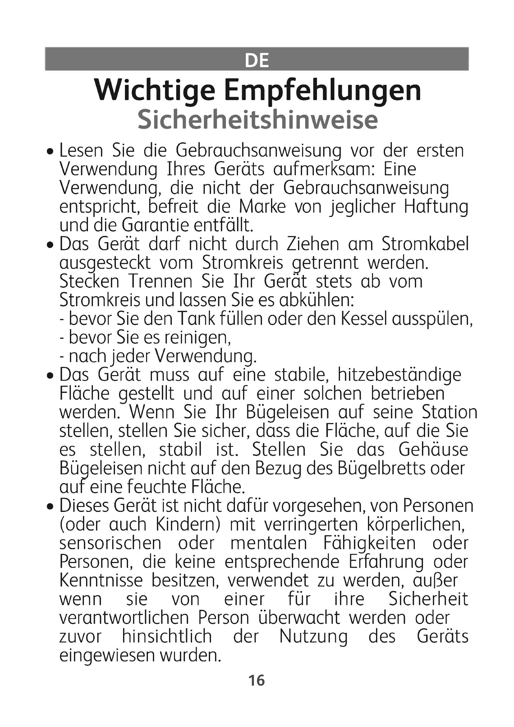 - Um Ihre Sicherheit zu gewährleisten, entspricht dieses Gerät den gültigen Normen undRichtlinien (Niederspannung, Elektromagnetische Verträglichkeit, Umweltverträglichkeit,...). • Ihre Dampfstation ist ein elektrisches Gerät: Es muss unter normalen Gebrauchsbedingungenverwendet werden. Es ist nur für den Hausgebrauch bestimmt. • Es besitzt 2 Sicherheitssysteme: - ein Ventil gegen Überdruck, das den überschüssigen Dampf im Falle einer Fehlfunktion desGeräts austreten lässt, - eine Schmelzsicherung, um jegliche Überhitzung zu vermeiden. • Betreiben Sie Ihre Dampfstation stets: - an einer Elektroinstallation mit einer Spannung zwischen 220 und 240 V. - an einer geerdeten Steckdose. Anschlussfehler können zu nicht behebbaren Schäden führen und lassen die Garantie erlöschen. Überprüfen Sie, wenn Sie ein Verlängerungskabel verwenden, ob es sich wirklich um eine bipolare16A-Dose mit Erdung handelt. • Rollen Sie das Stromkabel vollständig ab, bevor Sie es an eine geerdete Steckdose ansteckenanschließen. • Die Sohle Ihres Bügeleisens und die Bügeleisenstation des Gehäuses können sehr hoheTemperaturen erreichen und Verbrennungen verursachen: Berühren Sie sie nicht. Berühren Sie die Stromkabel niemals mit der Sohle des Bügeleisens. • Ihr Gerät erzeugt Dampf, der Verbrennungen verursachen kann. Gehen Sie vorsichtig mit demBügeleisen um, vor allem beim vertikalen Bügeln Dampfen. Richten Sie den Dampf niemalsgegen Personen oder Tiere. • Tauchen Sie Ihre Dampfstation niemals in Wasser oder eine andere Flüssigkeit. Halten Sie sieniemals unter den Wasserhahn. Denken Sie an den Schutz der Umwelt ! Ihr Gerät enthält wertvolle Rohstoffe, die wieder verwertet werden können. Entsorgen Sie Ihr Gerät deshalb umweltgerecht bei einer Sammelstelle Ihrer Stadt oder Gemeinde.