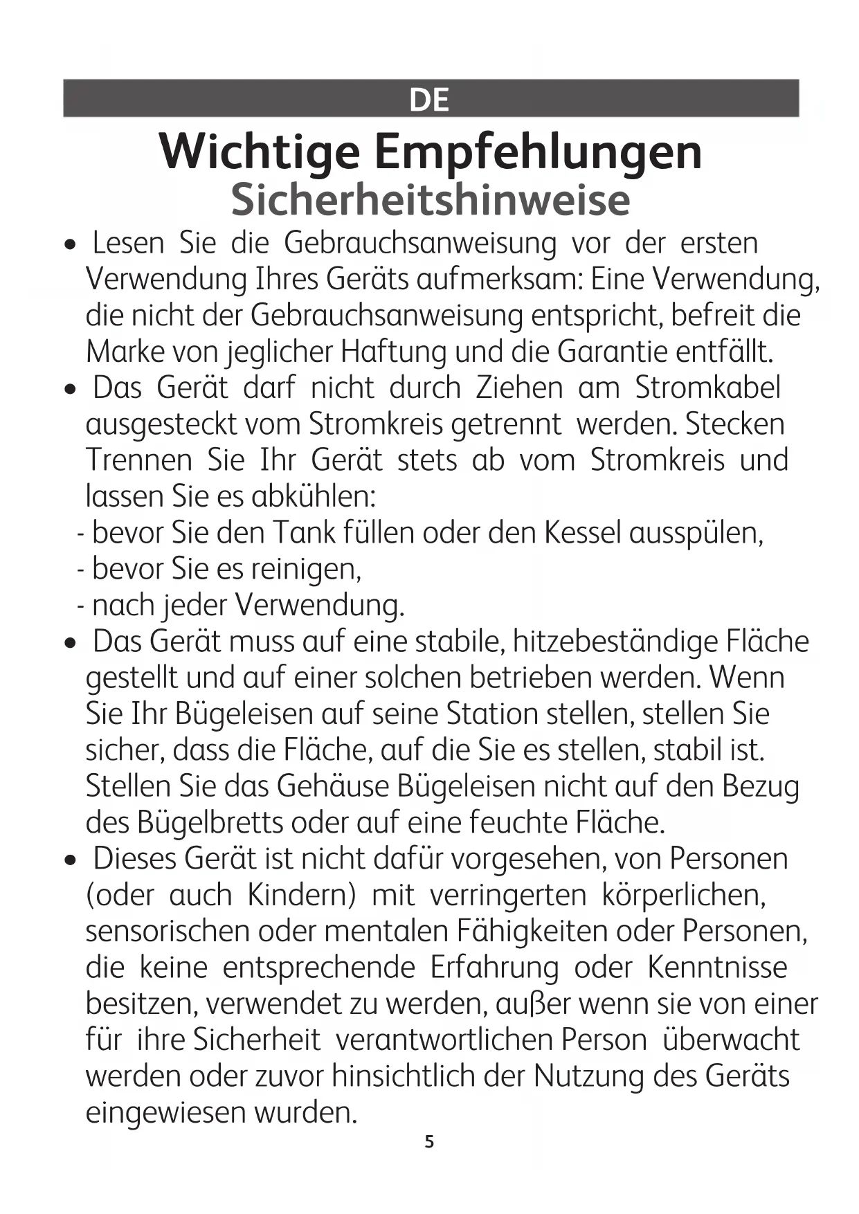 - Ihre Dampfstation ist ein elektrisches Gerät: Es muss unter normalen Gebrauchsbedingungen verwendet werden. Es ist nur für den Hausgebrauch bestimmt.