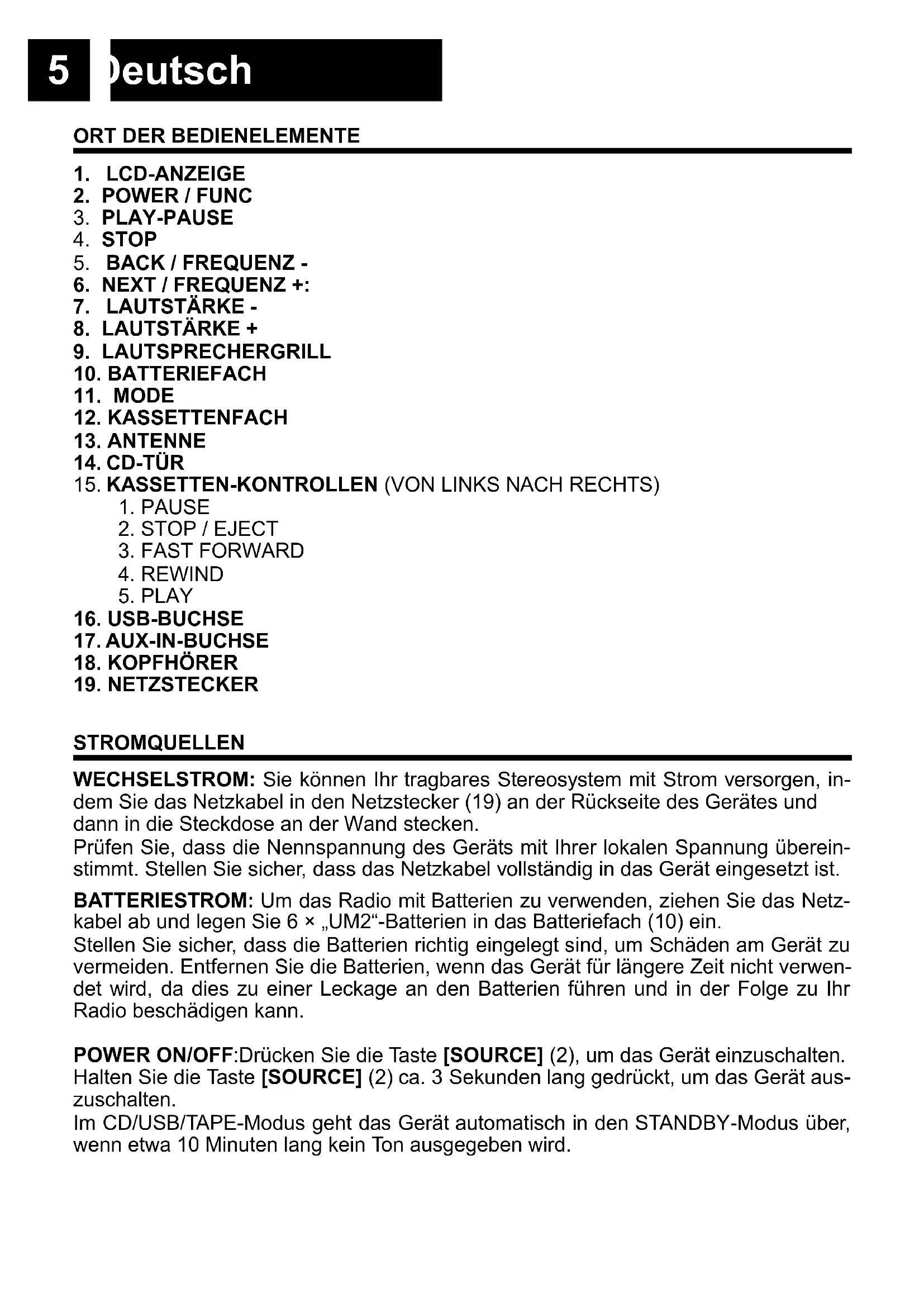STROMQUELLEN WECHSELSTROM: Sie können Ihr tragbares Stereosystem mit Strom versorgen, in- dem Sie das Netzkabel in den Netzstecker (19) an der Rückseite des Gerätes und dann in die Steckdose an der Wand stecken. Prüfen Sie, dass die Nennspannung des Geräts mit Ihrer lokalen Spannung überein- stimmt. Stellen Sie sicher, dass das Netzkabel vollständig in das Gerät eingesetzt ist. BATTERIESTROM: Um das Radio mit Batterien zu verwenden, ziehen Sie das Netz- kabel ab und legen Sie 6 × „UM2“-Batterien in das Batteriefach (10) ein. Stellen Sie sicher, dass die Batterien richtig eingelegt sind, um Schäden am Gerät zu vermeiden. Entfernen Sie die Batterien, wenn das Gerät für längere Zeit nicht verwen- det wird, da dies zu einer Leckage an den Batterien führen und in der Folge zu Ihr Radio beschädigen kann. POWER ON/OFF:Drücken Sie die Taste [SOURCE] (2), um das Gerät einzuschalten. Halten Sie die Taste [SOURCE] (2) ca. 3 Sekunden lang gedrückt, um das Gerät aus- zuschalten. Im CD/USB/TAPE-Modus geht das Gerät automatisch in den STANDBY-Modus über, wenn etwa 10 Minuten lang kein Ton ausgegeben wird.6 Deutsch VORSICHT HINWEISE - Alle Sicherheits- und Betriebsanweisungen sollten vor der Inbetriebnah- me des Funkgeräts gelesen werden. Das Handbuch sollte zum späteren Nachschla- gen aufbewahrt werden. WARNUNGEN BEACHTEN - Alle Warnhinweise auf dem Gerät und in der Bedie- nungsanleitung müssen beachtet werden. WASSER UND FEUCHTIGKEIT - Das Gerät sollte nicht in der Nähe von Flüssigkei- ten oder in Räumen mit hoher Luftfeuchtigkeit verwendet werden. BELÜFTUNG - Das Gerät sollte so aufgestellt werden, dass sein Standort oder seine Position die ordnungsgemäße Belüftung nicht beeinträchtigt. WÄRME - Das Gerät sollte nicht in der Nähe von Wärmequellen wie Heizkörpern, Öfen oder anderen Wärme erzeugenden Geräten aufgestellt werden. STROMQUELLE - Das Radio darf nur an eine Stromversorgung angeschlossen wer- den, die in der Bedienungsanleitung beschrieben oder auf dem Gerät gekennzeichnet ist. SCHUTZ DER STROMKABEL - Die Stromkabel sollten so verlegt werden, dass man nicht auf sie treten oder sie durch Gegenstände, die darauf oder dagegen gestellt werden, einklemmen kann. EINTRITT VON OBJEKTEN UND FLÜSSIGKEITEN - Es ist darauf zu achten, dass keine Gegenstände herunterfallen und keine Flüssigkeiten durch Öffnungen in das Gehäuse gelangen.