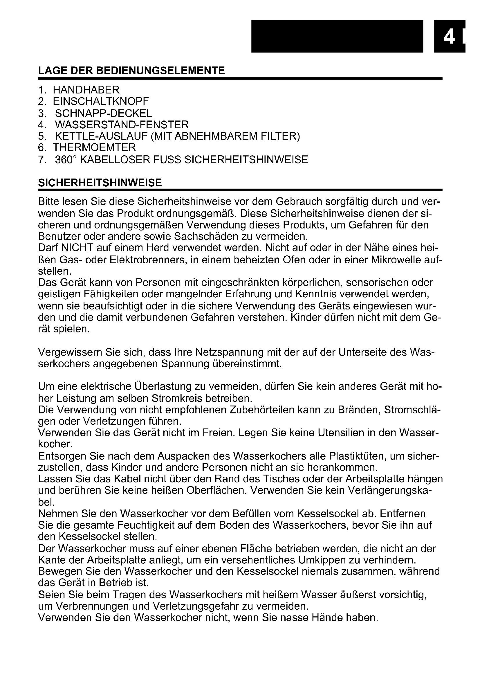 SICHERHEITSHINWEISE Bitte lesen Sie diese Sicherheitshinweise vor dem Gebrauch sorgfältig durch und ver- wenden Sie das Produkt ordnungsgemäß. Diese Sicherheitshinweise dienen der si- cheren und ordnungsgemäßen Verwendung dieses Produkts, um Gefahren für den Benutzer oder andere sowie Sachschäden zu vermeiden. Darf NICHT auf einem Herd verwendet werden. Nicht auf oder in der Nähe eines hei- ßen Gas- oder Elektrobrenners, in einem beheizten Ofen oder in einer Mikrowelle auf- stellen. Das Gerät kann von Personen mit eingeschränkten körperlichen, sensorischen oder geistigen Fähigkeiten oder mangelnder Erfahrung und Kenntnis verwendet werden, wenn sie beaufsichtigt oder in die sichere Verwendung des Geräts eingewiesen wur- den und die damit verbundenen Gefahren verstehen. Kinder dürfen nicht mit dem Ge- rät spielen. Vergewissern Sie sich, dass Ihre Netzspannung mit der auf der Unterseite des Was- serkochers angegebenen Spannung übereinstimmt. Um eine elektrische Überlastung zu vermeiden, dürfen Sie kein anderes Gerät mit ho- her Leistung am selben Stromkreis betreiben. Die Verwendung von nicht empfohlenen Zubehörteilen kann zu Bränden, Stromschlä- gen oder Verletzungen führen. Verwenden Sie das Gerät nicht im Freien. Legen Sie keine Utensilien in den Wasser- kocher. Entsorgen Sie nach dem Auspacken des Wasserkochers alle Plastiktüten, um sicher- zustellen, dass Kinder und andere Personen nicht an sie herankommen. Lassen Sie das Kabel nicht über den Rand des Tisches oder der Arbeitsplatte hängen und berühren Sie keine heißen Oberflächen. Verwenden Sie kein Verlängerungska- bel. Nehmen Sie den Wasserkocher vor dem Befüllen vom Kesselsockel ab. Entfernen Sie die gesamte Feuchtigkeit auf dem Boden des Wasserkochers, bevor Sie ihn auf den Kesselsockel stellen. Der Wasserkocher muss auf einer ebenen Fläche betrieben werden, die nicht an der Kante der Arbeitsplatte anliegt, um ein versehentliches Umkippen zu verhindern. Bewegen Sie den Wasserkocher und den Kesselsockel niemals zusammen, während das Gerät in Betrieb ist. Seien Sie beim Tragen des Wasserkochers mit heißem Wasser äußerst vorsichtig, um Verbrennungen und Verletzungsgefahr zu vermeiden. Verwenden Sie den Wasserkocher nicht, wenn Sie nasse Hände haben.5 Deutsch Stellen Sie den Wasserkocher vor dem Einschalten ordnungsgemäß auf den Sockel des Wasserkochers. Warten Sie nach dem Gebrauch des Wasserkochers, bis der Wasserkocher abgekühlt ist, bevor Sie den Deckel abnehmen. Drehen Sie den Ausguss während des Ge- brauchs von den Wänden oder Schränken weg, um mögliche Dampfschäden zu ver- meiden. Wenn Sie den Wasserkocher auf eine Tischoberfläche stellen, legen Sie nach dem Er- hitzen eine Schutzunterlage unter den Wasserkocher, um Schäden an Oberflächen zu vermeiden. Um die Gefahr eines Brandes oder elektrischen Schlages zu verringern, dürfen Sie die Bodenabdeckung nicht vom Sockel abnehmen oder den Sockel oder den Wasserko- cher in irgendeiner Weise zerlegen. Im Inneren befinden sich keine Teile, die vom Be- nutzer gewartet werden können. Reparaturen sollten nur von autorisiertem Service- personal durchgeführt werden. Das Öffnen des Sockels oder des Wasserkochers führt zum Erlöschen der zweijährigen Garantie. Betreiben Sie das Gerät nicht in der Nähe von explosiven und/oder entflammbaren Dämpfen. Verwenden Sie den Wasserkocher nicht für einen anderen als den vorgesehenen Zweck. Dieses Gerät ist nur für den Hausgebrauch bestimmt. STROMQUELLEN Sie können den Wasserkocher mit Strom versorgen, indem Sie das Netzkabel mit dem Netzstecker in eine Wandsteckdose einstecken. Vergewissern Sie sich, dass die Nennspannung des Geräts mit der örtlichen Span- nung übereinstimmt. Stellen Sie sicher, dass das Netzkabel vollständig in das Gerät eingesteckt ist. Vor der Verwendung des Wasserkochers Nehmen Sie den Wasserkocher aus der Halterung und öffnen Sie den Deckel. Füllen Sie den Wasserkocher bis zur MAX-Markierung (siehe Wasserstandsanzeige), achten Sie darauf, dass der Wasserkocher nicht überfüllt ist. Schließen Sie den Deckel und stellen Sie den Wasserkocher wieder auf den Sockel Drücken Sie den Ein/Aus-Schalter. Das Licht schaltet sich ein. Lassen Sie das Wasser im Kessel kochen und werfen Sie es dann weg. Wiederholen Sie diesen Vorgang 2 Mal. Nehmen Sie den Filter vor dem Gebrauch heraus und spülen Sie ihn. Siehe Abschnitt „Reinigung und Wartung“.