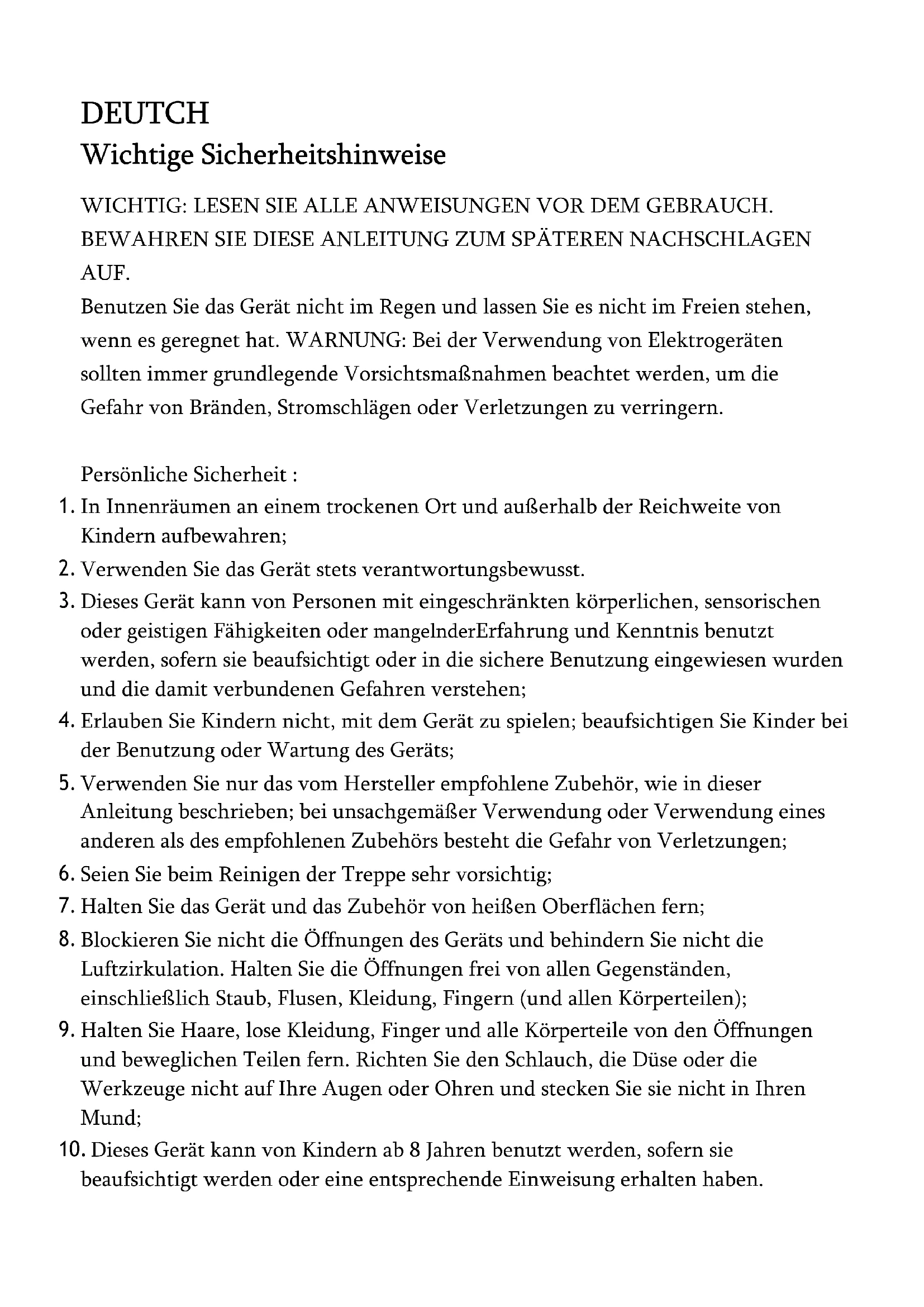 1. Dieses Gerät ist ausschließlich für das Trockenstaubsaugen im Haushalt