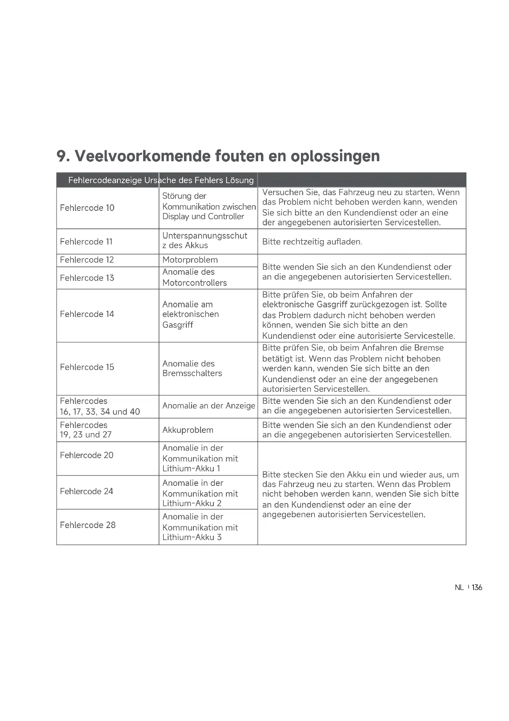 Fehlercodeanzeige Ursache des Fehlers Lösung Fehlercode 10 Fehlercode 11 Bitte rechtzeitig aufladen. Fehlercode 12 Fehlercode 13 Motorproblem Fehlercode 14 Fehlercodes 16, 17, 33, 34 und 40 Anomalie an der Anzeige Fehlercodes 19, 23 und 27 Akkuproblem Fehlercode 15 Fehlercode 20 Fehlercode 24 Fehlercode 28 Störung der Kommunikation zwischen Display und Controller Unterspannungsschut z des Akkus Anomalie des Motorcontrollers Anomalie am elektronischen Gasgriff Anomalie des Bremsschalters Anomalie in der Kommunikation mit Lithium-Akku 1 Anomalie in der Kommunikation mit Lithium-Akku 2 Anomalie in der Kommunikation mit Lithium-Akku 3 Versuchen Sie, das Fahrzeug neu zu starten. Wenn das Problem nicht behoben werden kann, wenden Sie sich bitte an den Kundendienst oder an eine der angegebenen autorisierten Servicestellen. Bitte wenden Sie sich an den Kundendienst oder an die angegebenen autorisierten Servicestellen. Bitte prüfen Sie, ob beim Anfahren der elektronische Gasgriff zurückgezogen ist. Sollte das Problem dadurch nicht behoben werden können, wenden Sie sich bitte an den Kundendienst oder eine autorisierte Servicestelle. Bitte prüfen Sie, ob beim Anfahren die Bremse betätigt ist. Wenn das Problem nicht behoben werden kann, wenden Sie sich bitte an den Kundendienst oder an eine der angegebenen autorisierten Servicestellen. Bitte stecken Sie den Akku ein und wieder aus, um das Fahrzeug neu zu starten. Wenn das Problem nicht behoben werden kann, wenden Sie sich bitte an den Kundendienst oder an eine der angegebenen autorisierten Servicestellen. Bitte wenden Sie sich an den Kundendienst oder an die angegebenen autorisierten Servicestellen. Bitte wenden Sie sich an den Kundendienst oder an die angegebenen autorisierten Servicestellen.137