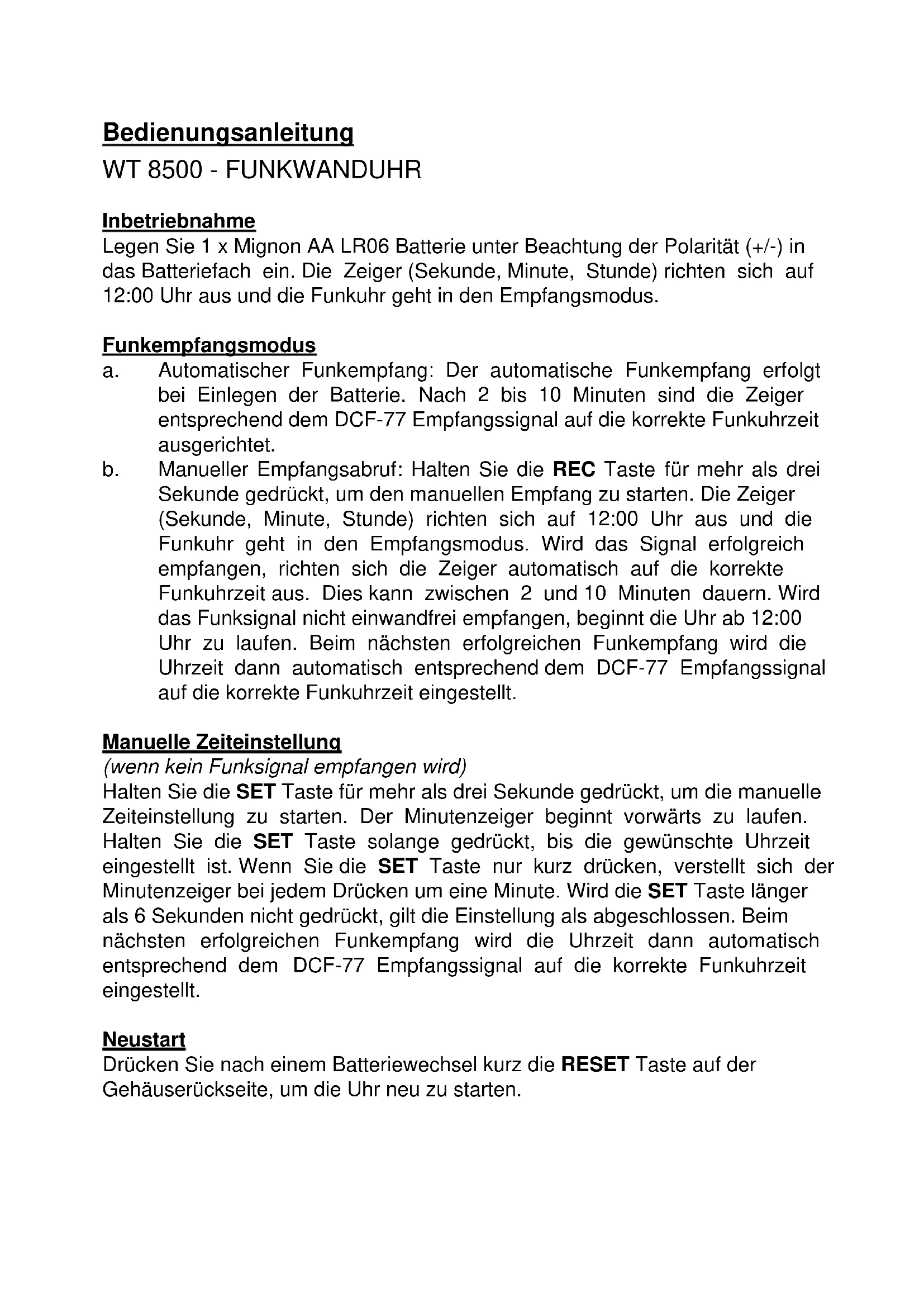 Inbetriebnahme Legen Sie 1 x Mignon AA LR06 Batterie unter Beachtung der Polarität (+/-) in das Batteriefach ein. Die Zeiger (Sekunde, Minute, Stunde) richten sich auf 12:00 Uhr aus und die Funkuhr geht in den Empfangsmodus. Funkempfangsmodus a. Automatischer Funkempfang: Der automatische Funkempfang erfolgt bei Einlegen der Batterie. Nach 2 bis 10 Minuten sind die Zeiger entsprechend dem DCF-77 Empfangssignal auf die korrekte Funkuhrzeit ausgerichtet. b. Manueller Empfangsabruf: Halten Sie die REC Taste für mehr als drei Sekunde gedrückt, um den manuellen Empfang zu starten. Die Zeiger (Sekunde, Minute, Stunde) richten sich auf 12:00 Uhr aus und die Funkuhr geht in den Empfangsmodus. Wird das Signal erfolgreich empfangen, richten sich die Zeiger automatisch auf die korrekte Funkuhrzeit aus. Dies kann zwischen 2 und 10 Minuten dauern. Wird das Funksignal nicht einwandfrei empfangen, beginnt die Uhr ab 12:00 Uhr zu laufen. Beim nächsten erfolgreichen Funkempfang wird die Uhrzeit dann automatisch entsprechend dem DCF-77 Empfangssignal auf die korrekte Funkuhrzeit eingestellt. Manuelle Zeiteinstellung (wenn kein Funksignal empfangen wird) Halten Sie die SET Taste für mehr als drei Sekunde gedrückt, um die manuelle Zeiteinstellung zu starten. Der Minutenzeiger beginnt vorwärts zu laufen. Halten Sie die SET Taste solange gedrückt, bis die gewünschte Uhrzeit eingestellt ist. Wenn Sie die SET Taste nur kurz drücken, verstellt sich der Minutenzeiger bei jedem Drücken um eine Minute. Wird die SET Taste länger als 6 Sekunden nicht gedrückt, gilt die Einstellung als abgeschlossen. Beim nächsten erfolgreichen Funkempfang wird die Uhrzeit dann automatisch entsprechend dem DCF-77 Empfangssignal auf die korrekte Funkuhrzeit eingestellt. Neustart Drücken Sie nach einem Batteriewechsel kurz die RESET Taste auf der Gehäuserückseite, um die Uhr neu zu starten.Hinweise: Um eine korrekte Funktion Ihrer Funk-Wanduhr zu gewährleisten, empfehlen wir Ihnen einen jährlichen Batteriewechsel. Wartung und Reparaturarbeiten dürfen nur von einem Fachmann bzw. einer Fachwerkstatt durchgeführt werden. Sollten Sie noch Fragen haben, die in dieser Bedienungsanleitung nicht beantwortet werden, so wenden Sie sich bitte an unseren technischen Kundendienst oder einen anderen Fachmann. Hiermit erklärt Technotrade, dass sich das Produkt WT 8500 in Übereinstimmung mit den grundlegenden Anforderungen und den übrigen einschlägigen Bestimmungen der Richtlinie 2014/53/EU und ROHS 2011/65/EG befindet. Die Original-EU-Konformitätserklärung finden Sie unter: www.technoline.de/doc/4029665385006 Umwelteinflüsse auf Funkempfang Die Uhr empfängt kabellos die genaue Uhrzeit. Wie bei allen kabellosen Geräten kann der Funkempfang durch folgende Einflüsse beeinträchtigt sein: lange Übertragungswege naheliegende Berge und Täler nahe Autobahnen, Gleisen, Flughäfen, Hochspannungsleitungen, etc. nahe Baustellen inmitten hoher Gebäude in Betonbauten nahe elektrischer Geräte (Computer, Fernseher, etc) und metallischer Gegenstände in bewegten Fahrzeugen Platzieren Sie die Uhr an einem Ort mit optimalem Empfang, z.B. in der Nähe von Fenstern und entfernt zu metallischen oder elektrischen Gegenständen. Vorsichtsmaßnahmen Setzen Sie das Gerät nicht extremer Gewalteinwirkung oder Stößen aus. Setzen Sie das Gerät nicht hohen Temperaturen, direktem Sonnenlicht, Staub und Feuchtigkeit aus. Tauchen Sie das Gerät nicht in Wasser. Vermeiden Sie den Kontakt mit ätzenden Materialien. Werfen Sie das Gerät nicht ins Feuer. Es könnte explodieren. Öffnen Sie nicht das Gehäuse und manipulieren Sie nicht bauliche Bestandteile des Geräts. Batterie-Sicherheitshinweise Verwenden Sie nur Alkali-Batterien, keine wiederaufladbaren Batterien. Legen Sie die Batterien unter Beachtung der Polarität (+/-) richtig ein. Ersetzen Sie stets einen vollständigen Batteriesatz. Mischen Sie niemals alte und neue Batterien. Entfernen Sie erschöpfte Batterien sofort. Entfernen Sie die Batterien bei Nichtnutzung. Laden Sie die Batterien nicht auf und werfen Sie sie nicht ins Feuer. Sie könnten explodieren. Bewahren Sie die Batterien nicht in der Nähe von Metallobjekten auf, da ein Kontakt einen Kurzschluss verursachen kann. Setzen Sie Batterien keinen hohen Temperaturen, extremer Feuchtigkeit oder direktem Sonnenlicht aus. Bewahren Sie Batterien außerhalb der Reichweite von Kindern auf. Verschlucken der Batterien kann zum Ersticken führen. Verwenden Sie das Produkt ausschließlich für den vorgesehenen Zweck! Hinweispflicht nach dem Batteriegesetz Altbatterien gehören nicht in den Hausmüll. Wenn Batterien in die Umwelt gelangen, können diese Umwelt- und Gesundheitsschäden zur Folge haben. Sie können gebrauchte Batterien unentgeltlich bei ihrem Händler und Sammelstellen zurückgeben. Sie sind als Verbraucher zur Rückgabe von Altbatterien gesetzlich verpflichtet! Hinweispflicht nach dem Elektronikgerätegesetz Laut Elektro- und Elektronikgerätegesetz (ElektroG) gehört Elektroschrott nicht in den Hausmüll, sondern ist zu recyceln oder umweltfreundlich zu entsorgen. Entsorgen Sie ihr Gerät in einen Recycling Container oder an eine lokale Abfallsammelstelle.Instruction manual