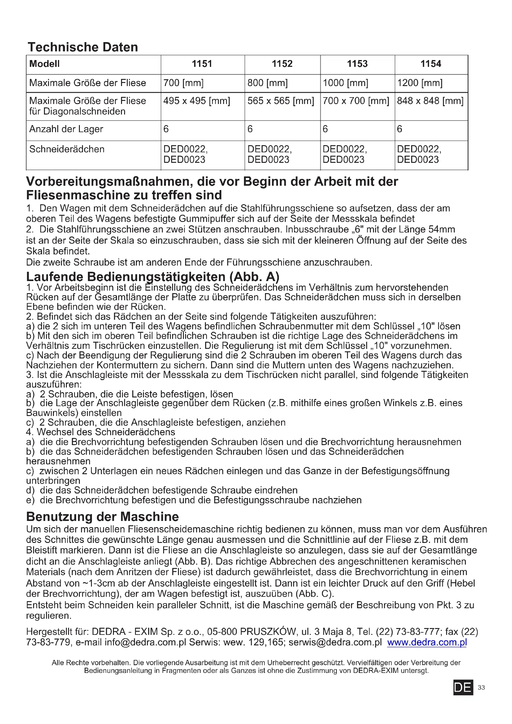 a) die die Brechvorrichtung befestigenden Schrauben lösen und die Brechvorrichtung herausnehmen b) die das Schneiderädchen befestigenden Schrauben lösen und das Schneiderädchen herausnehmen c) zwischen 2 Unterlagen ein neues Rädchen einlegen und das Ganze in der Befestigungsöffnung unterbringen d) die das Schneiderädchen befestigende Schraube eindrehen e) die Brechvorrichtung befestigen und die Befestigungsschraube nachziehen Benutzung der Maschine Um sich der manuellen Fliesenscheidemaschine richtig bedienen zu können, muss man vor dem Ausführen des Schnittes die gewünschte Länge genau ausmessen und die Schnittlinie auf der Fliese z.B. mit dem Bleistift markieren. Dann ist die Fliese an die Anschlagleiste so anzulegen, dass sie auf der Gesamtlänge dicht an die Anschlagleiste anliegt (Abb. B). Das richtige Abbrechen des angeschnittenen keramischen Materials (nach dem Anritzen der Fliese) ist dadurch gewährleistet, dass die Brechvorrichtung in einem Abstand von ~1-3cm ab der Anschlagleiste eingestellt ist. Dann ist ein leichter Druck auf den Griff (Hebel der Brechvorrichtung), der am Wagen befestigt ist, auszuüben (Abb. C). Entsteht beim Schneiden kein paralleler Schnitt, ist die Maschine gemäß der Beschreibung von Pkt. 3 zu regulieren. Hergestellt für: DEDRA - EXIM Sp. z o.o., 05-800 PRUSZKÓW, ul. 3 Maja 8, Tel. (22) 73-83-777; fax (22) 73-83-779, e-mail info@dedra.com.pl Serwis: wew. 129,165; serwis@dedra.com.pl www.dedra.com.pl Alle Rechte vorbehalten. Die vorliegende Ausarbeitung ist mit dem Urheberrecht geschützt. Vervielfältigen oder Verbreitung der Bedienungsanleitung in Fragmenten oder als Ganzes ist ohne die Zustimmung von DEDRA-EXIM untersgt. DE34 DEDRA EXIM Sp. z o.o. 05-800 Pruszków ul. 3 Maja 8 tel: (+48 / 22) 73-83-777fax: (+48 / 22) 73-83-779 http: //www . dedra .ple-mail: info@dedra.pl Garantiekarte Stempel des Verkäufers Datum und Unterschrift ................................................ Katalognummer: Name: Seriennummer: ............................................. GARANTIEBEDINGUNGEN