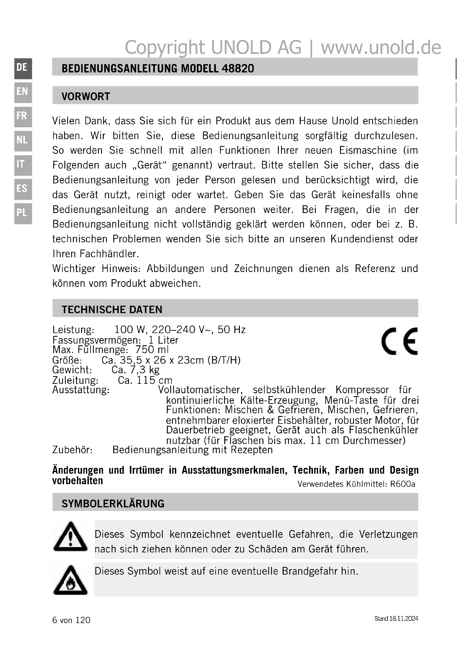 Leistung: 100 W, 220–240 V~, 50 Hz Fassungsvermögen: 1 Liter Max. Füllmenge: 750 ml Größe: Ca. 35,5 x 26 x 23cm (B/T/H) Gewicht: Ca. 7,3 kg Zuleitung: Ca. 115 cm Ausstattung: Vollautomatischer, selbstkühlender Kompressor für kontinuierliche Kälte-Erzeugung, Menü-Taste für drei Funktionen: Mischen & Gefrieren, Mischen, Gefrieren, entnehmbarer eloxierter Eisbehälter, robuster Motor, für Dauerbetrieb geeignet, Gerät auch als Flaschenkühler nutzbar (für Flaschen bis max. 11 cm Durchmesser) Zubehör: Bedienungsanleitung mit Rezepten Änderungen und Irrtümer in Ausstattungsmerkmalen, Technik, Farben und Design vorbehalten BEDIENUNGSANLEITUNG MODELL 48820 TECHNISCHE DATEN SYMBOLERKLÄRUNG Dieses Symbol kennzeichnet eventuelle Gefahren, die Verletzungen nach sich ziehen können oder zu Schäden am Gerät führen. Dieses Symbol weist auf eine eventuelle Brandgefahr hin. Vielen Dank, dass Sie sich für ein Produkt aus dem Hause Unold entschieden haben. Wir bitten Sie, diese Bedienungsanleitung sorgfältig durchzulesen. So werden Sie schnell mit allen Funktionen Ihrer neuen Eismaschine (im Folgenden auch „Gerät“ genannt) vertraut. Bitte stellen Sie sicher, dass die Bedienungsanleitung von jeder Person gelesen und berücksichtigt wird, die das Gerät nutzt, reinigt oder wartet. Geben Sie das Gerät keinesfalls ohne Bedienungsanleitung an andere Personen weiter. Bei Fragen, die in der Bedienungsanleitung nicht vollständig geklärt werden können, oder bei z. B. technischen Problemen wenden Sie sich bitte an unseren Kundendienst oder Ihren Fachhändler. Wichtiger Hinweis: Abbildungen und Zeichnungen dienen als Referenz und können vom Produkt abweichen. VORWORT Verwendetes Kühlmittel: R600a Copyright UNOLD AG | www.unold.deStand 18.11.2024 7 von 120
