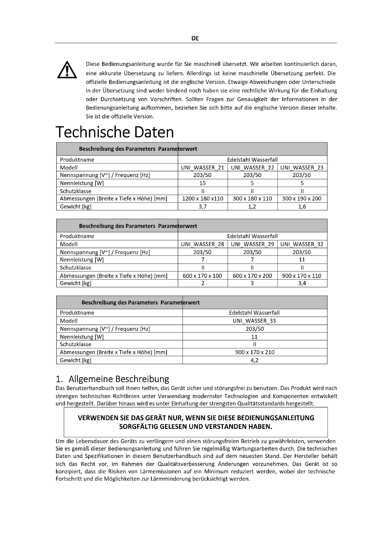 Adresa výrobcuDE Diese Bedienungsanleitung wurde für Sie maschinell übersetzt. Wir arbeiten kontinuierlich daran, eine akkurate Übersetzung zu liefern. Allerdings ist keine maschinelle Übersetzung perfekt. Die offizielle Bedienungsanleitung ist die englische Version. Etwaige Abweichungen oder Unterschiede in der Übersetzung sind weder bindend noch haben sie eine rechtliche Wirkung für die Einhaltung oder Durchsetzung von Vorschriften. Sollten Fragen zur Genauigkeit der Informationen in der Bedienungsanleitung aufkommen, beziehen Sie sich bitte auf die englische Version dieser Inhalte. Sie ist die offizielle Version. Technische Daten Beschreibung des Parameters Parameterwert Produktname Edelstahl Wasserfall Modell UNI_WASSER_21 UNI_WASSER_22 UNI_WASSER_23 Nennspannung [V~] / Frequenz [Hz] 203/50 203/50 203/50 Nennleistung [W]