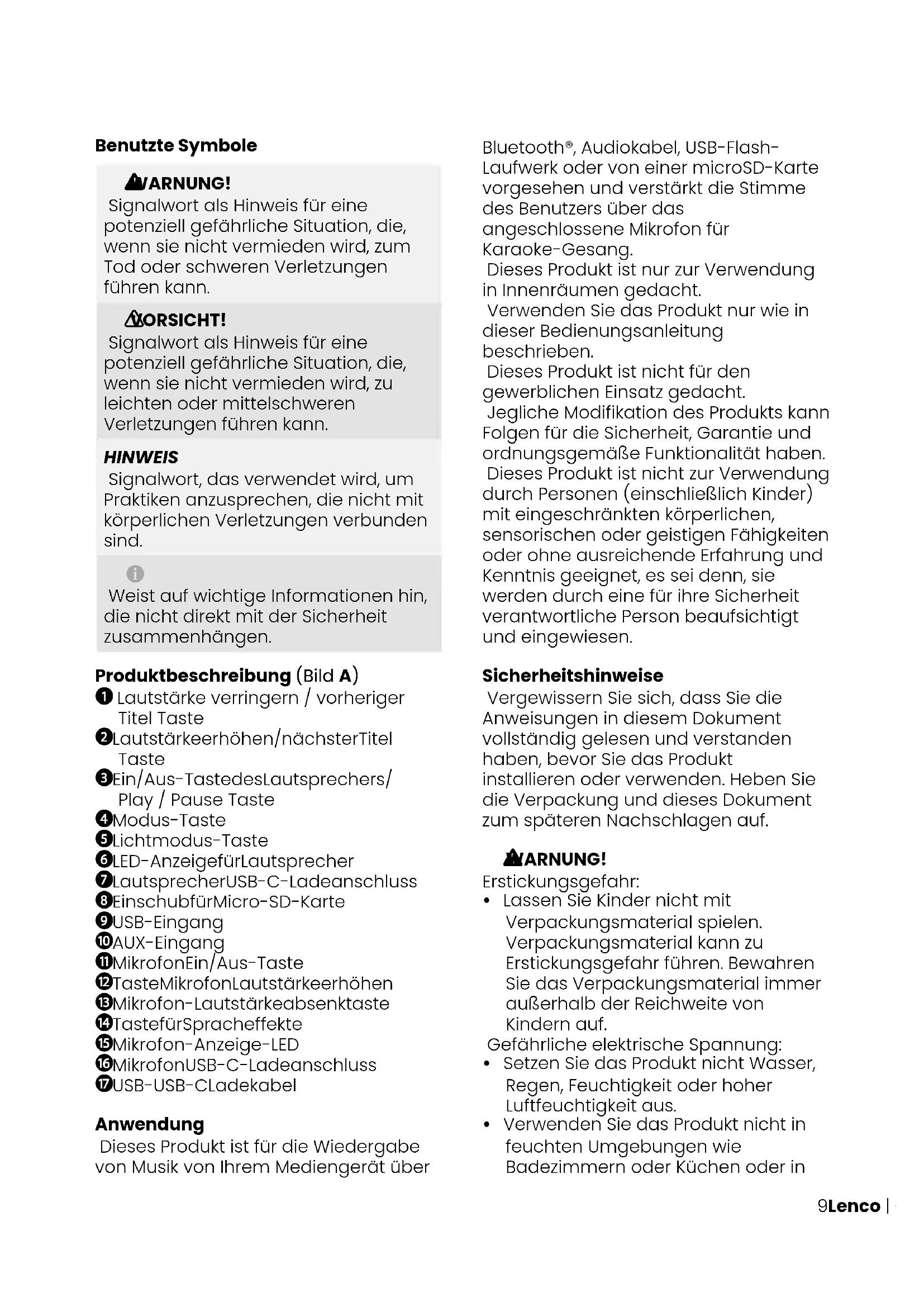 This symbol indicates that the relevant electrical product or battery should not be disposed of as general household waste in Europe. To ensure the correct waste treatment of the product and battery, please dispose them in accordance to any applicable local laws of requirement for disposal of electrical equipment or batteries. In doing so, you will help to conserve natural resources and improve standards of environmental protection in treatment and disposal of electrical waste (Waste Electrical and Electronic Equipment Directive).9Lenco | Quick start guide Bluetooth®, Audiokabel, USB-Flash- Laufwerk oder von einer microSD-Karte vorgesehen und verstärkt die Stimme des Benutzers über das angeschlossene Mikrofon für Karaoke-Gesang. Dieses Produkt ist nur zur Verwendung in Innenräumen gedacht. Verwenden Sie das Produkt nur wie in dieser Bedienungsanleitung beschrieben. Dieses Produkt ist nicht für den gewerblichen Einsatz gedacht. Jegliche Modifikation des Produkts kann Folgen für die Sicherheit, Garantie und ordnungsgemäße Funktionalität haben. Dieses Produkt ist nicht zur Verwendung durch Personen (einschließlich Kinder) mit eingeschränkten körperlichen, sensorischen oder geistigen Fähigkeiten oder ohne ausreichende Erfahrung und Kenntnis geeignet, es sei denn, sie werden durch eine für ihre Sicherheit verantwortliche Person beaufsichtigt und eingewiesen. Sicherheitshinweise Vergewissern Sie sich, dass Sie die Anweisungen in diesem Dokument vollständig gelesen und verstanden haben, bevor Sie das Produkt installieren oder verwenden. Heben Sie die Verpackung und dieses Dokument zum späteren Nachschlagen auf.