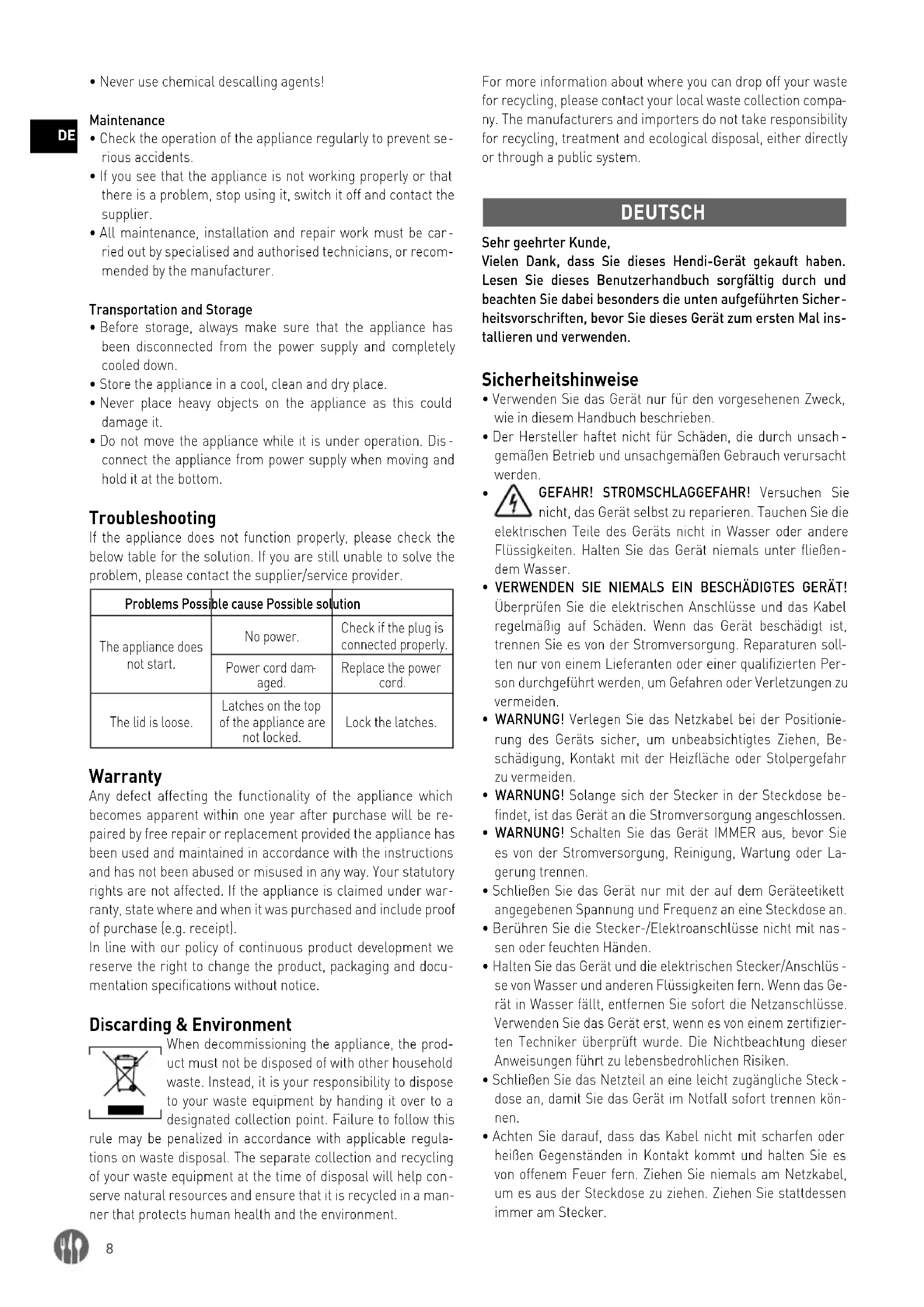 ny. The manufacturers and importers do not take responsibility for recycling, treatment and ecological disposal, either directly or through a public system. DEUTSCH Sehr geehrter Kunde, Vielen Dank, dass Sie dieses Hendi-Gerät gekauft haben. Lesen Sie dieses Benutzerhandbuch sorgfältig durch und beachten Sie dabei besonders die unten aufgeführten Sicher