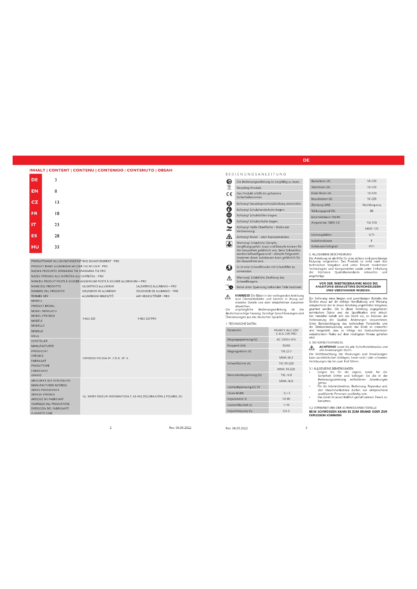 Parameter: Model S-ALU 220/ S-ALU 220 PRO Eingangsspannung (V) AC 230V±10% Frequenz (Hz) 50/60 Eingangsstrom (A) TIG 23.7 MMA 36.3 Schweißstrom (A) TIG 10-220 MMA 10-220 Nennarbeitsspannung (V) TIG 16.8 MMA 26.8 Leerlaufspannung (V) 59 Clean Width -5/+5 Impulsweite % 10-90 Gasnachlaufzeit (s) 1-10 Impulsfrequenz Hz 0,5-5 HINWEIS! Die Bilder in der vorliegenden Anleitung sind Übersichtsbilder und können in Bezug auf einzelne Details von dem tatsächlichen Aussehen abweichen. Basisstrom (A) 10-220 Startstrom (A) 10-220 Ende Strom (A) 10-220 Impulsstrom (A) 10-220 Zündung WIG Hochfrequenz Wirkungsgrad (%) 80 Einschaltdauer (%) 60 Ampere bei 100% ED TIG 170 MMA 170 Leistungsfaktor 0,73 Isolationsklasse F Gehäuseschutzgrad IP21 BEDIENUNGSANLEITUNG