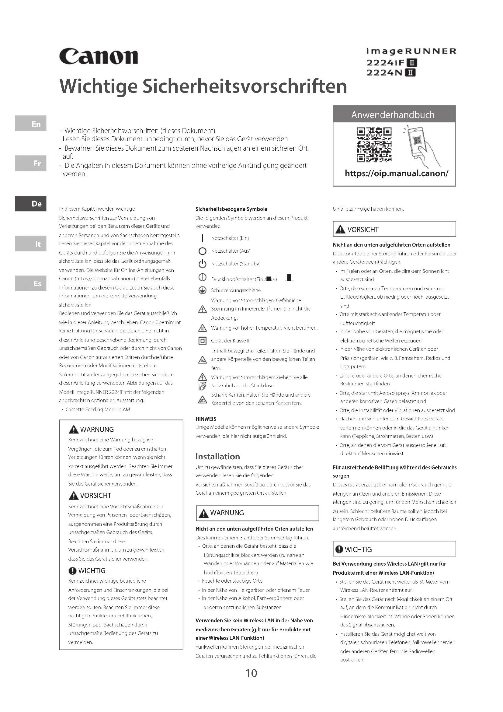 EsWichtige Sicherheitsvorschriften In diesem Kapitel werden wichtige Sicherheitsvorschriften zur Vermeidung von Verletzungen bei den Benutzern dieses Geräts und anderen Personen und von Sachschäden bereitgestellt. Lesen Sie dieses Kapitel vor der Inbetriebnahme des Geräts durch und befolgen Sie die Anweisungen, um sicherzustellen, dass Sie das Gerät ordnungsgemäß verwenden. Die Website für Online-Anleitungen von Canon (https://oip.manual.canon/) bietet ebenfalls Informationen zu diesem Gerät. Lesen Sie auch diese Informationen, um die korrekte Verwendung sicherzustellen. Bedienen und verwenden Sie das Gerät ausschließlich wie in dieser Anleitung beschrieben. Canon übernimmt keine Haftung für Schäden, die durch eine nicht in dieser Anleitung beschriebene Bedienung, durch unsachgemäßen Gebrauch oder durch nicht von Canon oder von Canon autorisierten Dritten durchgeführte Reparaturen oder Modifikationen entstehen.Sofern nicht anders angegeben, beziehen sich die in dieser Anleitung verwendeten Abbildungen auf das Modell imageRUNNER 2224iF mit der folgenden angebrachten optionalen Ausstattung:• Cassette Feeding Module AM WARNUNG Kennzeichnet eine Warnung bezüglich Vorgängen, die zum Tod oder zu ernsthaften Verletzungen führen können, wenn sie nicht korrekt ausgeführt werden. Beachten Sie immer diese Warnhinweise, um zu gewährleisten, dass Sie das Gerät sicher verwenden. VORSICHT Kennzeichnet eine Vorsichtsmaßnahme zur Vermeidung von Personen- oder Sachschäden, ausgenommen eine Produktstörung durch unsachgemäßen Gebrauch des Geräts. Beachten Sie immer diese Vorsichtsmaßnahmen, um zu gewährleisten, dass Sie das Gerät sicher verwenden. WICHTIG Kennzeichnet wichtige betriebliche Anforderungen und Einschränkungen, die bei der Verwendung dieses Geräts stets beachtet werden sollten. Beachten Sie immer diese wichtigen Punkte, um Fehlfunktionen, Störungen oder Sachschäden durch unsachgemäße Bedienung des Geräts zu vermeiden.Sicherheitsbezogene SymboleDie folgenden Symbole werden an diesem Produkt verwendet:Netzschalter (Ein)Netzschalter (Aus)Netzschalter (Standby)Druckknopfschalter (Ein /Aus )SchutzerdungsschieneWarnung vor Stromschlägen: Gefährliche Spannung im Inneren. Entfernen Sie nicht die Abdeckung.Warnung vor hoher Temperatur. Nicht berühren.Gerät der Klasse IIEnthält bewegliche Teile. Halten Sie Hände und andere Körperteile von den beweglichen Teilen fern.Warnung vor Stromschlägen: Ziehen Sie alle Netzkabel aus der Steckdose.Scharfe Kanten. Halten Sie Hände und andere Körperteile von den scharfen Kanten fern.HINWEISEinige Modelle können möglicherweise andere Symbole verwenden, die hier nicht aufgeführt sind. Installation Um zu gewährleisten, dass Sie dieses Gerät sicher verwenden, lesen Sie die folgenden Vorsichtsmaßnahmen sorgfältig durch, bevor Sie das Gerät an einem geeigneten Ort aufstellen. WARNUNG Nicht an den unten aufgeführten Orten aufstellenDies kann zu einem Brand oder Stromschlag führen.• Orte, an denen die Gefahr besteht, dass die Lüftungsschlitze blockiert werden (zu nahe an Wänden oder Vorhängen oder auf Materialien wie hochorigen Teppichen)• Feuchte oder staubige Orte• In der Nähe von Heizgeräten oder oenem Feuer• In der Nähe von Alkohol, Farbverdünnern oder anderen entzündlichen SubstanzenVerwenden Sie kein Wireless LAN in der Nähe von medizinischen Geräten (gilt nur für Produkte mit einer Wireless LAN-Funktion)Funkwellen können Störungen bei medizinischen Geräten verursachen und zu Fehlfunktionen führen, die Unfälle zur Folge haben können. VORSICHT Nicht an den unten aufgeführten Orten aufstellenDies könnte zu einer Störung führen oder Personen oder andere Geräte beeinträchtigen.• Im Freien oder an Orten, die direktem Sonnenlicht ausgesetzt sind• Orte, die extremen Temperaturen und extremer Luftfeuchtigkeit, ob niedrig oder hoch, ausgesetzt sind