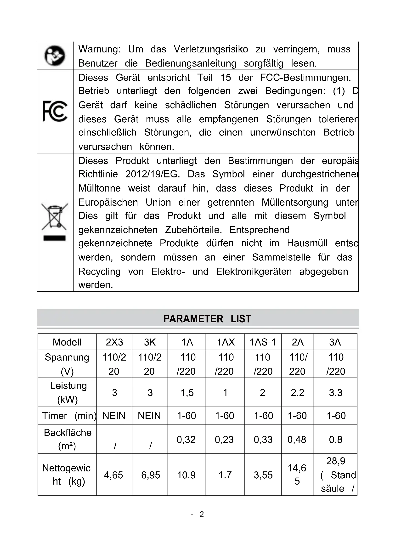 SHUNSHUN GmbH Römeräcker 9 Z2021,76351 Linkenheim-Hochstetten, Germany euvertreter@gmail.com +49 1727041930Technique Certificat d'assistance et de garantie électronique www.vevor.com/supportTechnisch Support und E-Garantie-Zertifikat www.vevor.com/support INFRAROT-LACKIERLAMPE MODELL: 2X3, 3K, 1A, 1AX, 1AS-1, 2A, 3A We continue to be committed to provide you tools with competitive price. "Save Half", "Half Price" or any other similar expressions used by us only represents an estimate of savings you might benefit from buying certain tools with us compared to the major top brands and does not necessarily mean to cover all categories of tools offered by us. You are kindly reminded to verify carefully when you are placing an order with us if you are actually saving half in comparison with the top major brands.- 1 - MODELL: 2X3, 3K, 1A, 1AX, 1AS-1, 2A, 3A Have product questions? Need technical support? Please feel free to contact us: Technical Support and E-Warranty Certificate www.vevor.com/support NEED HELP? CONTACT US! This is the original instruction, please read all manual instructions carefully before operating. VEVOR reserves a clear interpretation of our user manual. The appearance of the product shall be subject to the product you received. Please forgive us that we won't inform you again if there are any technology or software updates on our product. Infrared Paint Lamp- 2 - Warnung: Um das Verletzungsrisiko zu verringern, muss der Benutzer die Bedienungsanleitung sorgfältig lesen. Dieses Gerät entspricht Teil 15 der FCC-Bestimmungen. Der Betrieb unterliegt den folgenden zwei Bedingungen: (1) Dieses Gerät darf keine schädlichen Störungen verursachen und (2) dieses Gerät muss alle empfangenen Störungen tolerieren, einschließlich Störungen, die einen unerwünschten Betrieb verursachen können. Dieses Produkt unterliegt den Bestimmungen der europäischen Richtlinie 2012/19/EG. Das Symbol einer durchgestrichenen Mülltonne weist darauf hin, dass dieses Produkt in der Europäischen Union einer getrennten Müllentsorgung unterliegt. Dies gilt für das Produkt und alle mit diesem Symbol gekennzeichneten Zubehörteile. Entsprechend gekennzeichnete Produkte dürfen nicht im Hausmüll entsorgt werden, sondern müssen an einer Sammelstelle für das Recycling von Elektro- und Elektronikgeräten abgegeben werden. PARAMETER LIST Modell 2X3