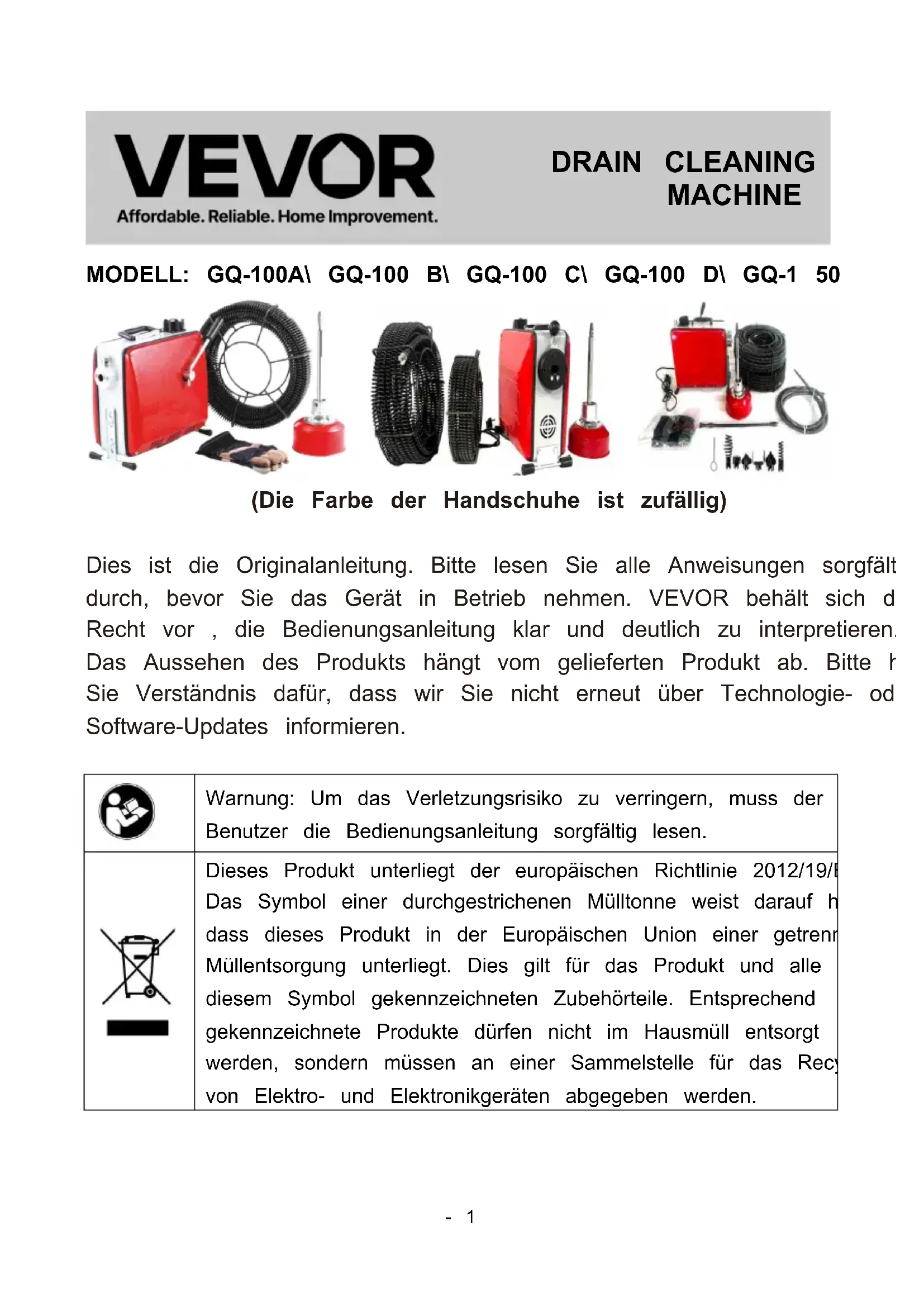 GQ-100 B GQ-100 C GQ-100 D GQ-150- 1 - MODELL: GQ-100A\ GQ-100 B\ GQ-100 C\ GQ-100 D\ GQ-1 50 (Die Farbe der Handschuhe ist zufällig) Dies ist die Originalanleitung. Bitte lesen Sie alle Anweisungen sorgfältig durch, bevor Sie das Gerät in Betrieb nehmen. VEVOR behält sich das Recht vor , die Bedienungsanleitung klar und deutlich zu interpretieren. Das Aussehen des Produkts hängt vom gelieferten Produkt ab. Bitte haben Sie Verständnis dafür, dass wir Sie nicht erneut über Technologie- oder Software-Updates informieren. Warnung: Um das Verletzungsrisiko zu verringern, muss der Benutzer die Bedienungsanleitung sorgfältig lesen. Dieses Produkt unterliegt der europäischen Richtlinie 2012/19/EG. Das Symbol einer durchgestrichenen Mülltonne weist darauf hin, dass dieses Produkt in der Europäischen Union einer getrennten Müllentsorgung unterliegt. Dies gilt für das Produkt und alle mit diesem Symbol gekennzeichneten Zubehörteile. Entsprechend gekennzeichnete Produkte dürfen nicht im Hausmüll entsorgt werden, sondern müssen an einer Sammelstelle für das Recycling von Elektro- und Elektronikgeräten abgegeben werden. DRAIN CLEANING MACHINE- 2 - Dieses Symbol weist darauf hin, dass Sie beim Gebrauch der Maschine immer eine Schutzbrille mit Schutzplatten und Augenschutzfunktion tragen müssen, um das Risiko von Augenverletzungen zu verringern. Dieses Symbol weist auf die Gefahr hin, dass Hände, Finger oder andere Körperteile im Kabel der Baggermaschine eingeklemmt werden können. Das Symbol weist auf die Gefahr hin, die durch den Eingriff in den Riemen und die Riemenscheibe entsteht. Das Symbol weist auf die Gefahr eines Stromschlags hin. ANWEISUNGEN Sicherheitshinweise Bitte lesen Sie alle Sicherheitshinweise und Anweisungen sorgfältig durch. Die Nichtbeachtung dieser Sicherheitshinweise kann zu Stromschlägen, Bränden oder schweren Verletzungen führen. Bitte bewahren Sie diese Sicherheitshinweise und Anweisungen sorgfältig auf. Sicherheitsvorkehrungen am Arbeitsplatz