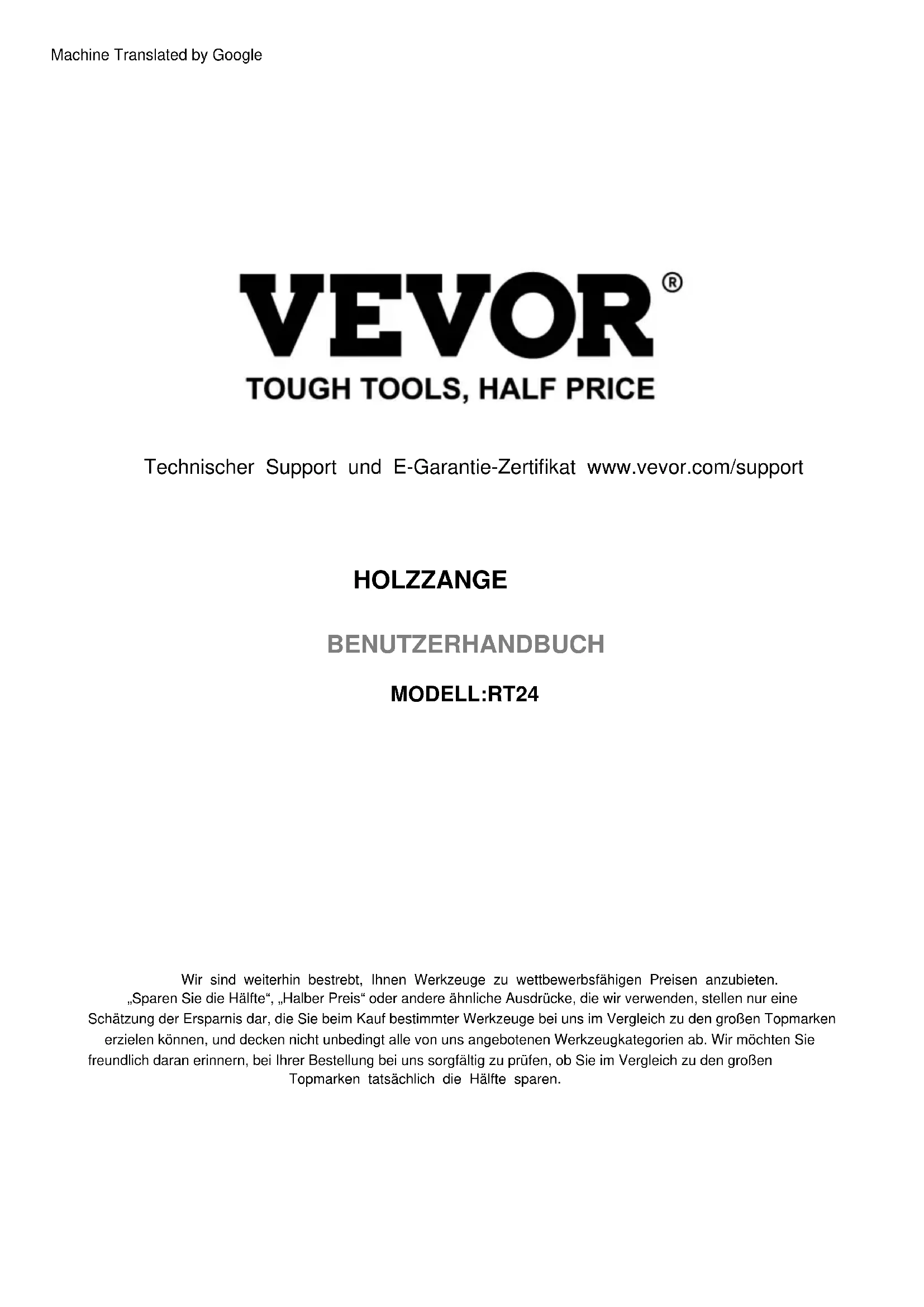 ASSEMBLY STEP5 Do not lock the 3 screws(In-circle markings) completely, and leave some clearance to allow the parts to rotate flexibly.6 PRODUCT PARAMETER Do not exceed specified weight capacities. Manufacturer:Shanghaimuxinmuyeyouxiangongsi Address:Shuangchenglu803nong11hao1602A-1609shi,baoshanqu, shanghai200000CN. ECREP:E-CrossStuGmbH. MainzerLandstr.69,60329FrankfurtamMain. UKREP:YHCONSULTINGLIMITED. C/OYHConsultingLimitedOffice147,CenturionHouse,LondonRoad, Staines-upon-Thames,Surrey,TW184AX ImportedtoAUS:SIHAOPTYLTD. 1ROKEVASTREETEASTWOODNSW2122Australia ImportedtoUSA:SanvenTechnologyLtd. Suite250,9166AnaheimPlace,RanchoCucamonga,CA91730 Model RT24 Safe Loading Weight(Static) 1100lb(500kg) Safe Loading Weight(Dynamic) 900lb(408kg) Maximum gripping size 24in(609mm) Colour OrangeTechnical Support and E-Warranty Certificate www.vevor.com/supportMODELL:RT24 „Sparen Sie die Hälfte“, „Halber Preis“ oder andere ähnliche Ausdrücke, die wir verwenden, stellen nur eine Schätzung der Ersparnis dar, die Sie beim Kauf bestimmter Werkzeuge bei uns im Vergleich zu den großen Topmarken erzielen können, und decken nicht unbedingt alle von uns angebotenen Werkzeugkategorien ab. Wir möchten Sie freundlich daran erinnern, bei Ihrer Bestellung bei uns sorgfältig zu prüfen, ob Sie im Vergleich zu den großen Topmarken tatsächlich die Hälfte sparen. Wir sind weiterhin bestrebt, Ihnen Werkzeuge zu wettbewerbsfähigen Preisen anzubieten. HOLZZANGE BENUTZERHANDBUCH Technischer Support und E-Garantie-Zertifikat www.vevor.com/support Machine Translated by GoogleMODELL:RT24 Dies ist die Originalanleitung. Bitte lesen Sie alle Anweisungen sorgfältig durch, bevor Sie das Gerät in Betrieb nehmen. VEVOR behält sich eine klare Auslegung unserer Bedienungsanleitung vor. Das Erscheinungsbild des Produkts richtet sich nach dem Produkt, das Sie erhalten haben. Bitte verzeihen Sie uns, dass wir Sie nicht erneut informieren, wenn es Technologie- oder Software-Updates für unser Produkt gibt. Brauchen Sie Hilfe? Kontaktieren Sie uns! Haben Sie Fragen zum Produkt? Benötigen Sie technischen Support? Bitte kontaktieren Sie uns: Technischer Support und E-Garantie-Zertifikat www.vevor.com/support HOLZZANGE