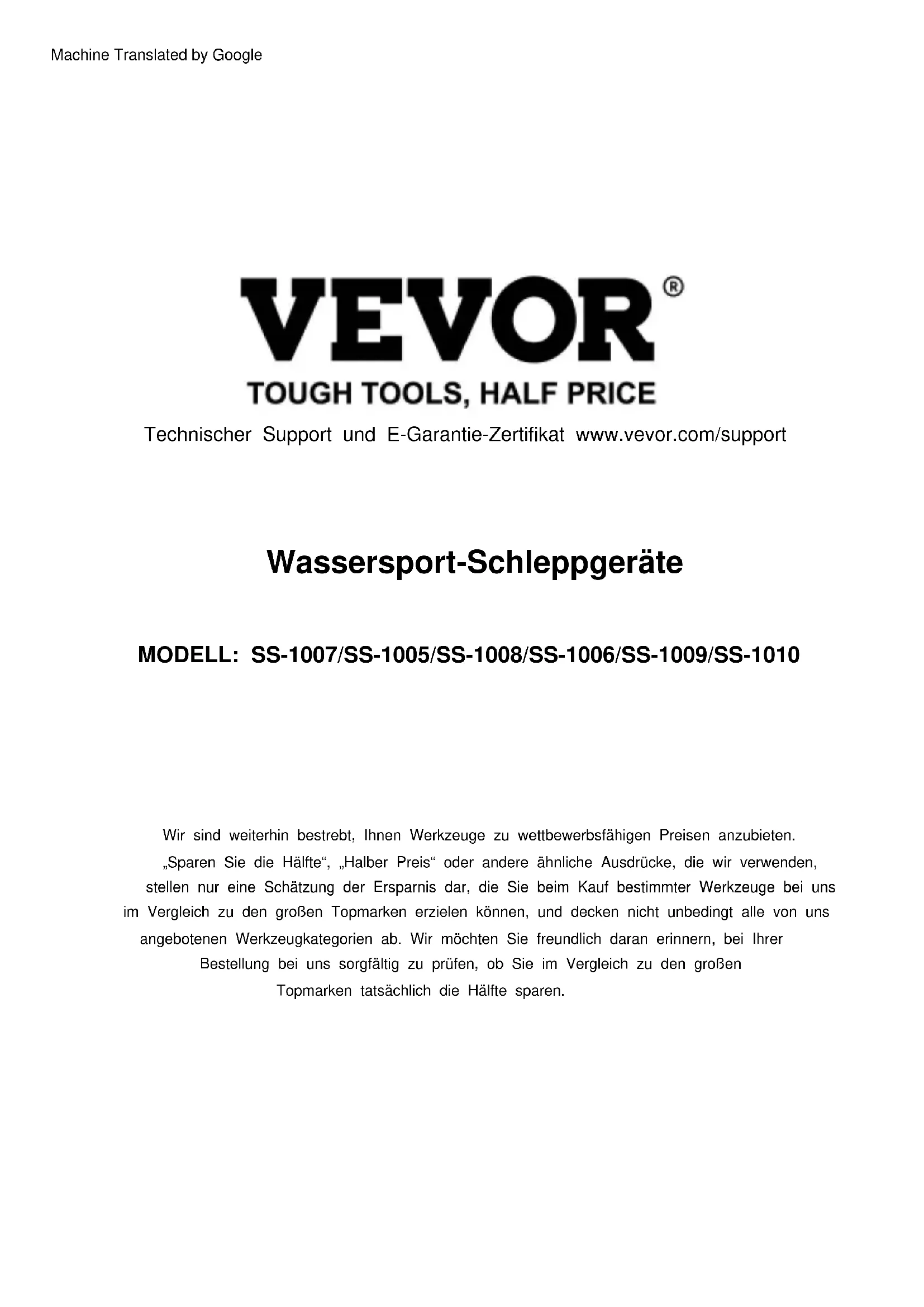 Assistancetechniqueetcertificatdegarantieélectronique www.vevor.com/support TOUTESLESINSTANCESDERISQUEOUDEDANGER.VEUILLEZFAIREPREUVEDEBONSENSET REPRÉSENTANTDUROYAUMEUNI REPRÉSENTANTDELACE Machine Translated by GoogleMODELL: SS-1007/SS-1005/SS-1008/SS-1006/SS-1009/SS-1010 „Sparen Sie die Hälfte“, „Halber Preis“ oder andere ähnliche Ausdrücke, die wir verwenden, stellen nur eine Schätzung der Ersparnis dar, die Sie beim Kauf bestimmter Werkzeuge bei uns im Vergleich zu den großen Topmarken erzielen können, und decken nicht unbedingt alle von uns angebotenen Werkzeugkategorien ab. Wir möchten Sie freundlich daran erinnern, bei Ihrer Bestellung bei uns sorgfältig zu prüfen, ob Sie im Vergleich zu den großen Topmarken tatsächlich die Hälfte sparen. Wir sind weiterhin bestrebt, Ihnen Werkzeuge zu wettbewerbsfähigen Preisen anzubieten. Wassersport-Schleppgeräte Technischer Support und E-Garantie-Zertifikat www.vevor.com/support Machine Translated by GoogleTechnischer Support und E-Garantie-Zertifikat www.vevor.com/support