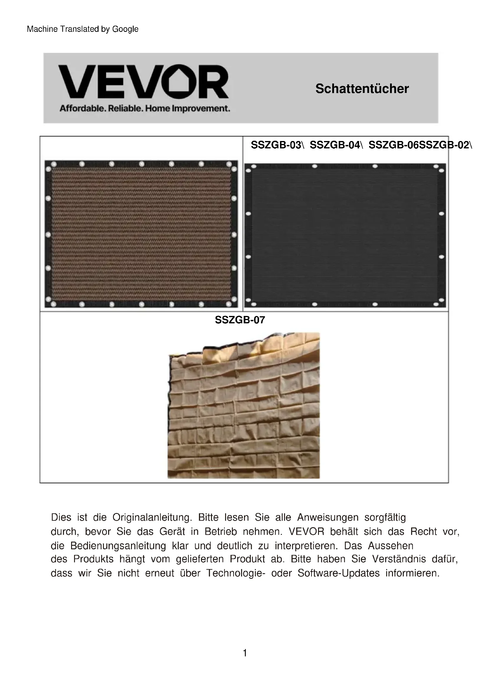 Schattentücher Technischer Support und E-Garantie-Zertifikat www.vevor.com/support Machine Translated by GoogleSSZGB-07 Dies ist die Originalanleitung. Bitte lesen Sie alle Anweisungen sorgfältig durch, bevor Sie das Gerät in Betrieb nehmen. VEVOR behält sich das Recht vor, die Bedienungsanleitung klar und deutlich zu interpretieren. Das Aussehen des Produkts hängt vom gelieferten Produkt ab. Bitte haben Sie Verständnis dafür, dass wir Sie nicht erneut über Technologie- oder Software-Updates informieren.