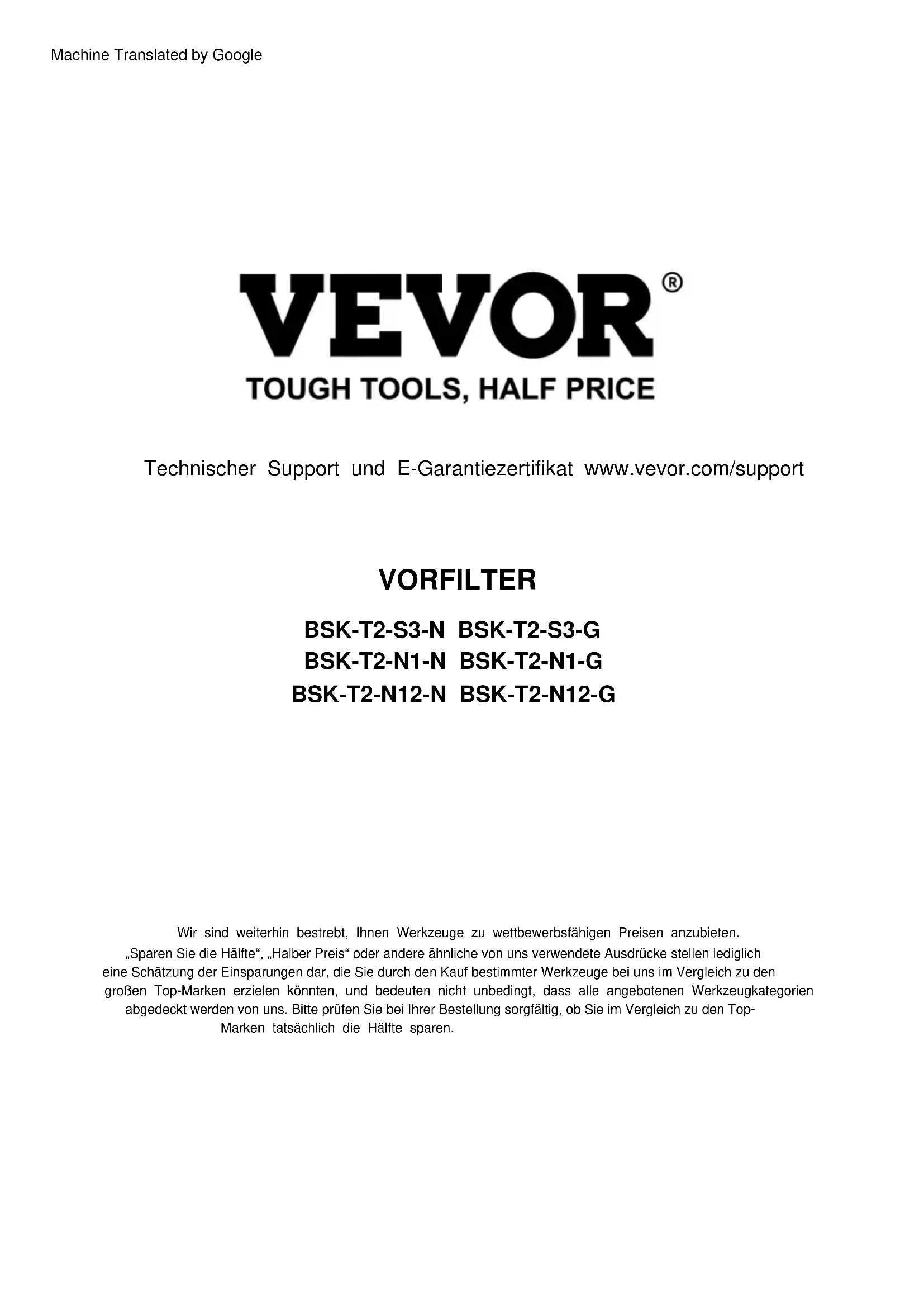 Wir sind weiterhin bestrebt, Ihnen Werkzeuge zu wettbewerbsfähigen Preisen anzubieten. „Sparen Sie die Hälfte“, „Halber Preis“ oder andere ähnliche von uns verwendete Ausdrücke stellen lediglich eine Schätzung der Einsparungen dar, die Sie durch den Kauf bestimmter Werkzeuge bei uns im Vergleich zu den großen Top-Marken erzielen könnten, und bedeuten nicht unbedingt, dass alle angebotenen Werkzeugkategorien abgedeckt werden von uns. Bitte prüfen Sie bei Ihrer Bestellung sorgfältig, ob Sie im Vergleich zu den Top- Marken tatsächlich die Hälfte sparen. VORFILTER Technischer Support und E-Garantiezertifikat www.vevor.com/support Machine Translated by GoogleDies ist die Originalanleitung. Bitte lesen Sie alle Bedienungsanleitungen sorgfältig durch, bevor Sie das Gerät in Betrieb nehmen. VEVOR behält sich eine klare Auslegung unserer Bedienungsanleitung vor. Das Aussehen des Produkts hängt von dem Produkt ab, das Sie erhalten haben. Bitte entschuldigen Sie, dass wir Sie nicht erneut informieren, wenn es zu unserem Produkt technische oder Software-Updates gibt. Haben Sie Fragen zum Produkt? Benötigen Sie technische Unterstützung? Bitte kontaktieren Sie uns: Technischer Support und E-Garantiezertifikat www.vevor.com/ support
