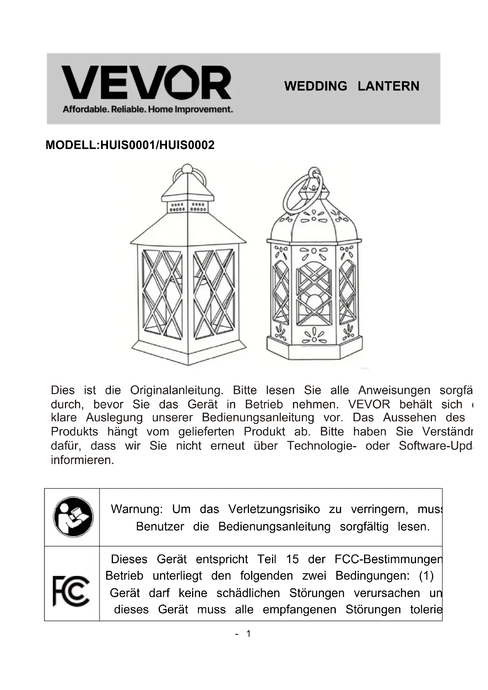 Dies ist die Originalanleitung. Bitte lesen Sie alle Anweisungen sorgfältig durch, bevor Sie das Gerät in Betrieb nehmen. VEVOR behält sich eine klare Auslegung unserer Bedienungsanleitung vor. Das Aussehen des Produkts hängt vom gelieferten Produkt ab. Bitte haben Sie Verständnis dafür, dass wir Sie nicht erneut über Technologie- oder Software-Updates informieren. Warnung: Um das Verletzungsrisiko zu verringern, muss der Benutzer die Bedienungsanleitung sorgfältig lesen. Dieses Gerät entspricht Teil 15 der FCC-Bestimmungen. Der Betrieb unterliegt den folgenden zwei Bedingungen: (1) Dieses Gerät darf keine schädlichen Störungen verursachen und (2) dieses Gerät muss alle empfangenen Störungen tolerieren, WEDDING LANTERN- 2 - einschließlich Störungen, die einen unerwünschten Betrieb verursachen können. Dieses Produkt unterliegt den Bestimmungen der europäischen Richtlinie 2012/19/EG. Das Symbol einer durchgestrichenen Mülltonne weist darauf hin, dass dieses Produkt in der Europäischen Union einer getrennten Müllentsorgung unterliegt. Dies gilt für das Produkt und alle mit diesem Symbol gekennzeichneten Zubehörteile. Entsprechend gekennzeichnete Produkte dürfen nicht im Hausmüll entsorgt werden, sondern müssen an einer Sammelstelle für das Recycling von Elektro- und Elektronikgeräten abgegeben werden. INSTRUCTIONS Vielen Dank, dass Sie sich für diese Hochzeitslaterne entschieden haben Bitte lesen Sie vor der Anwendung alle Anweisungen. Die Informationen helfen Ihnen, die bestmöglichen Ergebnisse zu erzielen. VORSICHT :