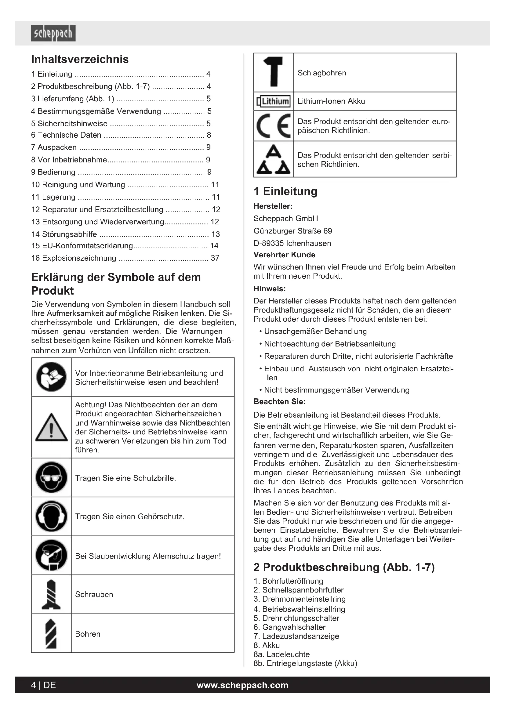 - 16 Explosionszeichnung Erklärung der Symbole auf dem Produkt Die Verwendung von Symbolen in diesem Handbuch soll Ihre Aufmerksamkeit auf mögliche Risiken lenken. Die Si- cherheitssymbole und Erklärungen, die diese begleiten, müssen genau verstanden werden. Die Warnungen selbst beseitigen keine Risiken und können korrekte Maß- nahmen zum Verhüten von Unfällen nicht ersetzen. Vor Inbetriebnahme Betriebsanleitung und Sicherheitshinweise lesen und beachten! Achtung! Das Nichtbeachten der an dem Produkt angebrachten Sicherheitszeichen und Warnhinweise sowie das Nichtbeachten der Sicherheits- und Betriebshinweise kann zu schweren Verletzungen bis hin zum Tod führen. Tragen Sie eine Schutzbrille. Tragen Sie einen Gehörschutz. Bei Staubentwicklung Atemschutz tragen! Schrauben Bohren Schlagbohren Lithium-Ionen Akku Das Produkt entspricht den geltenden euro- päischen Richtlinien. Das Produkt entspricht den geltenden serbi- schen Richtlinien. 1 Einleitung Hersteller: Scheppach GmbH Günzburger Straße 69 D-89335 Ichenhausen Verehrter Kunde Wir wünschen Ihnen viel Freude und Erfolg beim Arbeiten mit Ihrem neuen Produkt. Hinweis: Der Hersteller dieses Produkts haftet nach dem geltenden Produkthaftungsgesetz nicht für Schäden, die an diesem Produkt oder durch dieses Produkt entstehen bei: p. 37