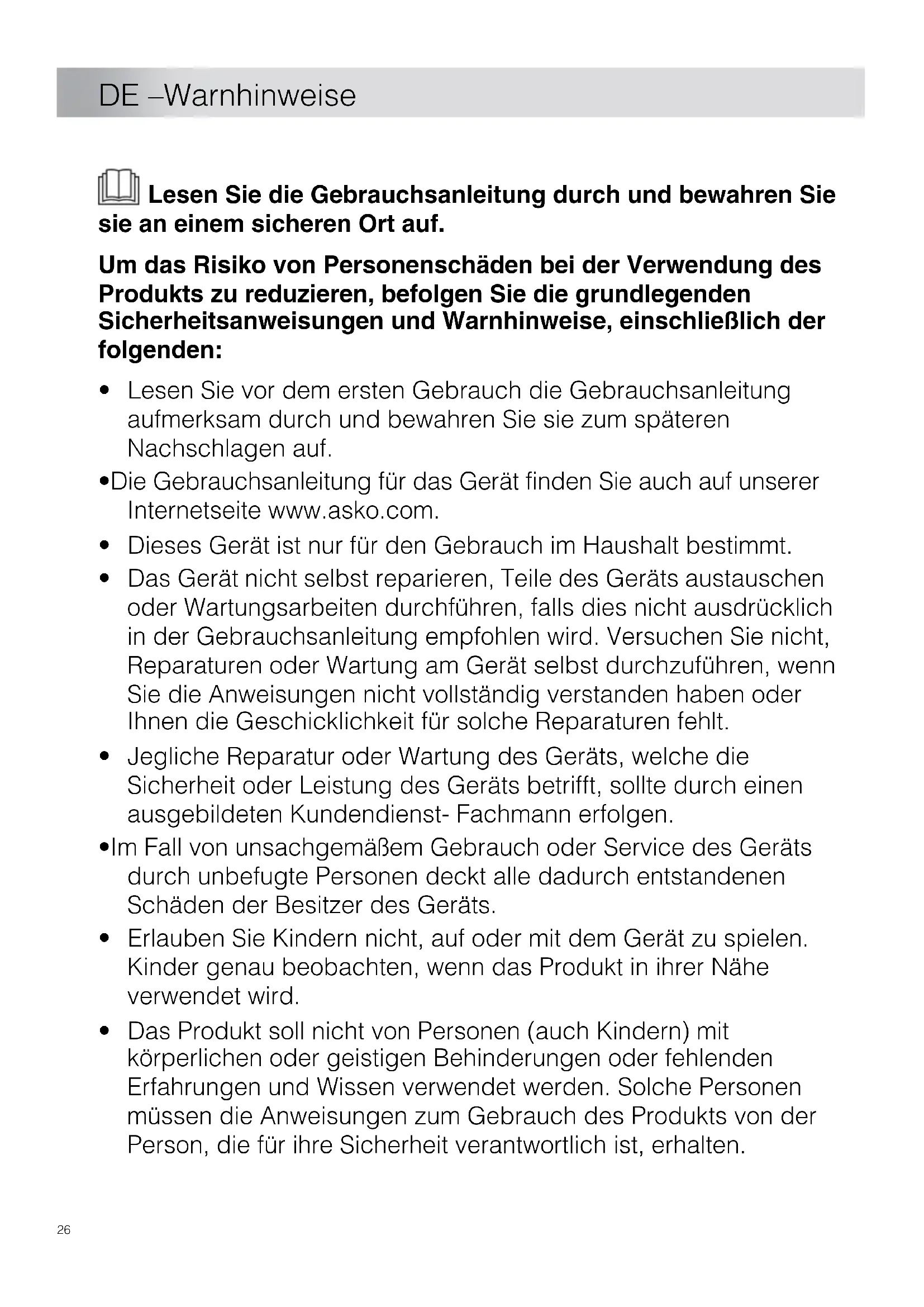- Die Gebrauchsanleitung für das Gerät finden Sie auch auf unserer Internetseite www.asko.com.