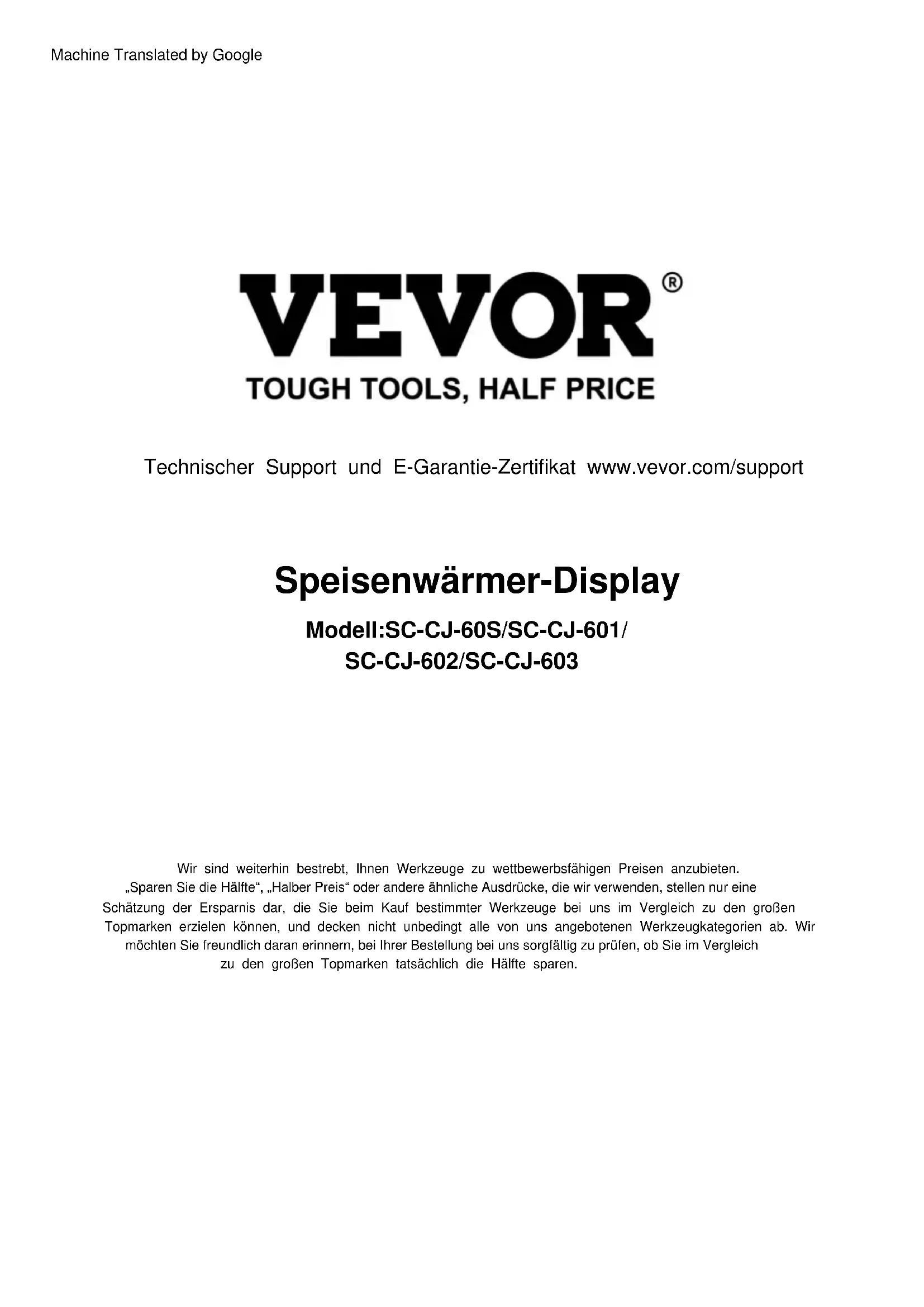 Machine Translated by GoogleMachine Translated by GoogleAssistancetechniqueetcertificatdegarantie électroniquewww.vevor.com/support Machine Translated by GoogleSpeisenwärmer-Display „Sparen Sie die Hälfte“, „Halber Preis“ oder andere ähnliche Ausdrücke, die wir verwenden, stellen nur eine Schätzung der Ersparnis dar, die Sie beim Kauf bestimmter Werkzeuge bei uns im Vergleich zu den großen Topmarken erzielen können, und decken nicht unbedingt alle von uns angebotenen Werkzeugkategorien ab. Wir möchten Sie freundlich daran erinnern, bei Ihrer Bestellung bei uns sorgfältig zu prüfen, ob Sie im Vergleich zu den großen Topmarken tatsächlich die Hälfte sparen. Wir sind weiterhin bestrebt, Ihnen Werkzeuge zu wettbewerbsfähigen Preisen anzubieten. Modell:SC-CJ-60S/SC-CJ-601/ SC-CJ-602/SC-CJ-603 Technischer Support und E-Garantie-Zertifikat www.vevor.com/support Machine Translated by GoogleMachine Translated by Google- 1 - Haben Sie Fragen zum Produkt? Benötigen Sie technischen Support? Bitte kontaktieren Sie uns: Technischer Support und E-Garantie-Zertifikat www.vevor.com/ support SC-CJ-603 SC-CJ-601 Dies ist die Originalanleitung. Bitte lesen Sie alle Anweisungen sorgfältig durch, bevor Sie das Gerät in Betrieb nehmen. VEVOR behält sich eine klare Auslegung unserer Bedienungsanleitung vor. Das Erscheinungsbild des Produkts richtet sich nach dem Produkt, das Sie erhalten haben. Bitte verzeihen Sie uns, dass wir Sie nicht erneut informieren, wenn es Technologie- oder Software-Updates für unser Produkt gibt.