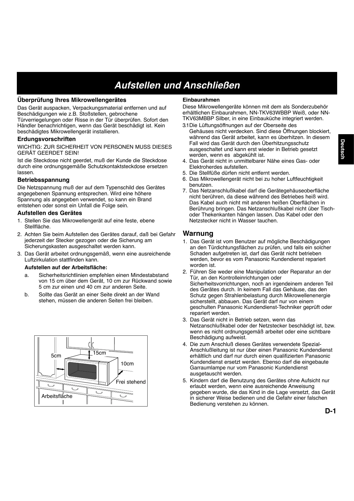Si vous souhaitez encastrer le four, utilisez le kit d’encastrement NN-TKV63WBBP (blanc) ou NN-TKV63MBBP (argentée) disponible auprès de votre revendeur Panasonic local. 4. Ne placez pas le four à proximité d’une cuisinière au gaz ou électrique. 5. Ne retirez pas les pieds du four. 6. Ce four est destiné uniquement à usage domestique. Ne l’utilisez pas à l’extérieur. 7. N’utilisez pas le four dans une pièce dont le taux d’humidité est très élevé. 8. Evitez tout contact entre le cordon d’alimentation et l’extérieur de l’appareil et éloignez-le de toute surface chaude. Ne le laissez pas pendre sur le bord d’une table ou d’un plan de travail. Evitez de mouiller le cordon d’alimentation, la prise ou le four. 9. N’obstruez pas les ouvertures d’aération situées en haut et à l’arrière du four de manière à éviter toute surchauffe du four. Un dispositif thermique de sécurité protège le four en cas de surchauffe. S’il s’enclenche, le four ne pourra fonctionner à nouveau qu’après refroidissement.