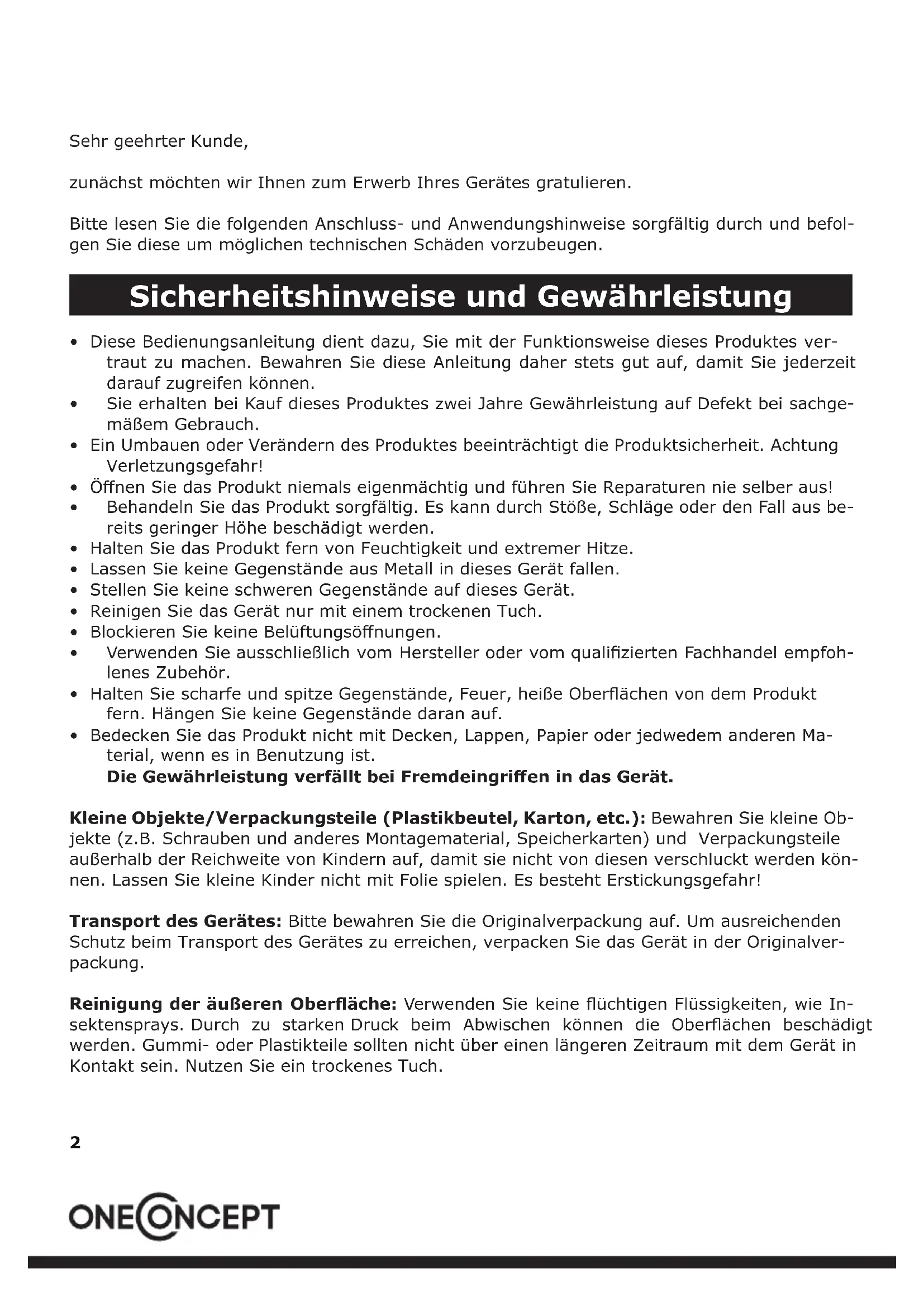 - Bedecken Sie das Produkt nicht mit Decken, Lappen, Papier oder jedwedem anderen Ma- terial, wenn es in Benutzung ist. Die Gewährleistung verfällt bei Fremdeingrien in das Gerät. Kleine Objekte/Verpackungsteile (Plastikbeutel, Karton, etc.): Bewahren Sie kleine Ob- jekte (z.B. Schrauben und anderes Montagematerial, Speicherkarten) und Verpackungsteile außerhalb der Reichweite von Kindern auf, damit sie nicht von diesen verschluckt werden kön- nen. Lassen Sie kleine Kinder nicht mit Folie spielen. Es besteht Erstickungsgefahr! Transport des Gerätes: Bitte bewahren Sie die Originalverpackung auf. Um ausreichenden Schutz beim Transport des Gerätes zu erreichen, verpacken Sie das Gerät in der Originalver- packung. Reinigung der äußeren Oberäche: Verwenden Sie keine üchtigen Flüssigkeiten, wie In- sektensprays. Durch zu starken Druck beim Abwischen können die Oberächen beschädigt werden. Gummi- oder Plastikteile sollten nicht über einen längeren Zeitraum mit dem Gerät in Kontakt sein. Nutzen Sie ein trockenes Tuch.3 Aufbau