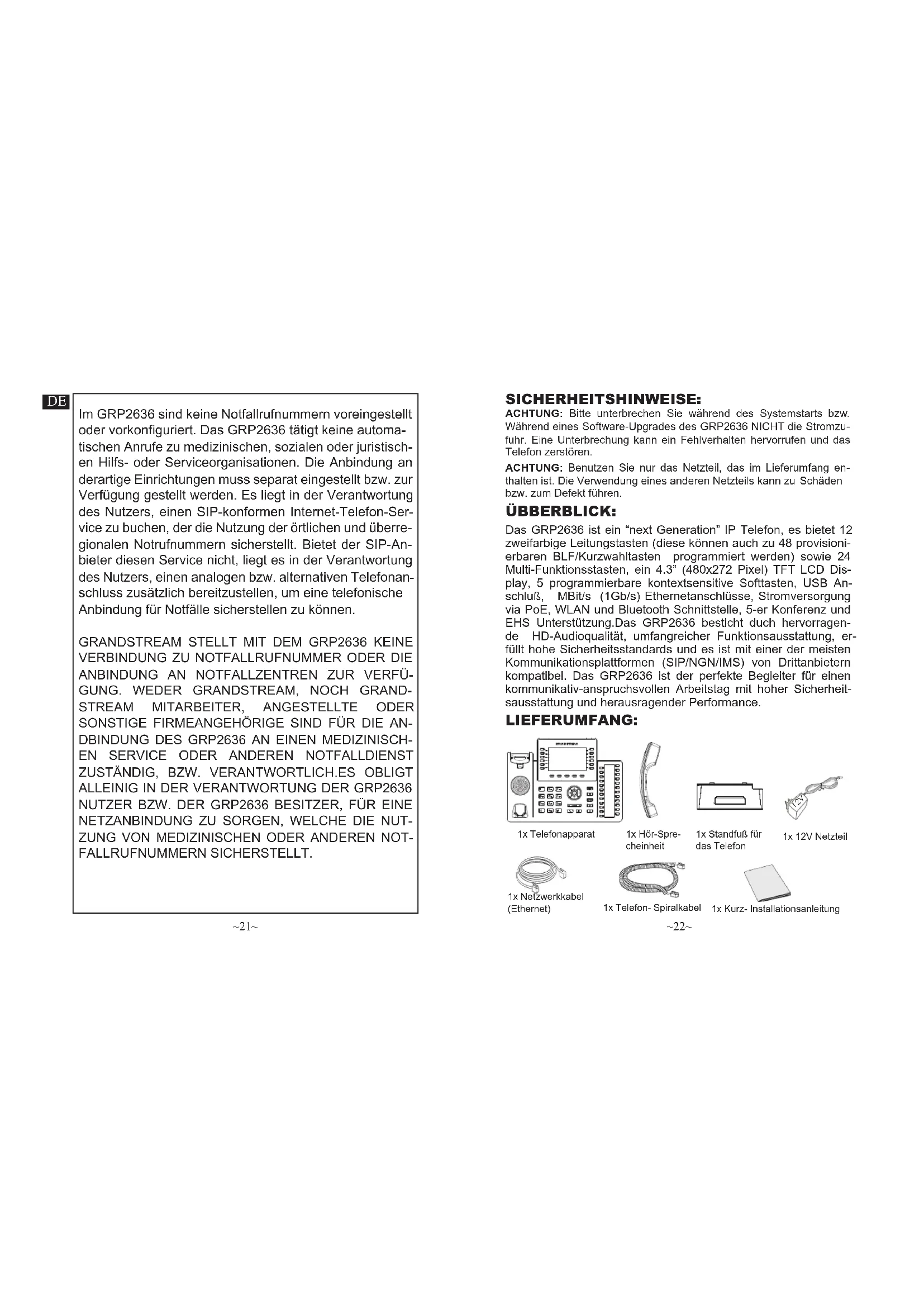 paramètres supplémentaires qui peuvent être nécessaires pour con- figurer le téléphone. Congurer le GRP2636 en utilisant le Clavier: CONFIGURATION DU TÉLÉPHONE: Congurer le GRP2636 en utilisant le Navigateur web: Veuillez télécharger le manuel d’utilisation et la FAQ pour plus de détails sur les instructions de configuration: https://www.grandstream.com/our-products Les termes de la licence GNU GPL sont incorporés dans le micrologiciel du périphérique et sont accessibles via l’interface utilisateur Web du périphéri- que à l’adresse http(s)://IP/gpl_license. Pour obtenir un CD contenant les informations du code source GPL, veuillez envoyer une demande écrite à info@grandstream.com~21~ ~22~ Im GRP2636 sind keine Notfallrufnummern voreingestellt oder vorkonfiguriert. Das GRP2636 tätigt keine automa- tischen Anrufe zu medizinischen, sozialen oder juristisch- en Hilfs- oder Serviceorganisationen. Die Anbindung an derartige Einrichtungen muss separat eingestellt bzw. zur Verfügung gestellt werden. Es liegt in der Verantwortung des Nutzers, einen SIP-konformen Internet-Telefon-Ser- vice zu buchen, der die Nutzung der örtlichen und überre- gionalen Notrufnummern sicherstellt. Bietet der SIP-An- bieter diesen Service nicht, liegt es in der Verantwortung des Nutzers, einen analogen bzw. alternativen Telefonan- schluss zusätzlich bereitzustellen, um eine telefonische Anbindung für Notfälle sicherstellen zu können.