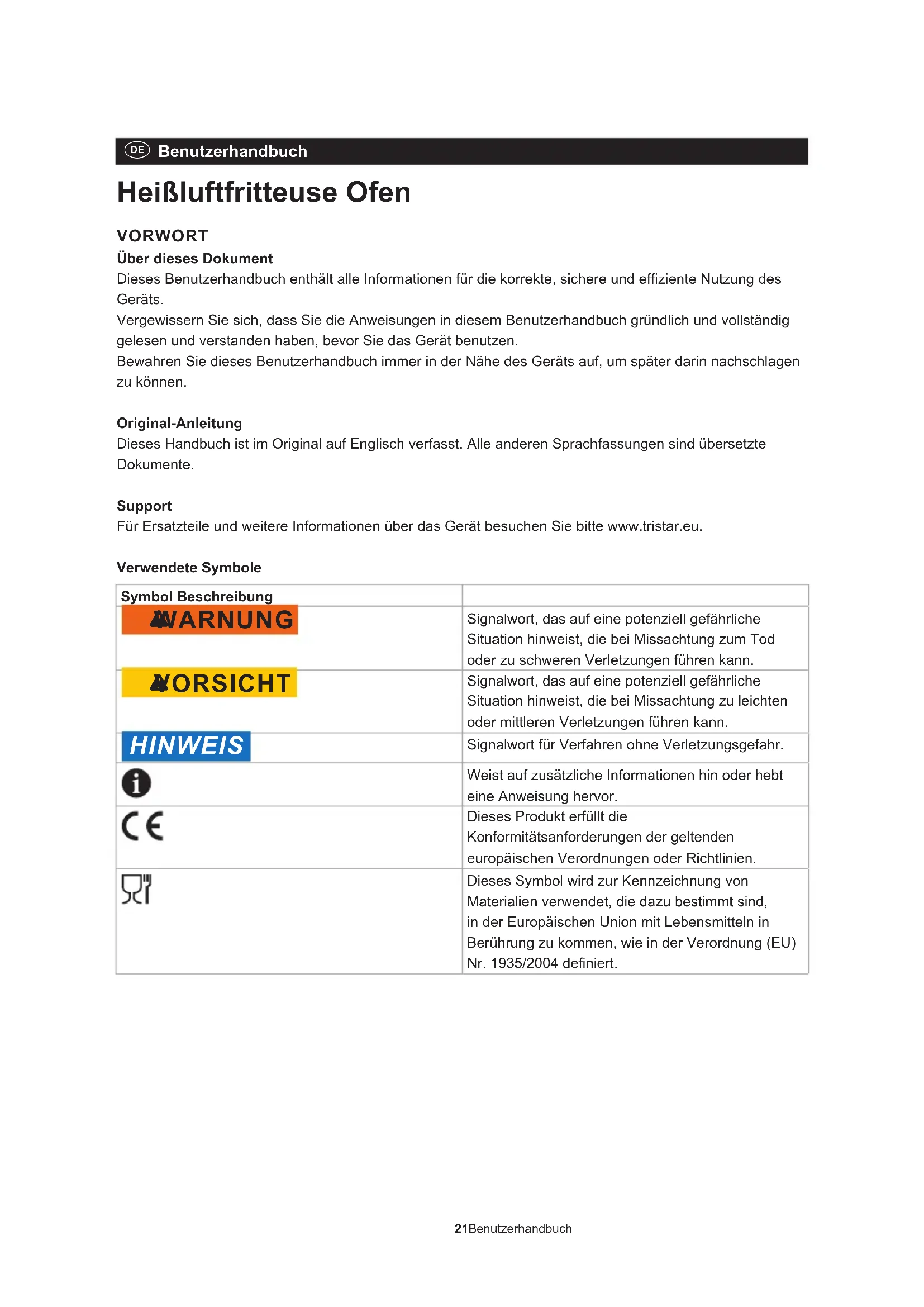 Benutzerhandbuch Heißluftfritteuse Ofen VORWORT Über dieses Dokument Dieses Benutzerhandbuch enthält alle Informationen für die korrekte, sichere und effiziente Nutzung des Geräts. Vergewissern Sie sich, dass Sie die Anweisungen in diesem Benutzerhandbuch gründlich und vollständig gelesen und verstanden haben, bevor Sie das Gerät benutzen. Bewahren Sie dieses Benutzerhandbuch immer in der Nähe des Geräts auf, um später darin nachschlagen zu können. Original-Anleitung Dieses Handbuch ist im Original auf Englisch verfasst. Alle anderen Sprachfassungen sind übersetzte Dokumente. Support Für Ersatzteile und weitere Informationen über das Gerät besuchen Sie bitte www.tristar.eu. Verwendete Symbole Symbol Beschreibung