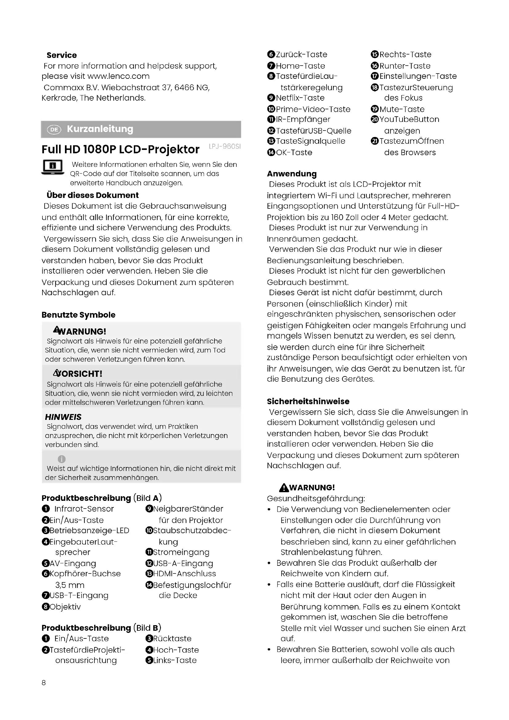 Kurzanleitung Full HD 1080P LCD-Projektor LPJ-960SI Weitere Informationen erhalten Sie, wenn Sie den QR-Code auf der Titelseite scannen, um das erweiterte Handbuch anzuzeigen. Über dieses Dokument Dieses Dokument ist die Gebrauchsanweisung und enthält alle Informationen, für eine korrekte, effiziente und sichere Verwendung des Produkts. Vergewissern Sie sich, dass Sie die Anweisungen in diesem Dokument vollständig gelesen und verstanden haben, bevor Sie das Produkt installieren oder verwenden. Heben Sie die Verpackung und dieses Dokument zum späteren Nachschlagen auf. Benutzte Symbole WARNUNG! Signalwort als Hinweis für eine potenziell gefährliche Situation, die, wenn sie nicht vermieden wird, zum Tod oder schweren Verletzungen führen kann. 1 VORSICHT! Signalwort als Hinweis für eine potenziell gefährliche Situation, die, wenn sie nicht vermieden wird, zu leichten oder mittelschweren Verletzungen führen kann. HINWEIS Signalwort, das verwendet wird, um Praktiken anzusprechen, die nicht mit körperlichen Verletzungen verbunden sind. Weist auf wichtige Informationen hin, die nicht direkt mit der Sicherheit zusammenhängen. Produktbeschreibung (Bild A)