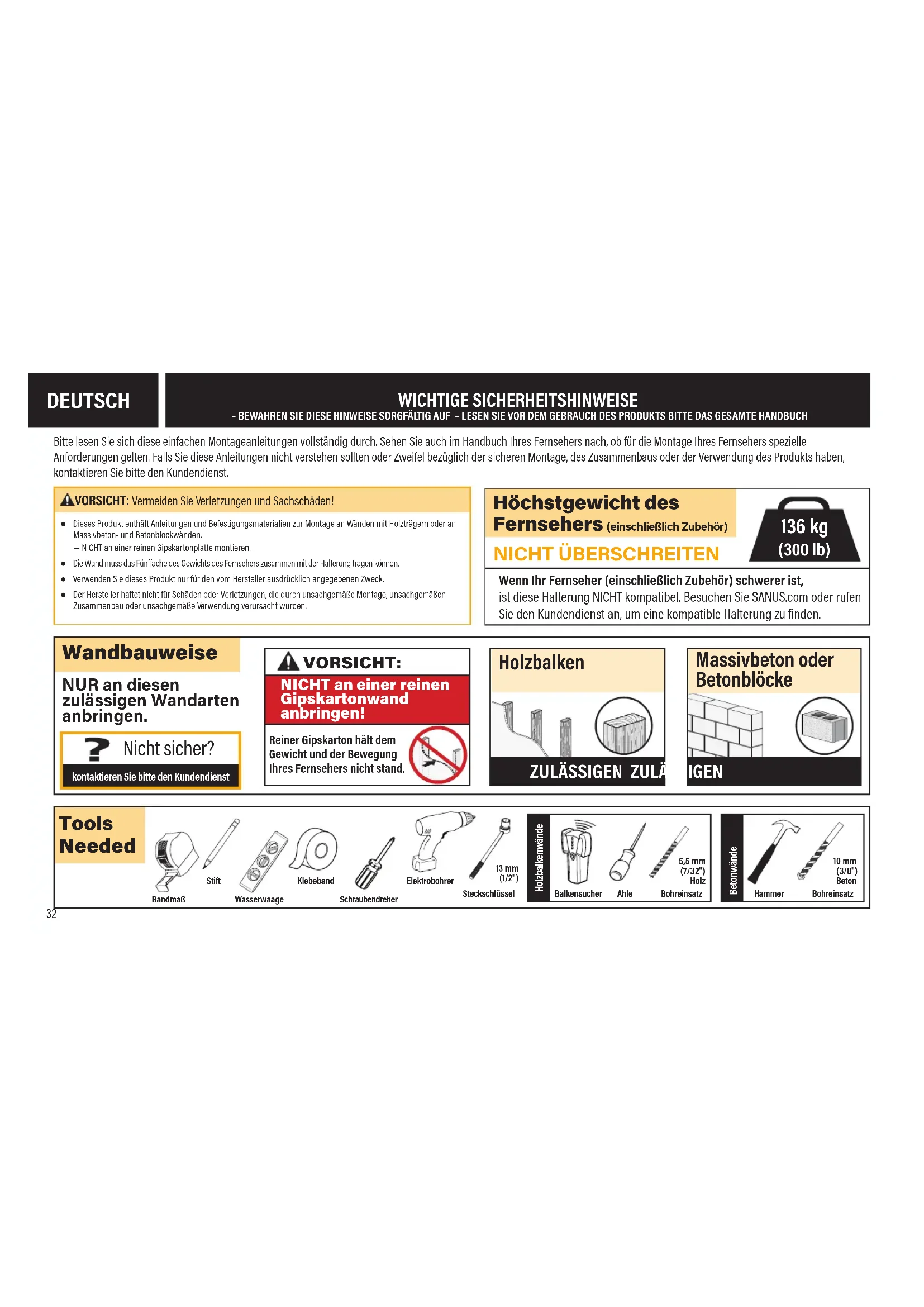 VORSICHT:NICHT an einer reinen Gipskartonwand anbringen! Wenn Ihr Fernseher (einschließlich Zubehör) schwerer ist, ist diese Halterung NICHT kompatibel. Besuchen Sie SANUS.com oder rufen Sie den Kundendienst an, um eine kompatible Halterung zu finden. Klebeband VORSICHT: Vermeiden Sie Verletzungen und Sachschäden! ● Dieses Produkt enthält Anleitungen und Befestigungsmaterialien zur Montage an Wänden mit Holzträgern oder an Massivbeton- und Betonblockwänden. — NICHT an einer reinen Gipskartonplatte montieren. ● Die Wand muss das Fünache des Gewichts des Fernsehers zusammen mit der Halterung tragen können. ● Verwenden Sie dieses Produkt nur für den vom Hersteller ausdrücklich angegebenen Zweck. ● Der Hersteller haftet nicht für Schäden oder Verletzungen, die durch unsachgemäße Montage, unsachgemäßen Zusammenbau oder unsachgemäße Verwendung verursacht wurden. Bitte lesen Sie sich diese einfachen Montageanleitungen vollständig durch. Sehen Sie auch im Handbuch Ihres Fernsehers nach, ob für die Montage Ihres Fernsehers spezielle Anforderungen gelten. Falls Sie diese Anleitungen nicht verstehen sollten oder Zweifel bezüglich der sicheren Montage, des Zusammenbaus oder der Verwendung des Produkts haben, kontaktieren Sie bitte den Kundendienst.Reiner Gipskarton hält dem Gewicht und der Bewegung Ihres Fernsehers nicht stand. 136 kg (300 lb) WICHTIGE SICHERHEITSHINWEISE – BEWAHREN SIE DIESE HINWEISE SORGFÄLTIG AUF – LESEN SIE VOR DEM GEBRAUCH DES PRODUKTS BITTE DAS GESAMTE HANDBUCH DEUTSCH 13mm (1/2") 5,5mm (7/32") Holz 10mm (3/8") Beton SchraubendreherBandmaß BohreinsatzBohreinsatz Elektrobohrer HammerSteckschlüssel Balkensucher Ahle Stift Wasserwaage Holzbalkenwände Betonwände33 Vorbereitung
