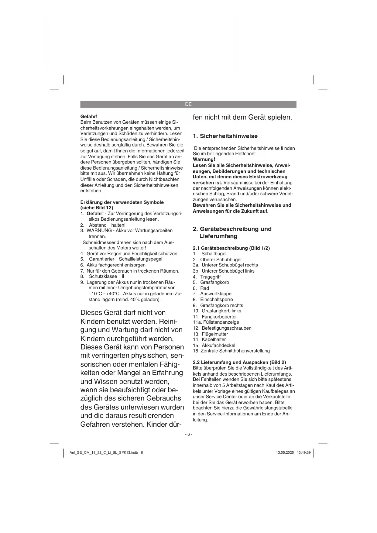 Fehler Mögliche Ursache Beseitigung Motor läuft nicht an a) Anschlüsse am Motor gelöst b) Gerät steht im hohen Gras c) Mähergehäuse verstopft d) Akku nicht korrekt eingesteckt a) Durch Kundendienstwerkstatt über- prüfen lassen b) Auf niedrigem Gras oder bereits gemähten Flächen starten; Eventuell Schnitthöhe ändern c) Gehäuse reinigen, damit das Messer frei läuft d) Akku entfernen und neu einstecken (siehe 5.) Motorleistung läßt nach a) Zu hohes oder zu feuchtes Gras b) Mähergehäuse verstopft c) Messer stark abgenutzt d) Akkukapazität lässt nach a) Schnitthöhe korrigieren b) Gehäuse reinigen c) Messer auswechseln d) Akkukapazität prüfen und gegebenenfalls Akku laden (siehe 5.) Unsauberer Schnitt a) Messer abgenutzt b) Falsche Schnitthöhe a) Messer auswechseln oder nachschleifen b) Schnitthöhe korrigieren Motor stoppt plötz- lich a) Überlastung des Akkus b) Akku leer a) Gerät aus- und wieder einschalten. Tritt dies öfter auf, Akku mit höherer Kapazität (Ah) verwenden b) Geladenen Akku verwenden Anl_GE_CM_18_32_C_Li_BL_SPK13.indb 14Anl_GE_CM_18_32_C_Li_BL_SPK13.indb 14 13.05.2025 13:49:4213.05.2025 13:49:42DE