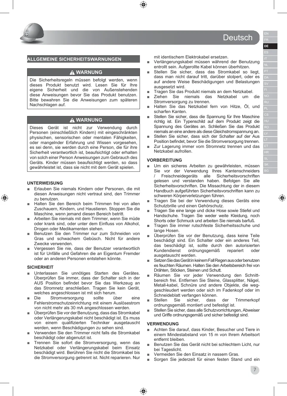 ALLGEMEINE SICHERHEITSWARNUNGEN WARNUNG Die Sicherheitsregeln müssen befolgt werden, wenn dieses Produkt benutzt wird. Lesen Sie für Ihre eigene Sicherheit und die von Außenstehenden diese Anweisungen bevor Sie das Produkt benutzen. Bitte bewahren Sie die Anweisungen zum späteren Nachschlagen auf. WARNUNG Dieses Gerät ist nicht zur Verwendung durch Personen (einschließlich Kindern) mit eingeschränkten physischen, sensorischen oder mentalen Fähigkeiten, oder mangelnder Erfahrung und Wissen vorgesehen, es sei denn, sie werden durch eine Person, die für ihre Sicherheit verantwortlich ist, beaufsichtigt oder erhalten von solch einer Person Anweisungen zum Gebrauch des Geräts. Kinder müssen beaufsichtigt werden, so dass gewährleistet ist, dass sie nicht mit dem Gerät spielen. UNTERWEISUNG ■ Erlauben Sie niemals Kindern oder Personen, die mit diesen Anweisungen nicht vertraut sind, den Trimmer zu benutzen. ■ Halten Sie den Bereich beim Trimmen frei von allen Zuschauern, Kindern, und Haustieren. Stoppen Sie die Maschine, wenn jemand diesen Bereich betritt. ■ Arbeiten Sie niemals mit dem Trimmer, wenn Sie müde oder krank sind, oder unter dem Einfluss von Alkohol, Drogen oder Medikamenten stehen. ■ Benutzen Sie den Trimmer nur zum Schneiden von Gras und schwachem Gebüsch. Nicht für andere Zwecke verwenden. ■ Vergessen Sie nie, dass der Benutzer verantwortlich ist für Unfälle und Gefahren die an Eigentum Fremder oder an anderen Personen entstehen könnte. SICHERHEIT ■ Unterlassen Sie unnötiges Starten des Gerätes. Überprüfen Sie immer, dass der Schalter sich in der AUS Position befindet bevor Sie das Werkzeug an das Stromnetz anschließen. Tragen Sie kein Gerät, welches angeschlossen ist mit sich herum. ■ Die Stromversorgung sollte über eine Fehlerstromschutzeinrichtung mit einem Auslösestrom von nicht mehr als 30 mA angeschlossen werden. ■ Überprüfen Sie vor der Benutzung, dass das Stromkabel oder Verlängerungskabel nicht beschädigt ist. Es muss von einem qualifizierten Techniker ausgetauscht werden, wenn Beschädigungen zu sehen sind. ■ Verwenden Sie den Trimmer nicht falls die Stromkabel beschädigt oder abgenutzt ist. ■ Trennen Sie sofort die Stromversorgung, wenn das Netzkabel oder Verlängerungskabel beim Einsatz beschädigt wird. Berühren Sie nicht die Stromkabel bis die Stromversorgung getrennt ist. Nicht reparieren. Nur
