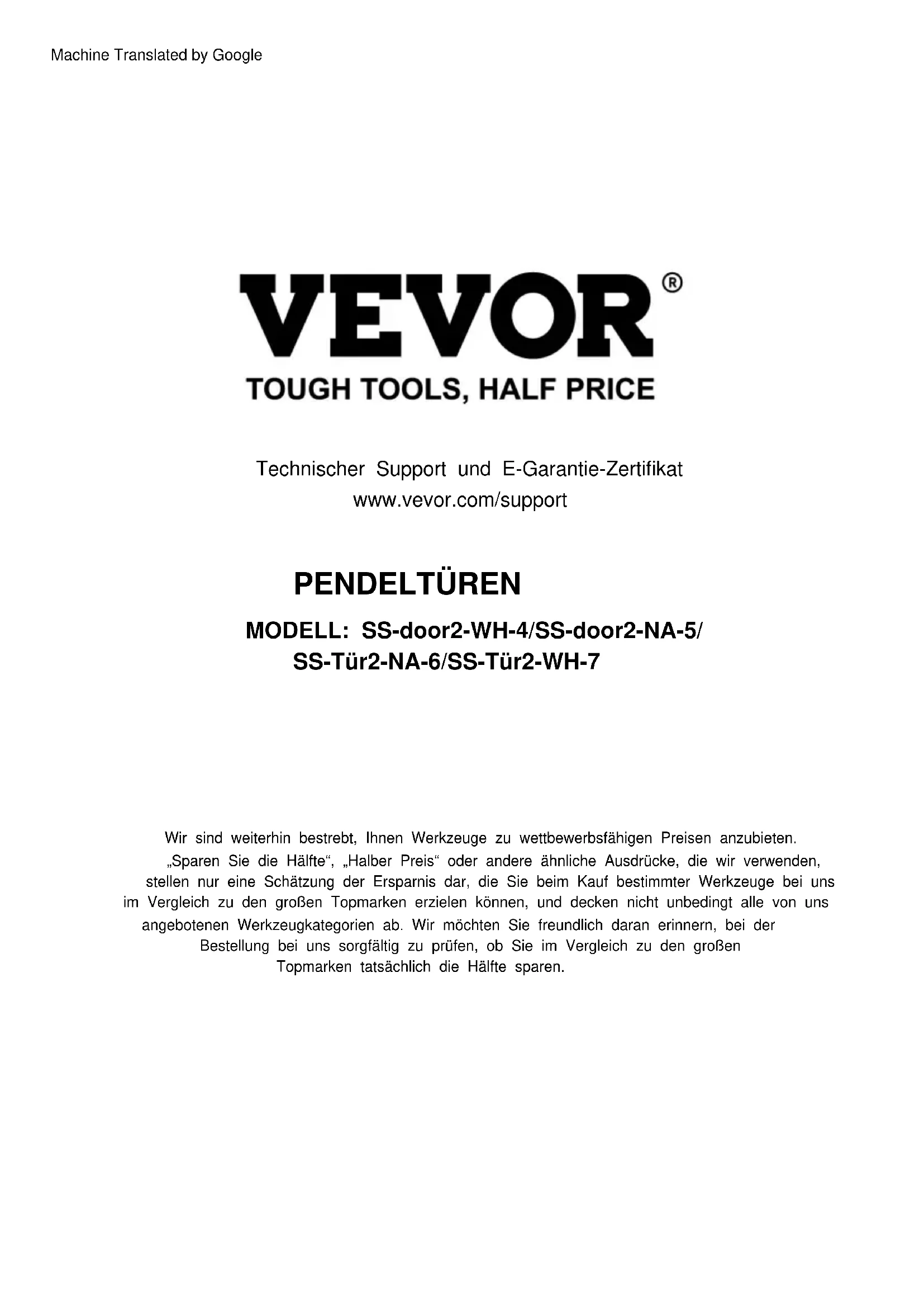 Machine Translated by GoogleAssistancetechniqueetcertificatdegarantie électroniquewww.vevor.com/support Machine Translated by GooglePENDELTÜREN SS-Tür2-NA-6/SS-Tür2-WH-7 MODELL: SS-door2-WH-4/SS-door2-NA-5/ Technischer Support und E-Garantie-Zertifikat www.vevor.com/support „Sparen Sie die Hälfte“, „Halber Preis“ oder andere ähnliche Ausdrücke, die wir verwenden, stellen nur eine Schätzung der Ersparnis dar, die Sie beim Kauf bestimmter Werkzeuge bei uns im Vergleich zu den großen Topmarken erzielen können, und decken nicht unbedingt alle von uns angebotenen Werkzeugkategorien ab. Wir möchten Sie freundlich daran erinnern, bei der Bestellung bei uns sorgfältig zu prüfen, ob Sie im Vergleich zu den großen Topmarken tatsächlich die Hälfte sparen. Wir sind weiterhin bestrebt, Ihnen Werkzeuge zu wettbewerbsfähigen Preisen anzubieten. Machine Translated by GoogleSS-Tür2-WH-7 SS-Tür2-NA-6 SS-Tür2-WH-4 MODELL: SS-Tür2-NA-5 Haben Sie Fragen zum Produkt? Benötigen Sie technischen Support? Bitte kontaktieren Sie uns: Technischer Support und E-Garantie-Zertifikat www.vevor.com/ support Dies ist die Originalanleitung. Bitte lesen Sie alle Anweisungen sorgfältig durch, bevor Sie das Gerät in Betrieb nehmen. VEVOR behält sich eine klare Auslegung unserer Bedienungsanleitung vor. Das Erscheinungsbild des Produkts richtet sich nach dem Produkt, das Sie erhalten haben. Bitte verzeihen Sie uns, dass wir Sie nicht erneut informieren, wenn es Technologie- oder Software-Updates für unser Produkt gibt. Brauchen Sie Hilfe? Kontaktieren Sie uns! PENDELTÜREN