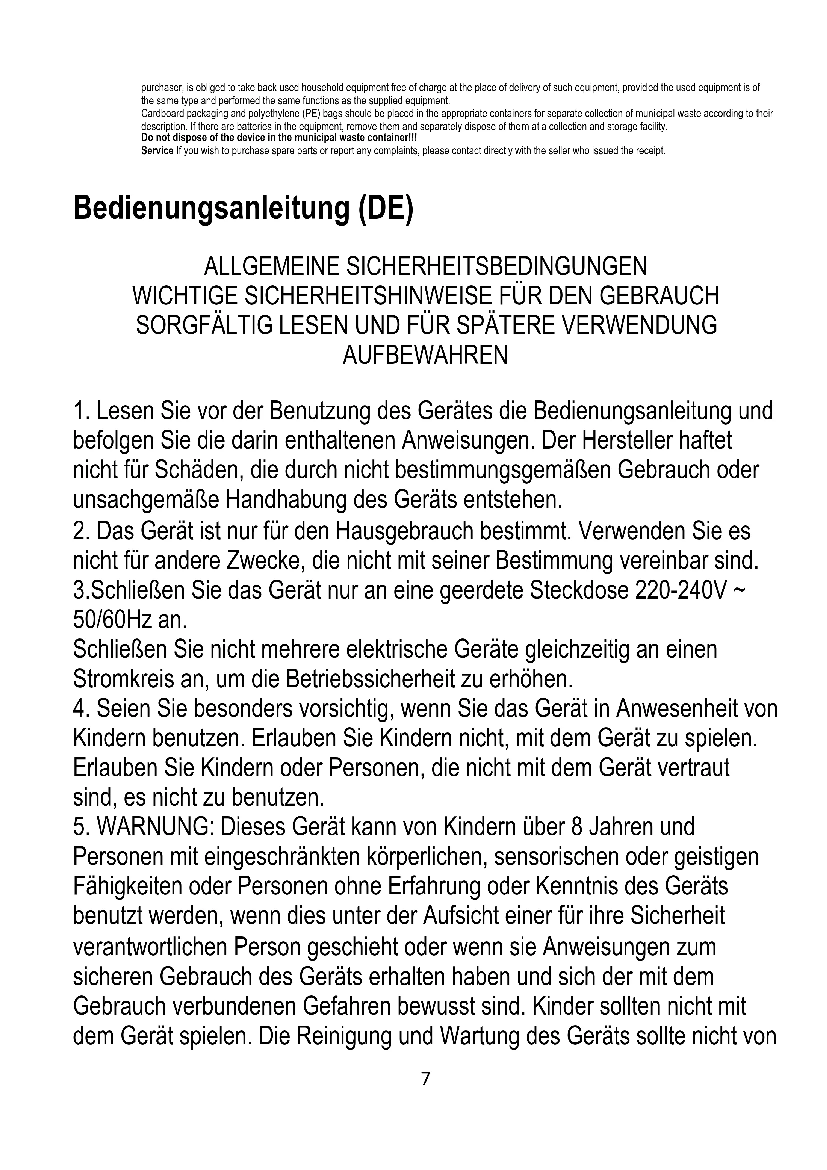 5. WARNUNG: Dieses Gerät kann von Kindern über 8 Jahren und
