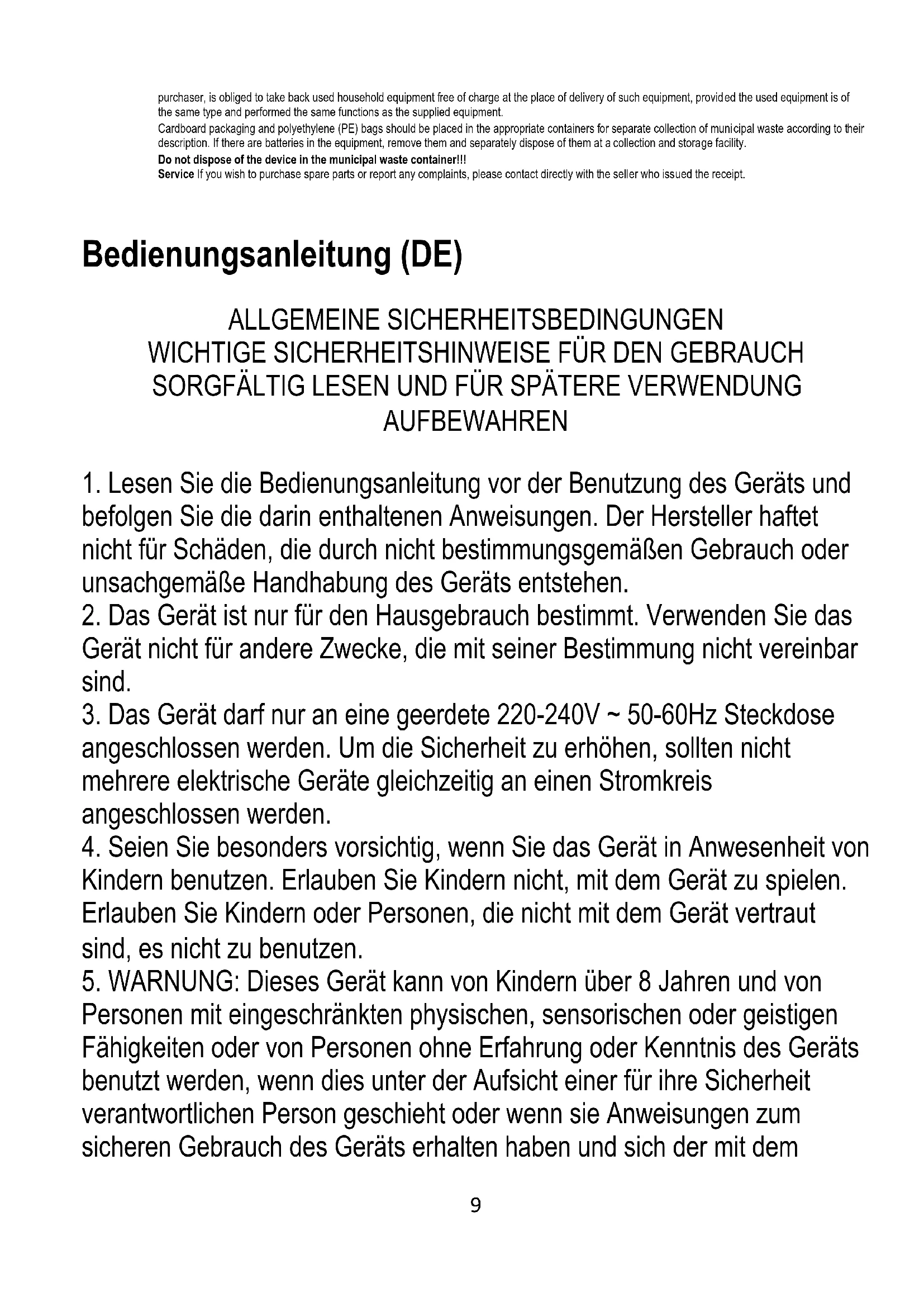 Personen mit eingeschränkten physischen, sensorischen oder geistigen Fähigkeiten oder von Personen ohne Erfahrung oder Kenntnis des Geräts benutzt werden, wenn dies unter der Aufsicht einer für ihre Sicherheit verantwortlichen Person geschieht oder wenn sie Anweisungen zum sicheren Gebrauch des Geräts erhalten haben und sich der mit dem10 Gebrauch verbundenen Gefahren bewusst sind. Kinder sollten nicht mit dem Gerät spielen. Die Reinigung und Wartung des Geräts sollte nicht von Kindern durchgeführt werden, es sei denn, sie sind älter als 8 Jahre und die Tätigkeit wird unter Aufsicht durchgeführt.