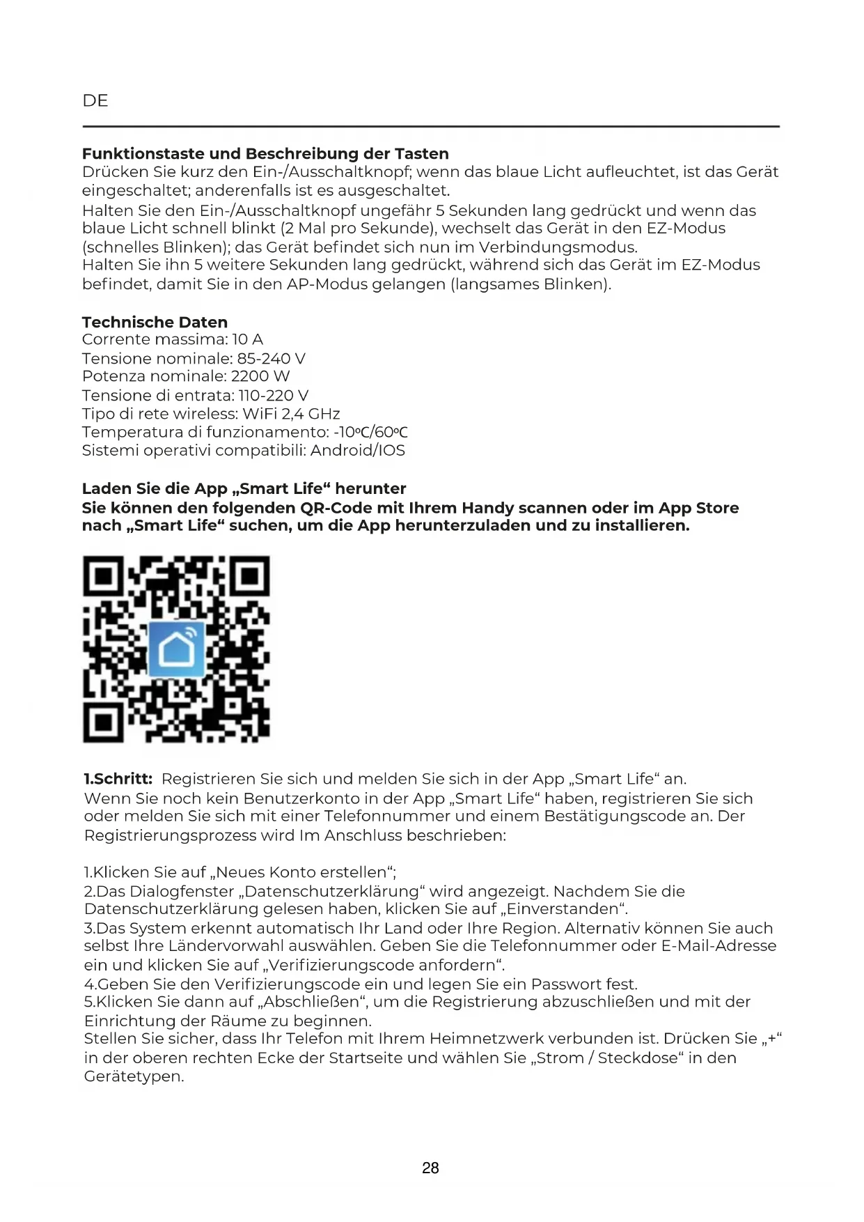 CATEGORIA Prixton EW10 Wifi Plug Home 27DE 1.Schritt: Registrieren Sie sich und melden Sie sich in der App „Smart Life“ an. Wenn Sie noch kein Benutzerkonto in der App „Smart Life“ haben, registrieren Sie sich oder melden Sie sich mit einer Telefonnummer und einem Bestätigungscode an. Der Registrierungsprozess wird Im Anschluss beschrieben: 1.Klicken Sie auf „Neues Konto erstellen“; 2.Das Dialogfenster „Datenschutzerklärung“ wird angezeigt. Nachdem Sie die Datenschutzerklärung gelesen haben, klicken Sie auf „Einverstanden“. 3.Das System erkennt automatisch Ihr Land oder Ihre Region. Alternativ können Sie auch selbst Ihre Ländervorwahl auswählen. Geben Sie die Telefonnummer oder E-Mail-Adresse ein und klicken Sie auf „Verifizierungscode anfordern“. 4.Geben Sie den Verifizierungscode ein und legen Sie ein Passwort fest. 5.Klicken Sie dann auf „Abschließen“, um die Registrierung abzuschließen und mit der Einrichtung der Räume zu beginnen. Stellen Sie sicher, dass Ihr Telefon mit Ihrem Heimnetzwerk verbunden ist. Drücken Sie „+“ in der oberen rechten Ecke der Startseite und wählen Sie „Strom / Steckdose“ in den Gerätetypen. Funktionstaste und Beschreibung der Tasten Drücken Sie kurz den Ein-/Ausschaltknopf; wenn das blaue Licht aufleuchtet, ist das Gerät eingeschaltet; anderenfalls ist es ausgeschaltet. Halten Sie den Ein-/Ausschaltknopf ungefähr 5 Sekunden lang gedrückt und wenn das blaue Licht schnell blinkt (2 Mal pro Sekunde), wechselt das Gerät in den EZ-Modus (schnelles Blinken); das Gerät befindet sich nun im Verbindungsmodus. Halten Sie ihn 5 weitere Sekunden lang gedrückt, während sich das Gerät im EZ-Modus befindet, damit Sie in den AP-Modus gelangen (langsames Blinken). Technische Daten Corrente massima: 10 A Tensione nominale: 85-240 V Potenza nominale: 2200 W Tensione di entrata: 110-220 V Tipo di rete wireless: WiFi 2,4 GHz Temperatura di funzionamento: -10ºC/60ºC Sistemi operativi compatibili: Android/IOS Laden Sie die App „Smart Life“ herunter Sie können den folgenden QR-Code mit Ihrem Handy scannen oder im App Store nach „Smart Life“ suchen, um die App herunterzuladen und zu installieren.