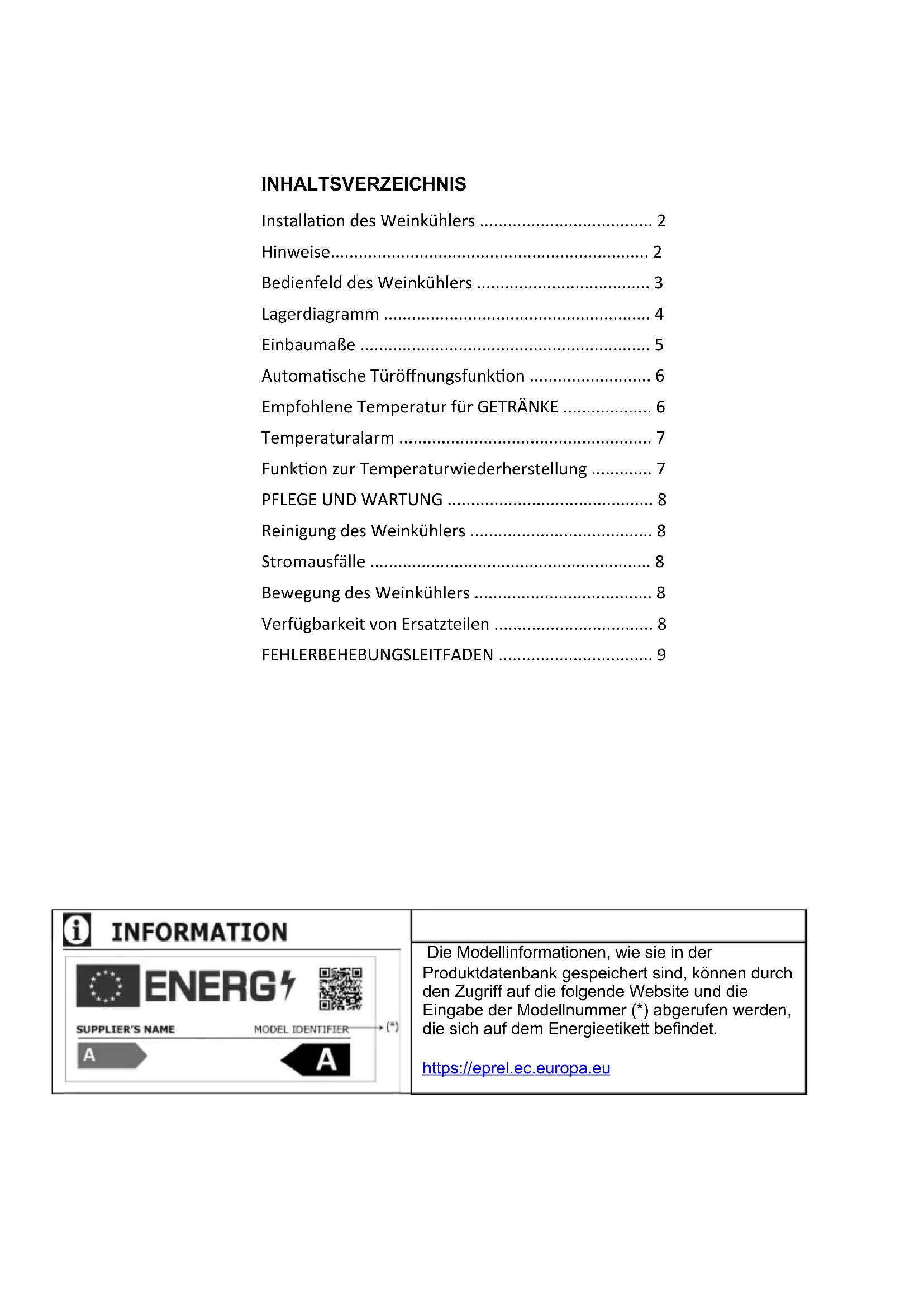 Die Modellinformationen, wie sie in der Produktdatenbank gespeichert sind, können durch den Zugriff auf die folgende Website und die Eingabe der Modellnummer (*) abgerufen werden, die sich auf dem Energieetikett befindet. https://eprel.ec.europa.euFür umfassenden Support registrieren Sie bitte Ihr Produkt unter www.register10.eu Installation des Weinkühlers Dieses Gerät ist so konzipiert, dass es als Einbaugerät (vollständig eingebaut) installiert wird (siehe den Standortaufkleber auf der Rückseite des Geräts). Die Reversibilität der Tür ist nicht vorgesehen. Versuchen Sie nicht, die Tür umzudrehen. Dieses Gerät ist ausschließlich für die Lagerung von Wein bestimmt. Stellen Sie den Weinkühler auf einen Boden, der stark genug ist, um das Gerät im vollständig beladenen Zustand zu tragen. Um den Weinkühler in eine gerade Position zu bringen, stellen Sie den vorderen Nivellierfuß an der Unterseite des Weinkühlers ein. Platzieren Sie den Weinkühler fern von direktem Sonnenlicht und Wärmequellen (Herd, Heizgeräte, Heizkörper usw.). Direktes Sonnenlicht kann die Acrylbeschichtung beeinträchtigen, und Wärmequellen können den Stromverbrauch erhöhen. Außerdem können extrem niedrige Umgebungstemperaturen und feuchte Bereiche zu einer Fehlfunktion des Geräts führen. Schließen Sie den Weinkühler an eine ordnungsgemäß installierte, geerdete Steckdose an. Bei Fragen zur Stromversorgung und/oder Erdung wenden Sie sich bitte an einen zugelassenen Elektriker oder ein autorisiertes Servicezentrum. Hinweise Lagern Sie Wein in versiegelten Flaschen; Vermeiden Sie eine Überladung des Geräts Öffnen Sie die Tür nur, wenn es notwendig ist; Das lange Offenlassen der Tür kann zu einem erheblichen Temperaturanstieg in den Gerätekammern führen. Reinigen Sie regelmäßig die Oberflächen, die mit Flaschen in Kontakt kommen könnten, sowie die zugänglichen Ablaufsysteme. Wenn das Kühlgerät für längere Zeit leer bleibt, empfehlen wir, es auszuschalten, abzutauen, zu reinigen, zu trocknen und die Tür offen zu lassen, um Schimmelbildung im Inneren zu vermeiden. Decken Sie die Regale nicht mit Aluminiumfolie oder anderen Materialien ab, die die Luftzirkulation behindern könnten; Wenn der Weinkühler über einen längeren Zeitraum nicht genutzt wird, wird empfohlen, nach gründlicher Reinigung die Tür leicht geöffnet zu lassen, damit Luft im Gerät zirkulieren kann, um Kondenswasser, Schimmel oder Geruchsbildung zu vermeiden. Dieses Produkt enthält eine Lichtquelle der Energieeffizienzklasse G 02 | DEBedienfeld des Weinkühlers