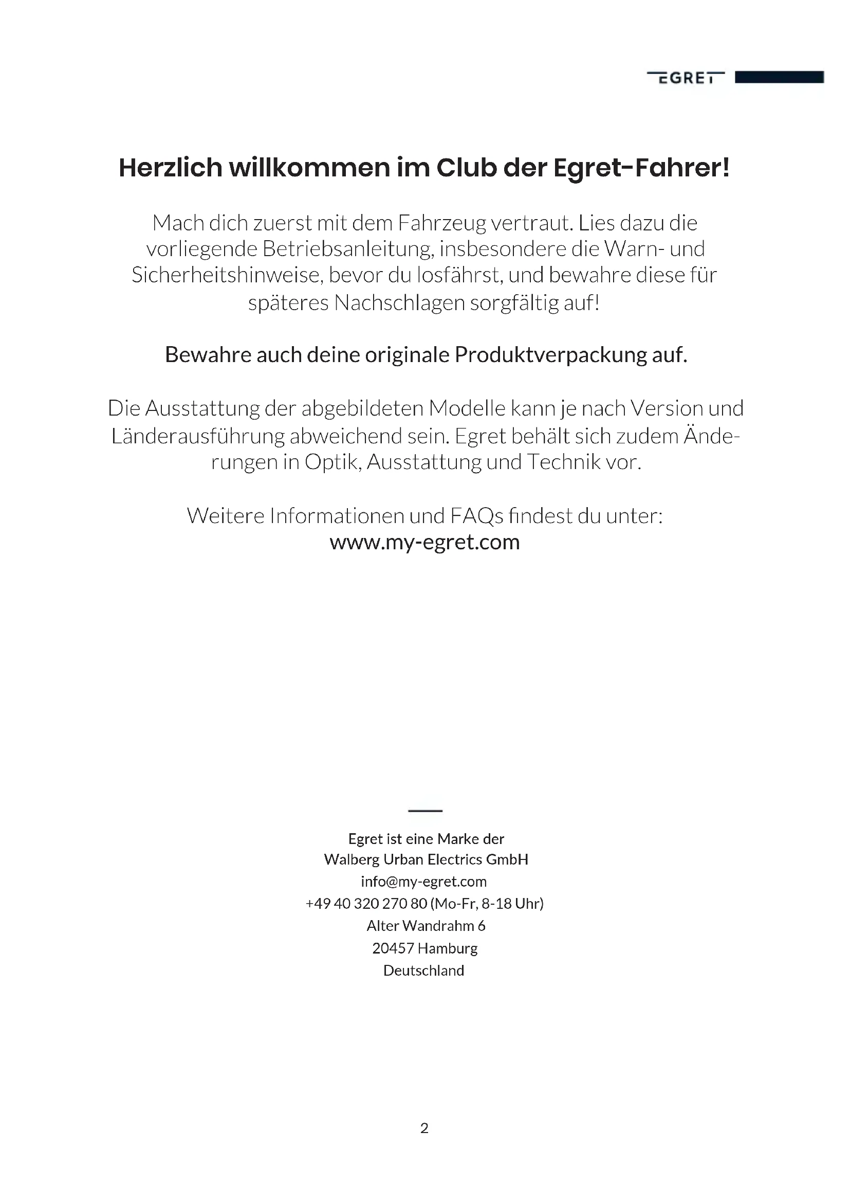 Egret X Original-Betriebsanleitung Operating instructions Consignes d`utilisation2 Herzlich willkommen im Club der Egret-Fahrer! Mach dich zuerst mit dem Fahrzeug vertraut. Lies dazu die vorliegende Betriebsanleitung, insbesondere die Warn- und Sicherheitshinweise, bevor du losfährst, und bewahre diese für späteres Nachschlagen sorgfältig auf! Bewahre auch deine originale Produktverpackung auf. Die Ausstattung der abgebildeten Modelle kann je nach Version und Länderausführung abweichend sein. Egret behält sich zudem Ände- rungen in Optik, Ausstattung und Technik vor. Weitere Informationen und FAQs ndest du unter: www.my-egret.com Egret ist eine Marke der Walberg Urban Electrics GmbH info@my-egret.com +49 40 320 270 80 (Mo-Fr, 8-18 Uhr) Alter Wandrahm 6 20457 Hamburg Deutschland3 DEUTSCH (Originalsprache) 02-28 ENGLISH (Translation) 29-58 FRANCAIS (Traduction) 59-87 Inhalt Lieferumfang und Bestandteile 04 Vor Inbetriebnahme beachten 05 Vor der (ersten) Fahrt 06 Warn- und Sicherheitshinweise 07-08 Allgemeine Hinweise/Umwelthinweise 08-09 Montageanleitung 10-11 Bedienung 12-25